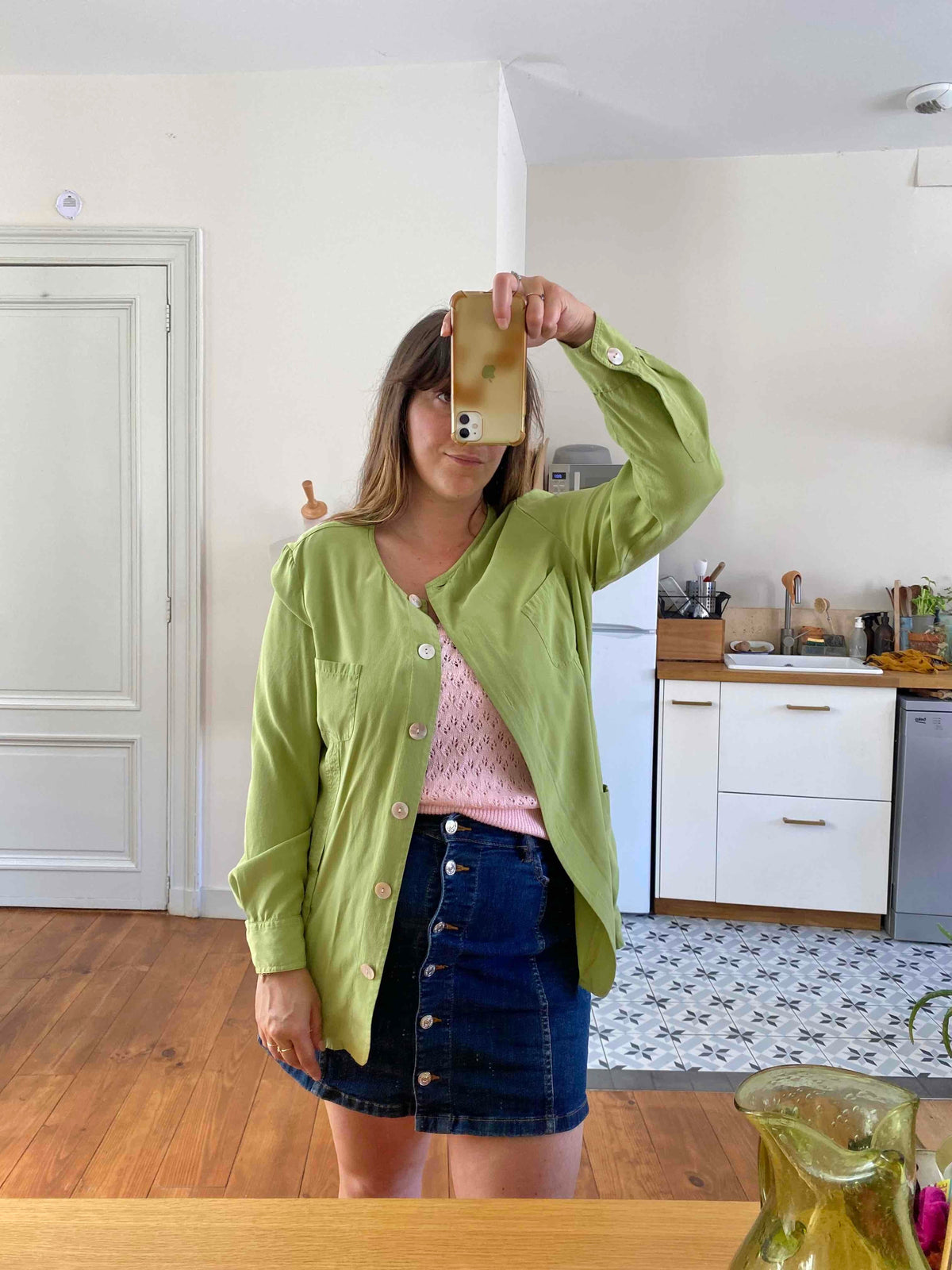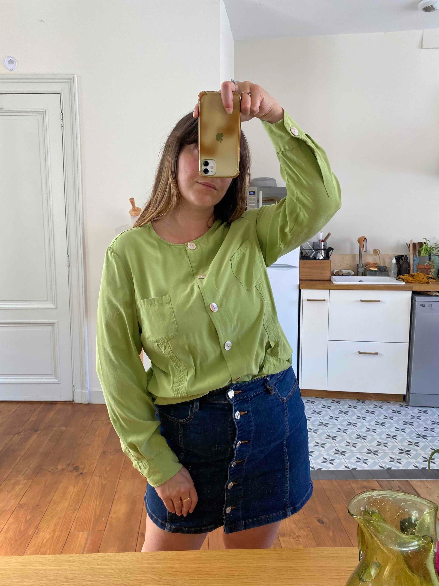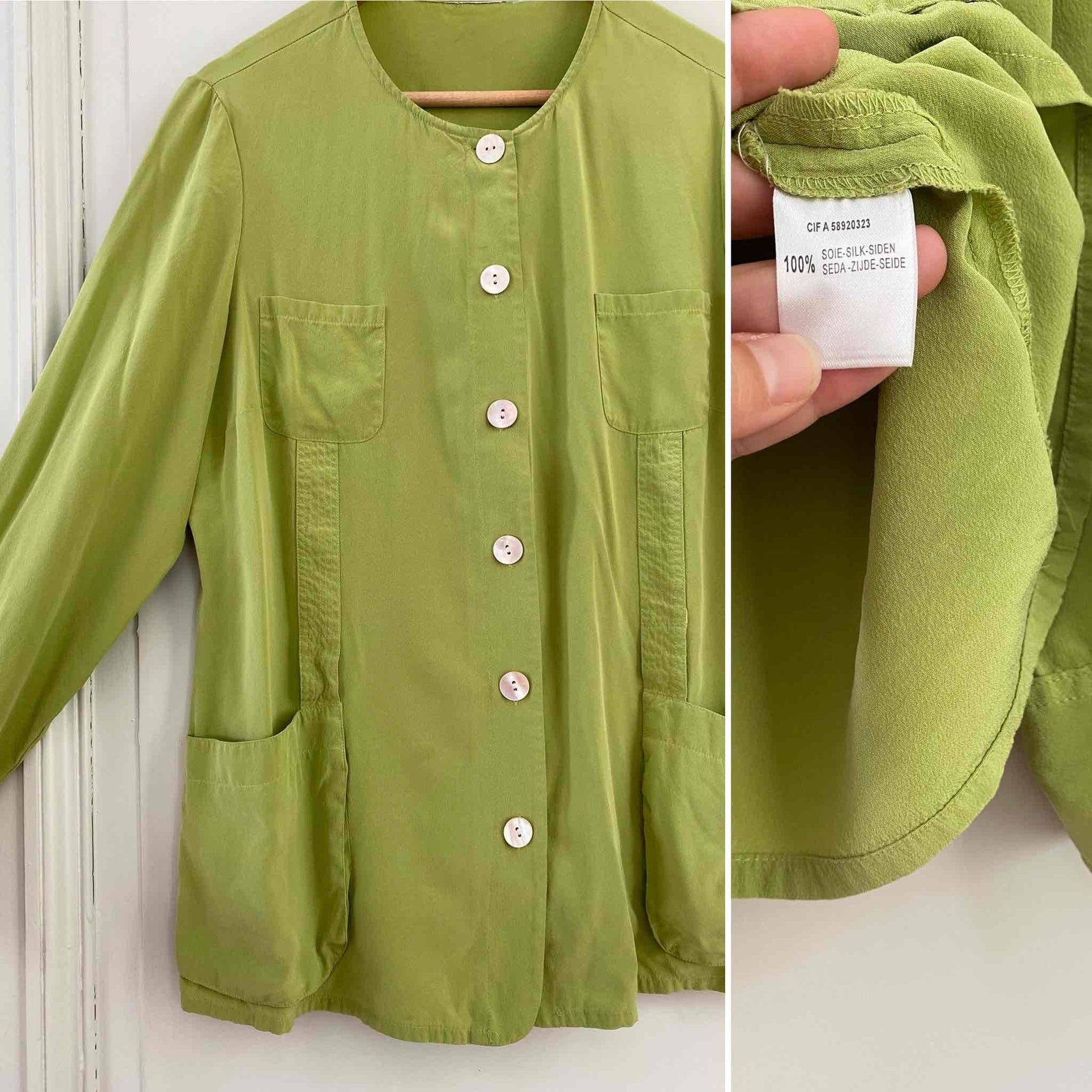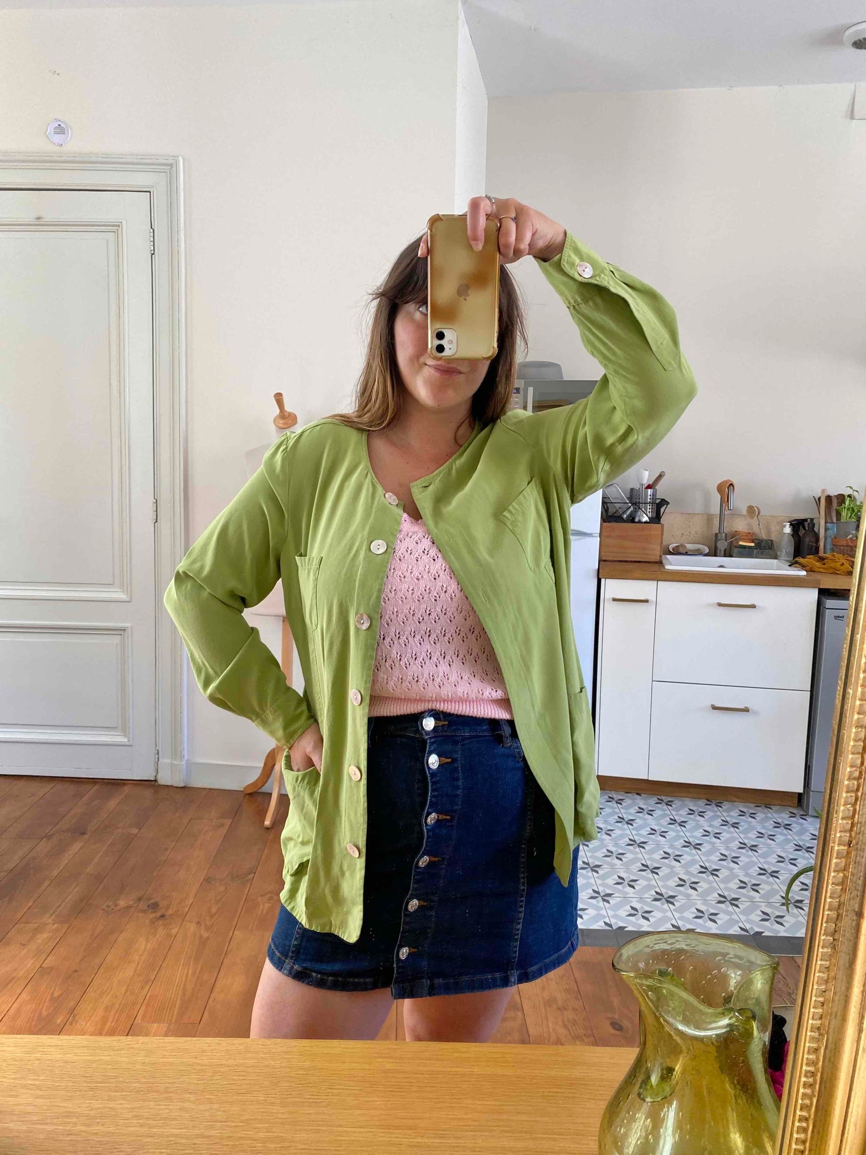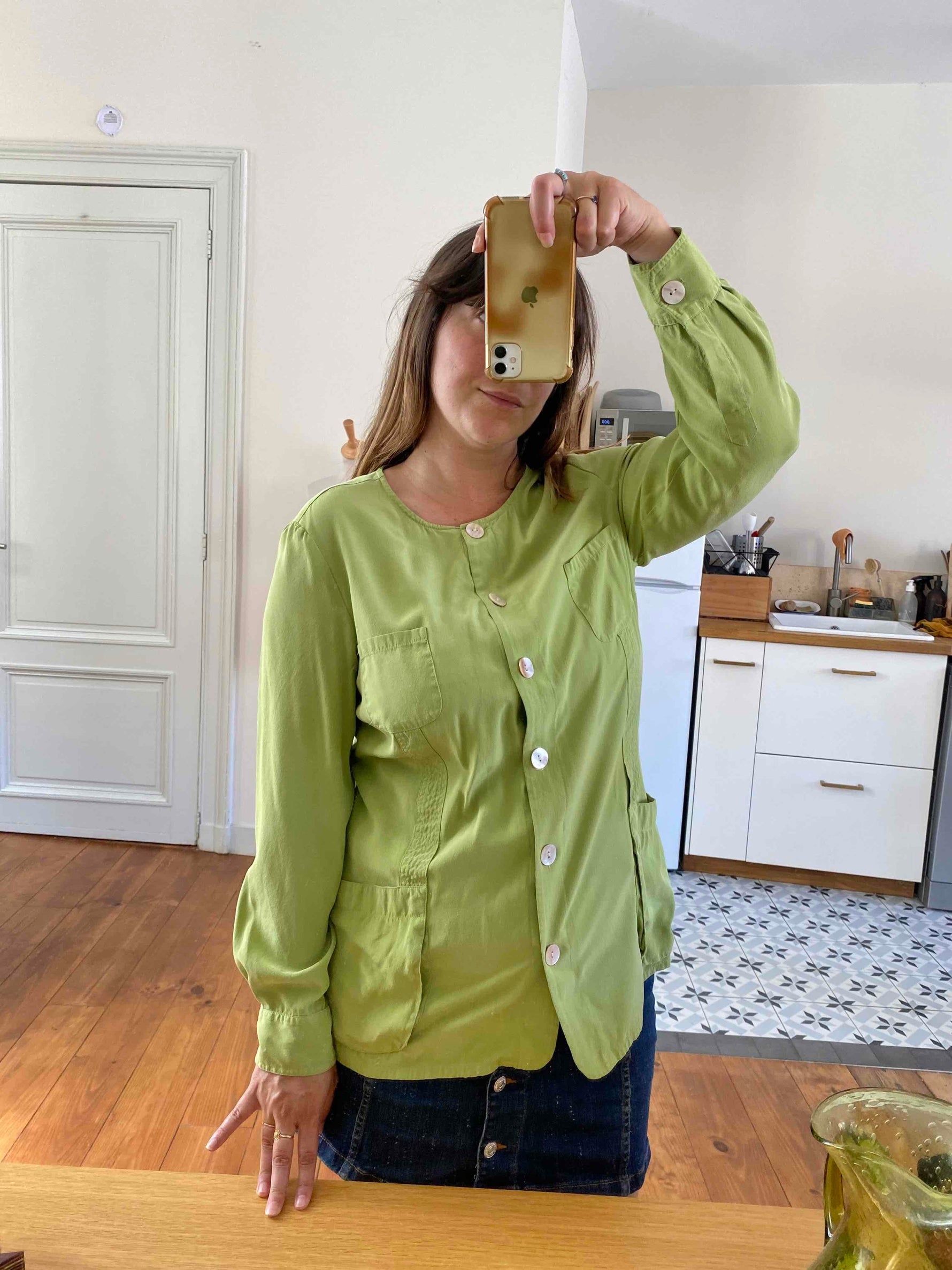 Veste en soie vert pomme, à porter en veste légère, sur-chemise, ou blouse, poches poitrines et bas, boutons nacres, manches ballons poignets boutonnés, taille 40 portée ici sur une personne T40.