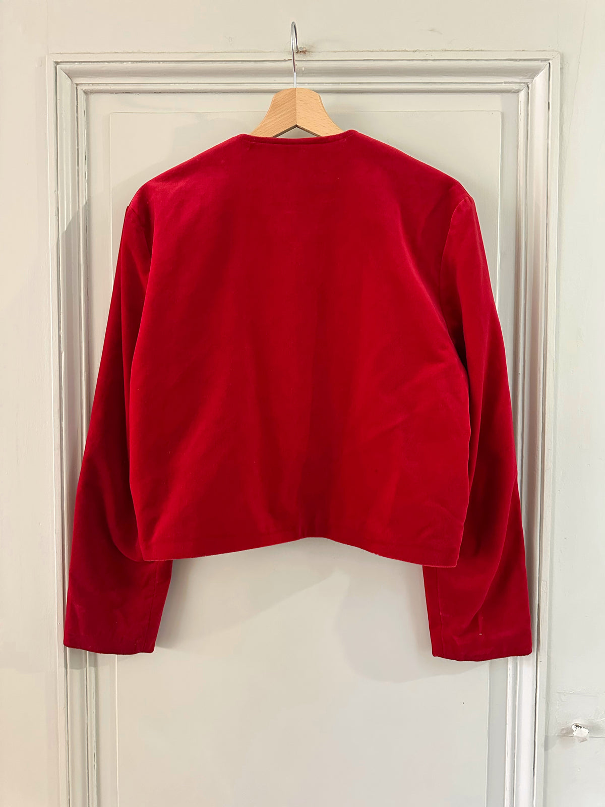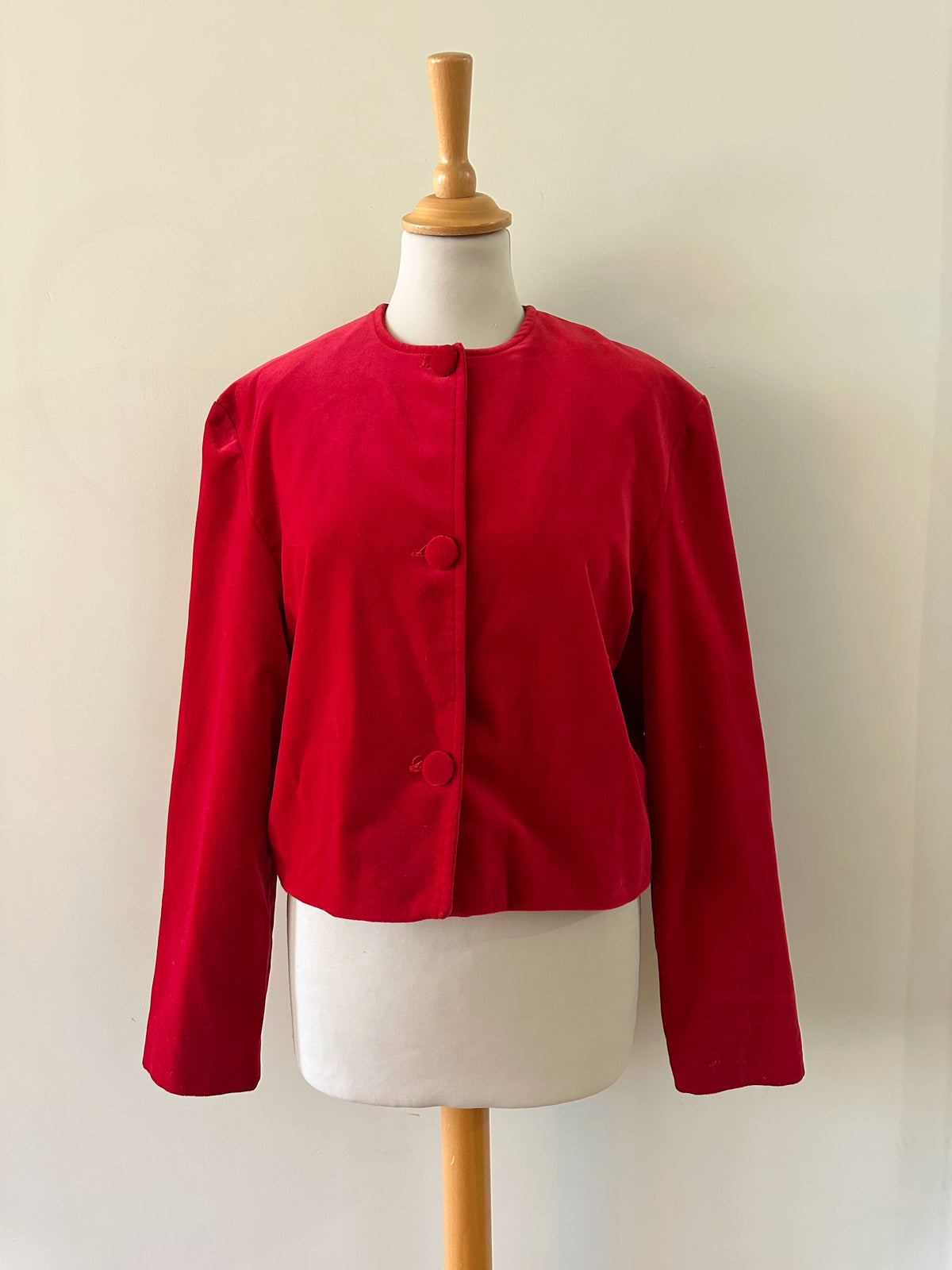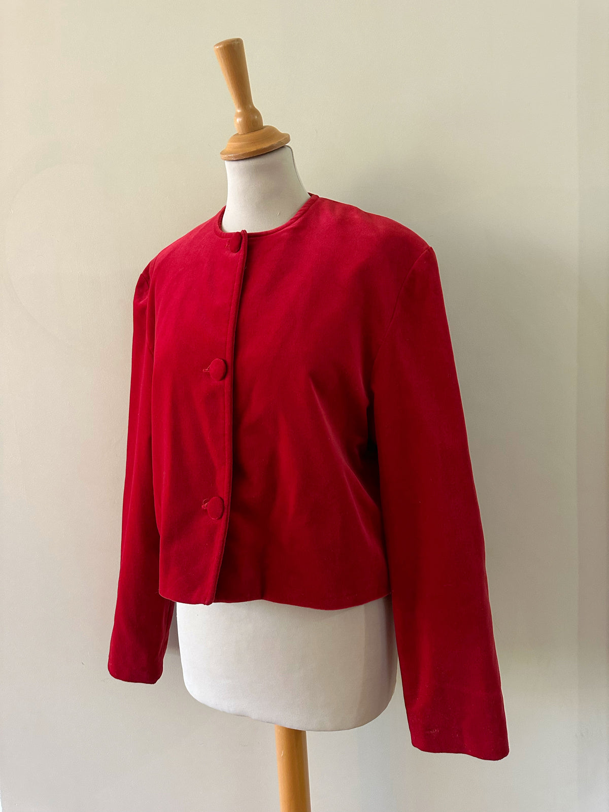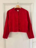 Veste en velours rouge, velours de coton, forme cropped à gros boutons recouverts, fabriqué en France. Taille 36 porté ici sur un mannequin T36. Epaules 36cm Aisselles 45cm Longueur 54cm.