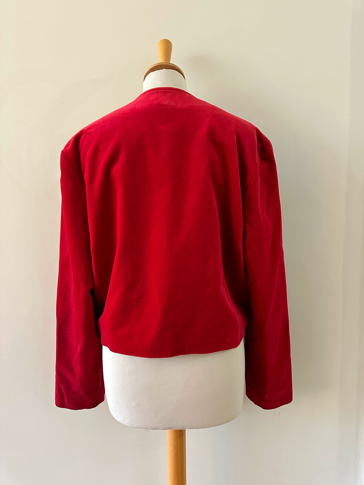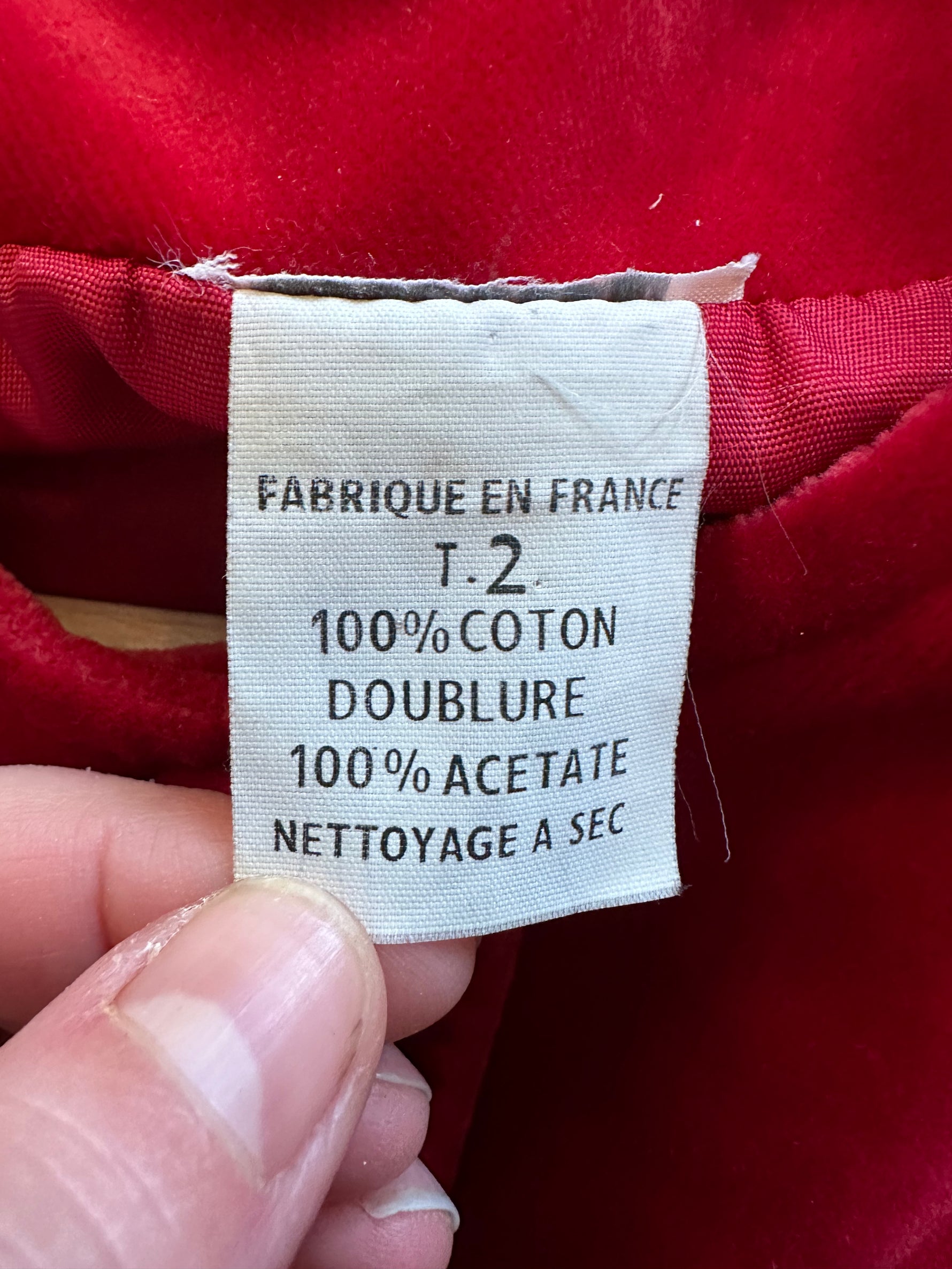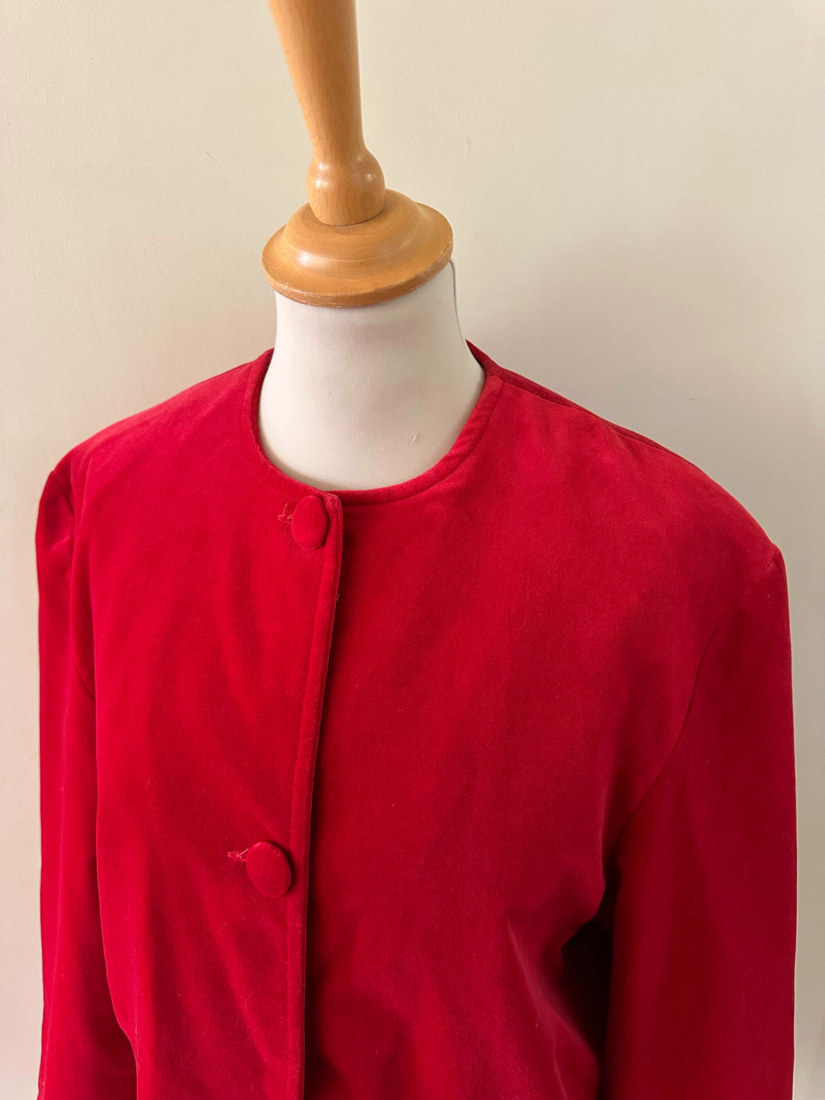 Veste en velours rouge, velours de coton, forme cropped à gros boutons recouverts, fabriqué en France. Taille 36 porté ici sur un mannequin T36. Epaules 36cm Aisselles 45cm Longueur 54cm.