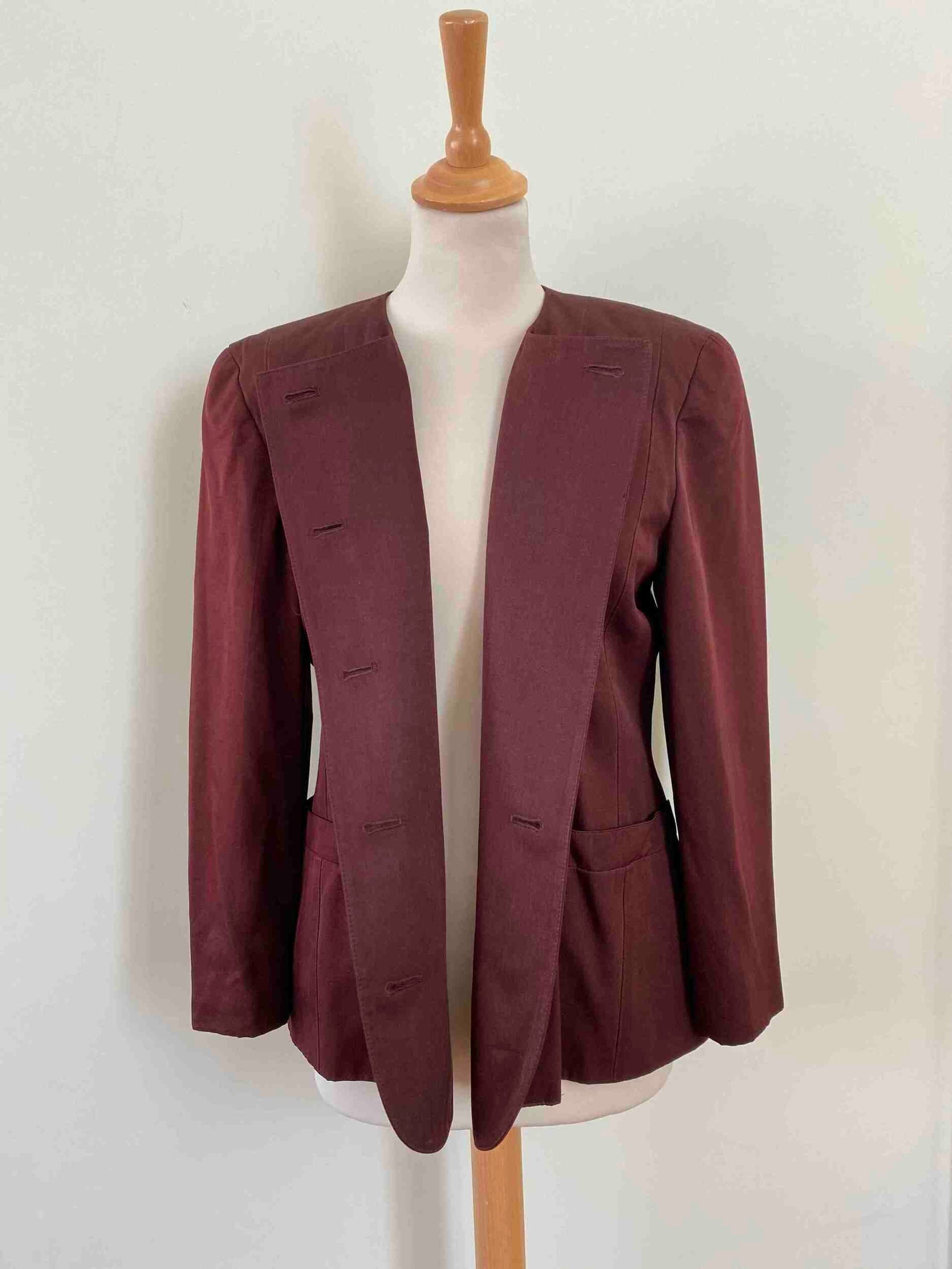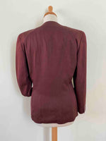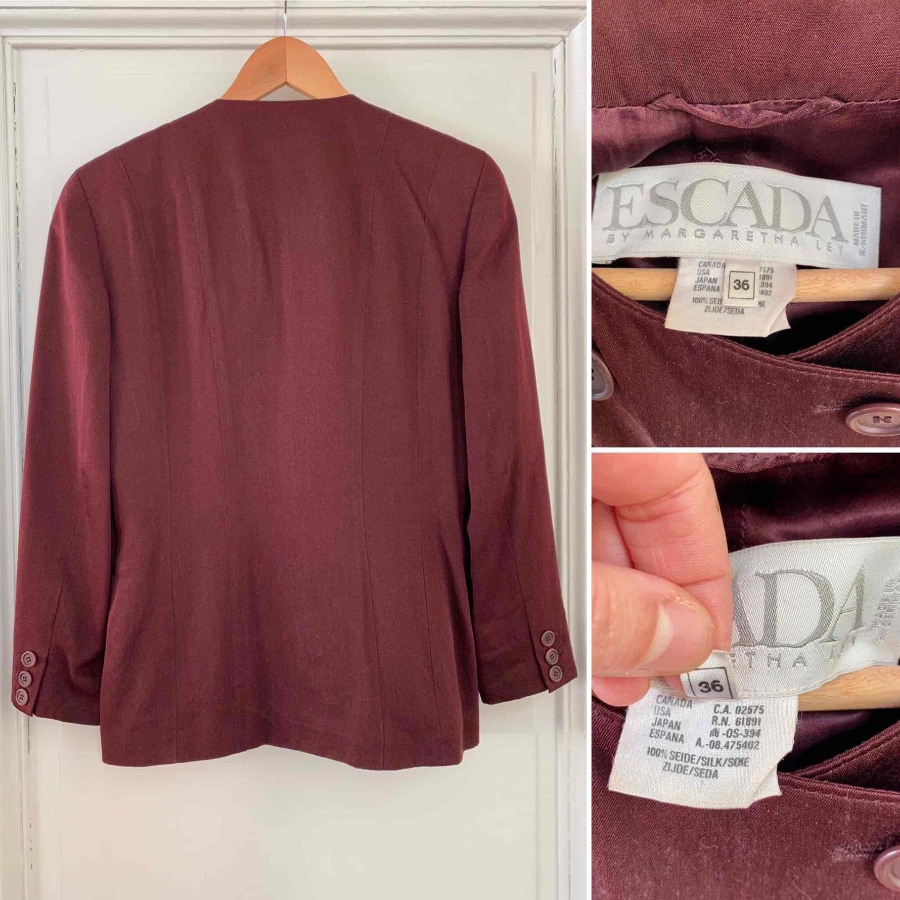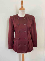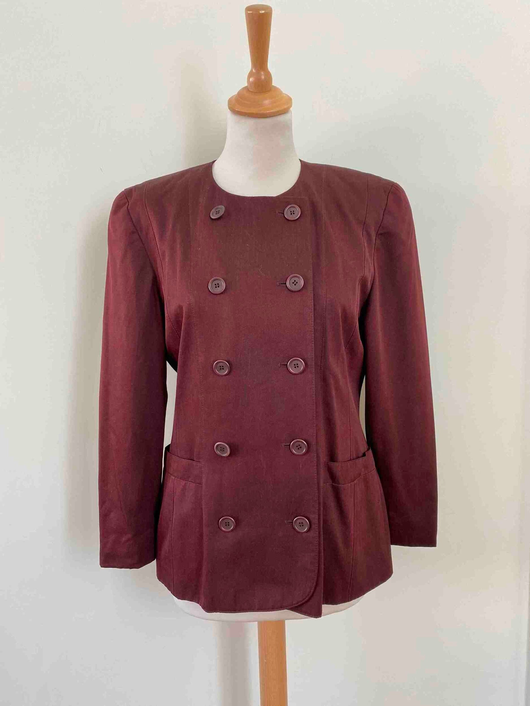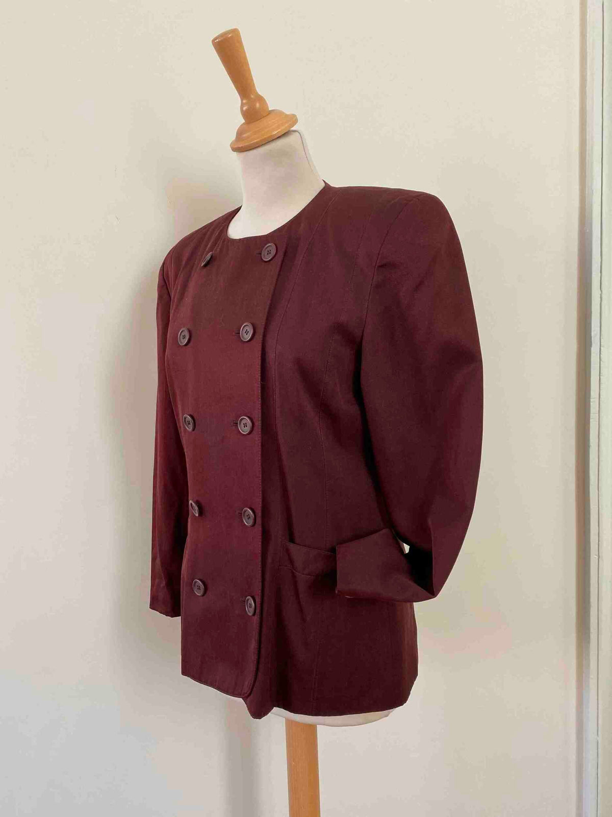 Blazer en Soie Escada, chocolat reflets bordeaux, boutonnage croisé, col rond, poches côtés, avec épaulettes rembourrées, fabriqué en West Germany.
