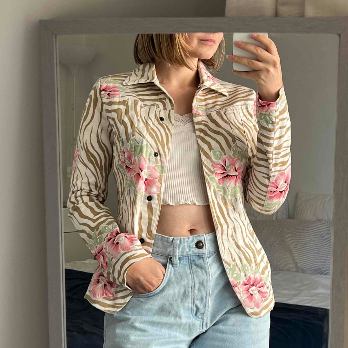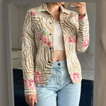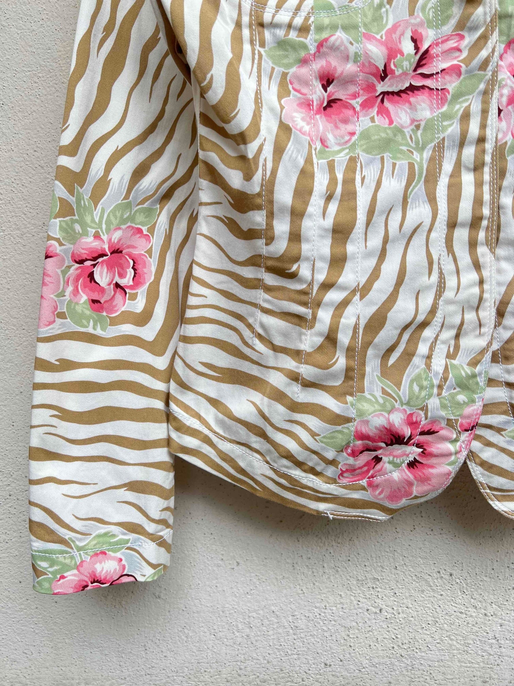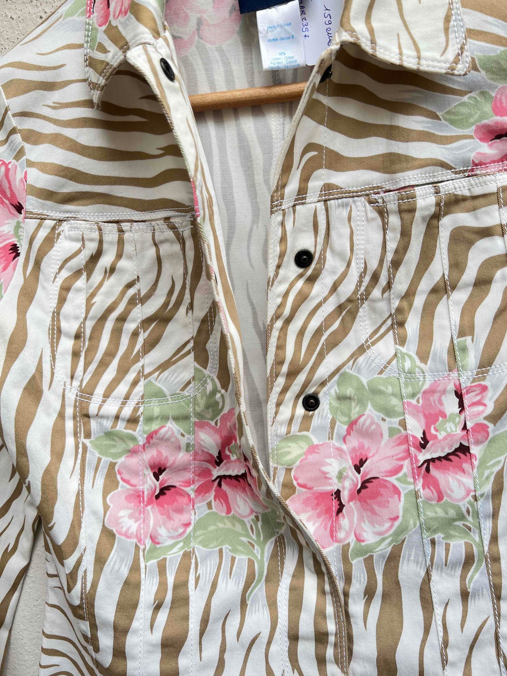 Prix unitaire parVeste en coton de la marque Kenzo Jeans. Coton stretch. Blanche avec un motif tigré beige et des fleurs roses pastel. Fermetures par des pressions
