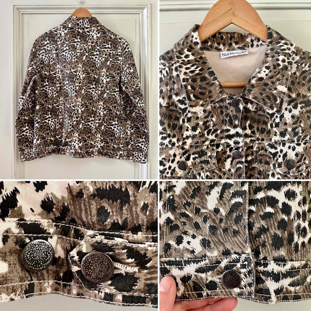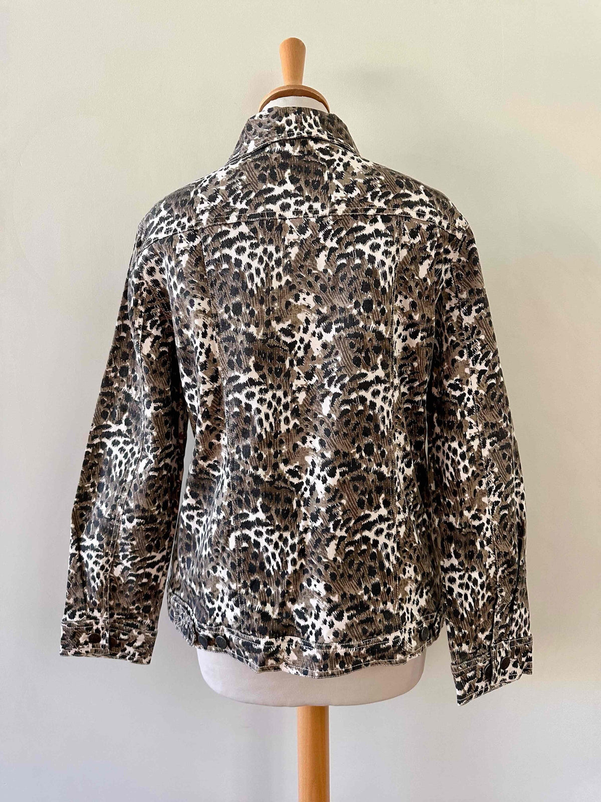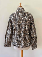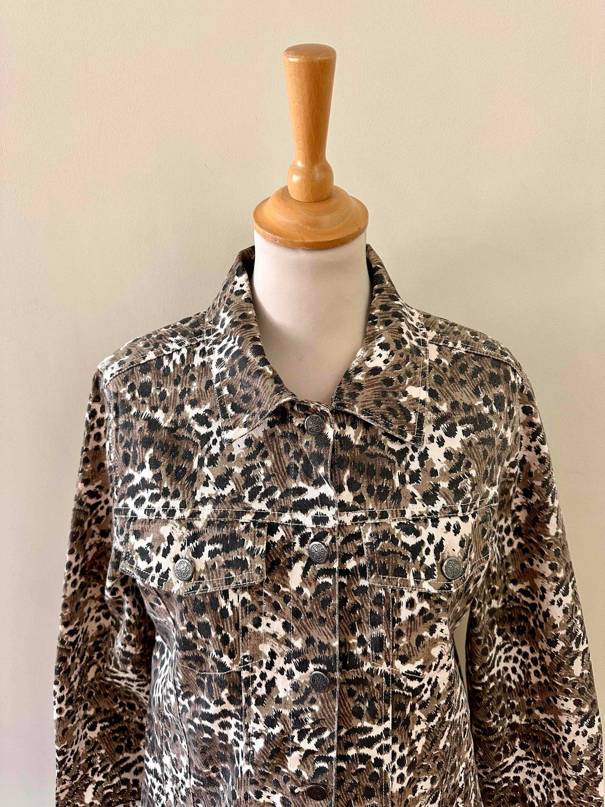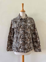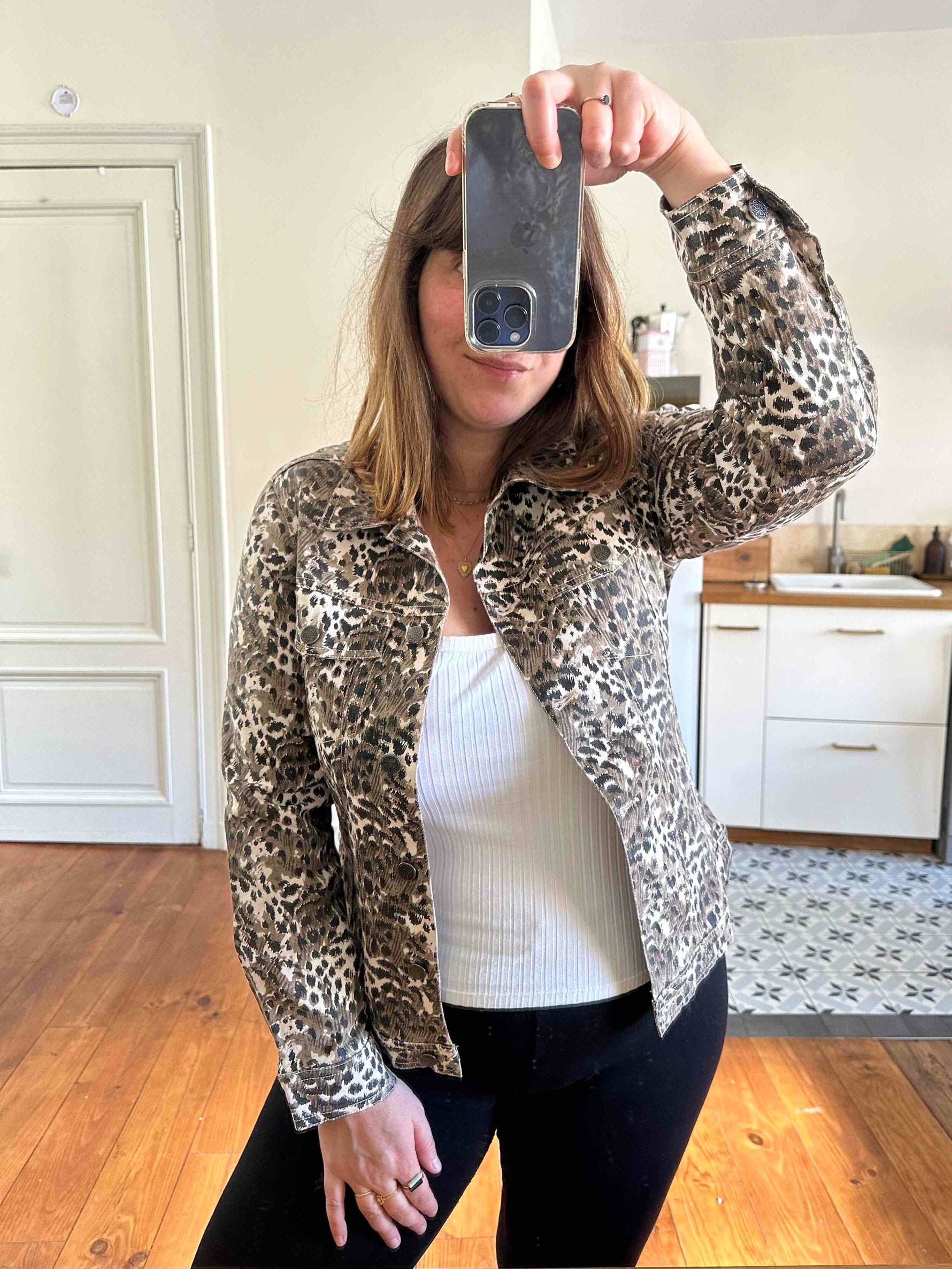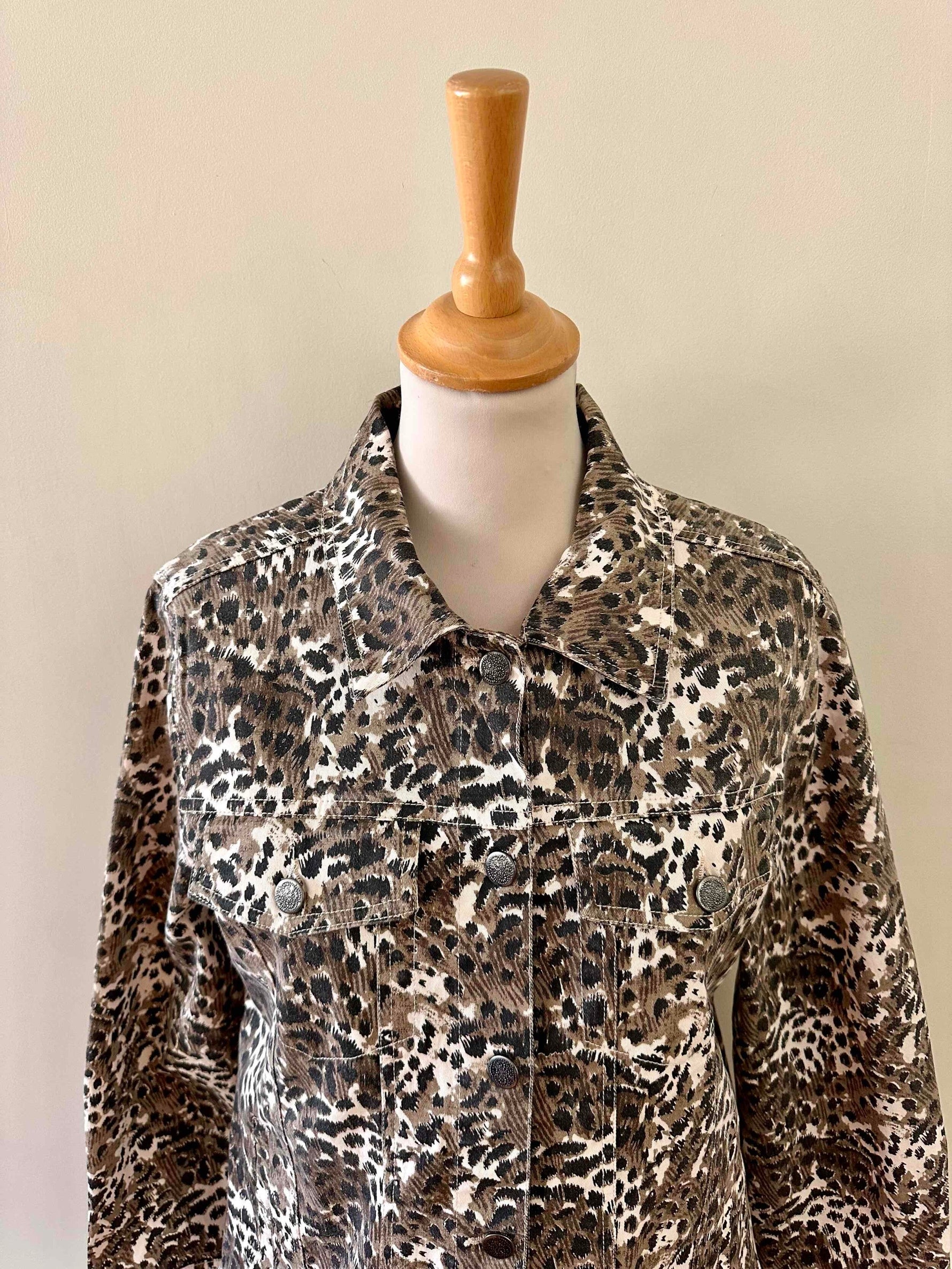 Prix unitaire parVeste léopard en jeans, coton denim imprimé léopard écru, beige, marron et noir, boutons jeans en métal fleuri, années 90s, taille 36 portée ici sur un mannequin T36 et ouverte sur une personne T40.
