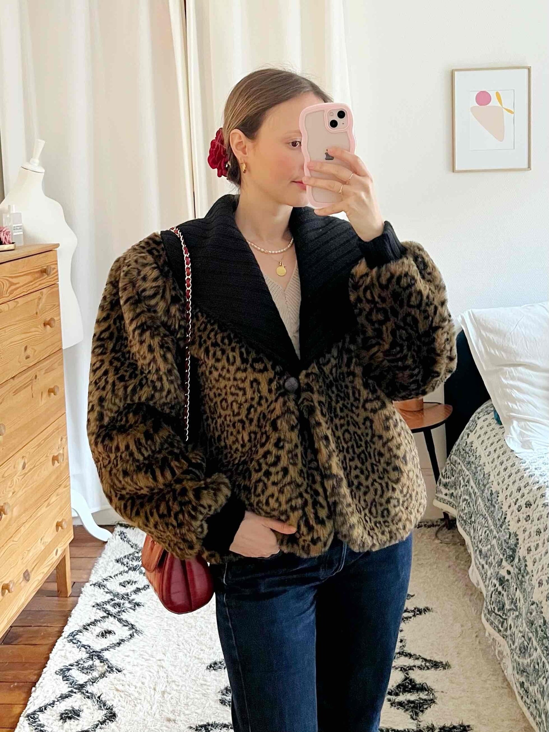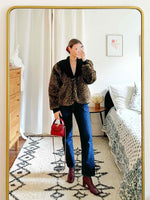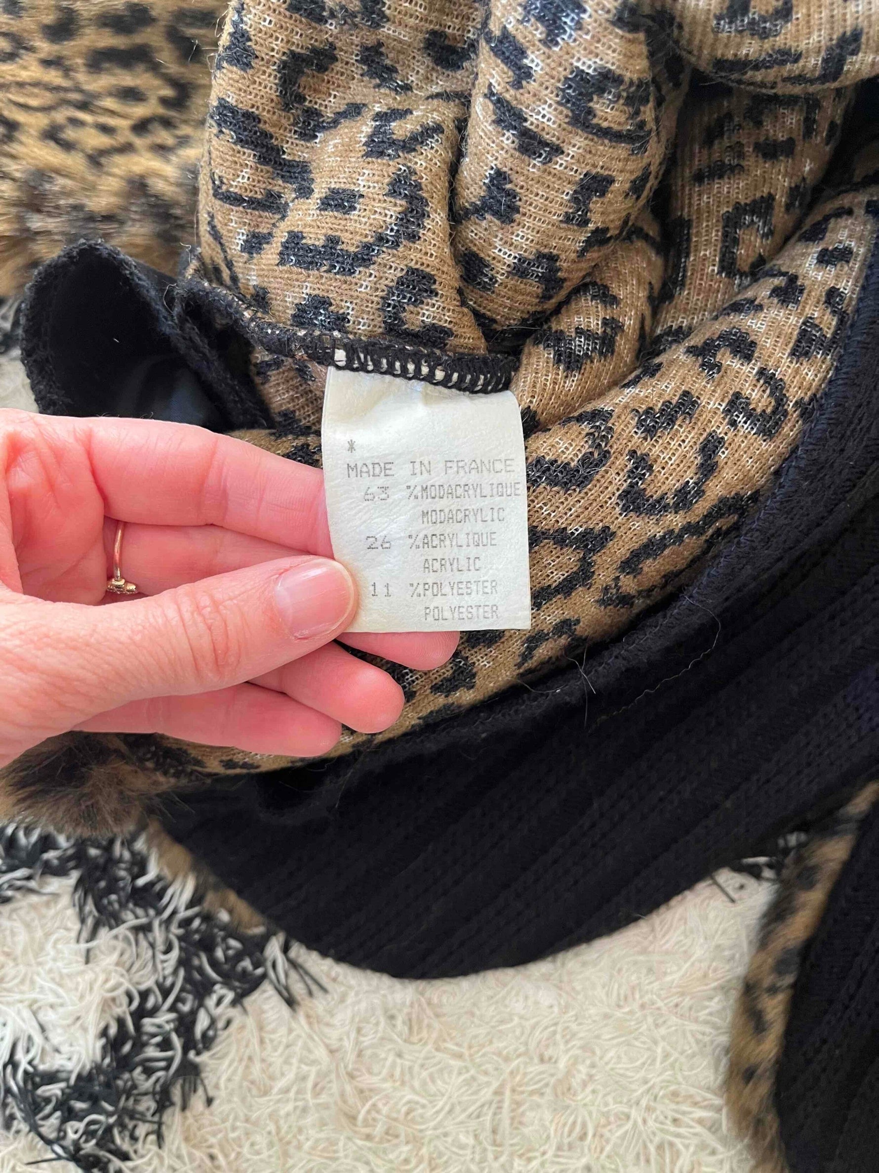 Prix unitaire parVeste léopard en fausse fourrure, col en V en maille noire, un gros bouton sur le devant, fabriqué en France. Porté ici de façon oversize par une T36 pour 1m64