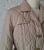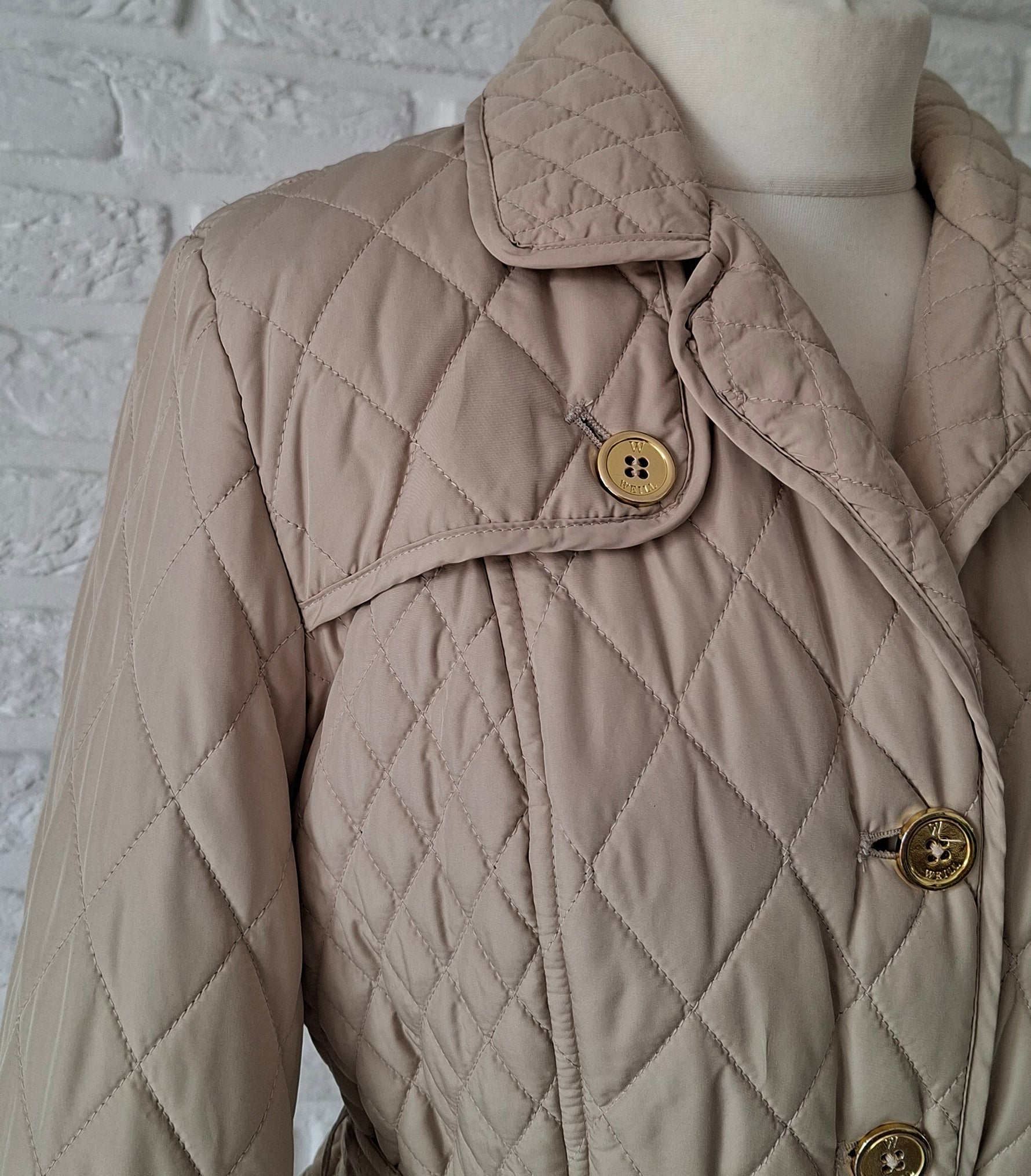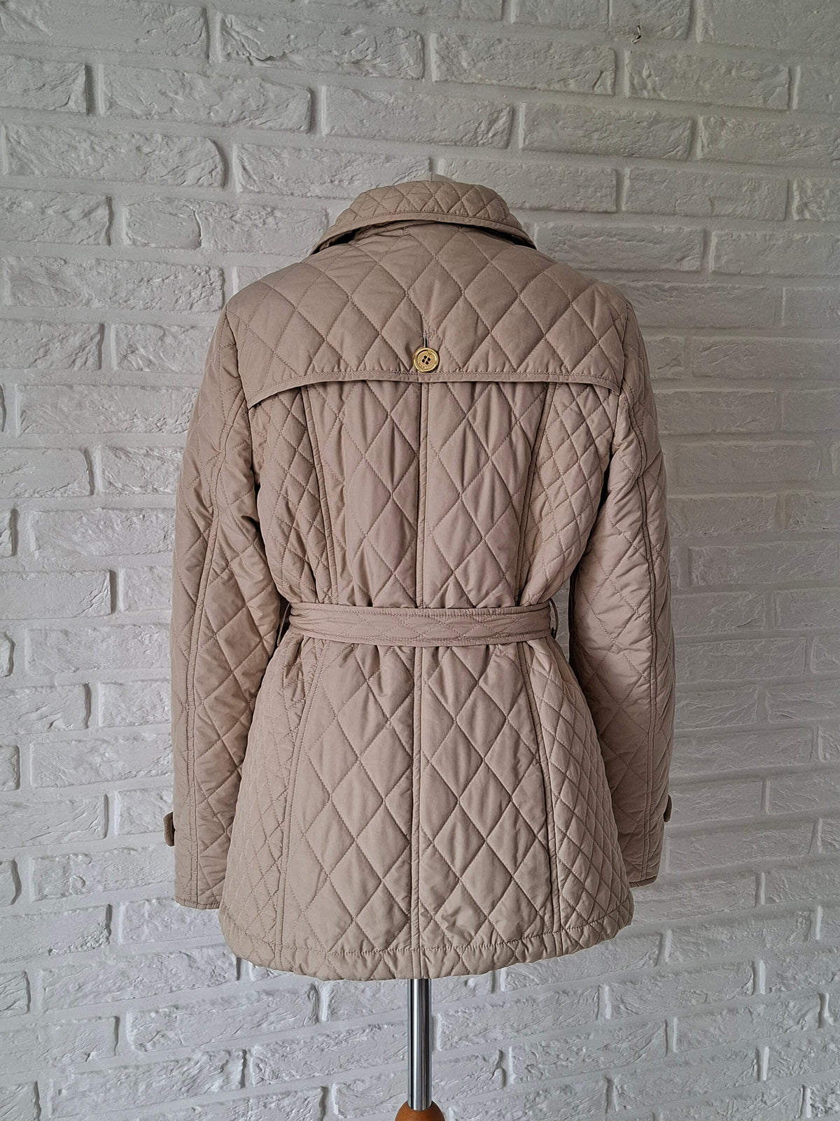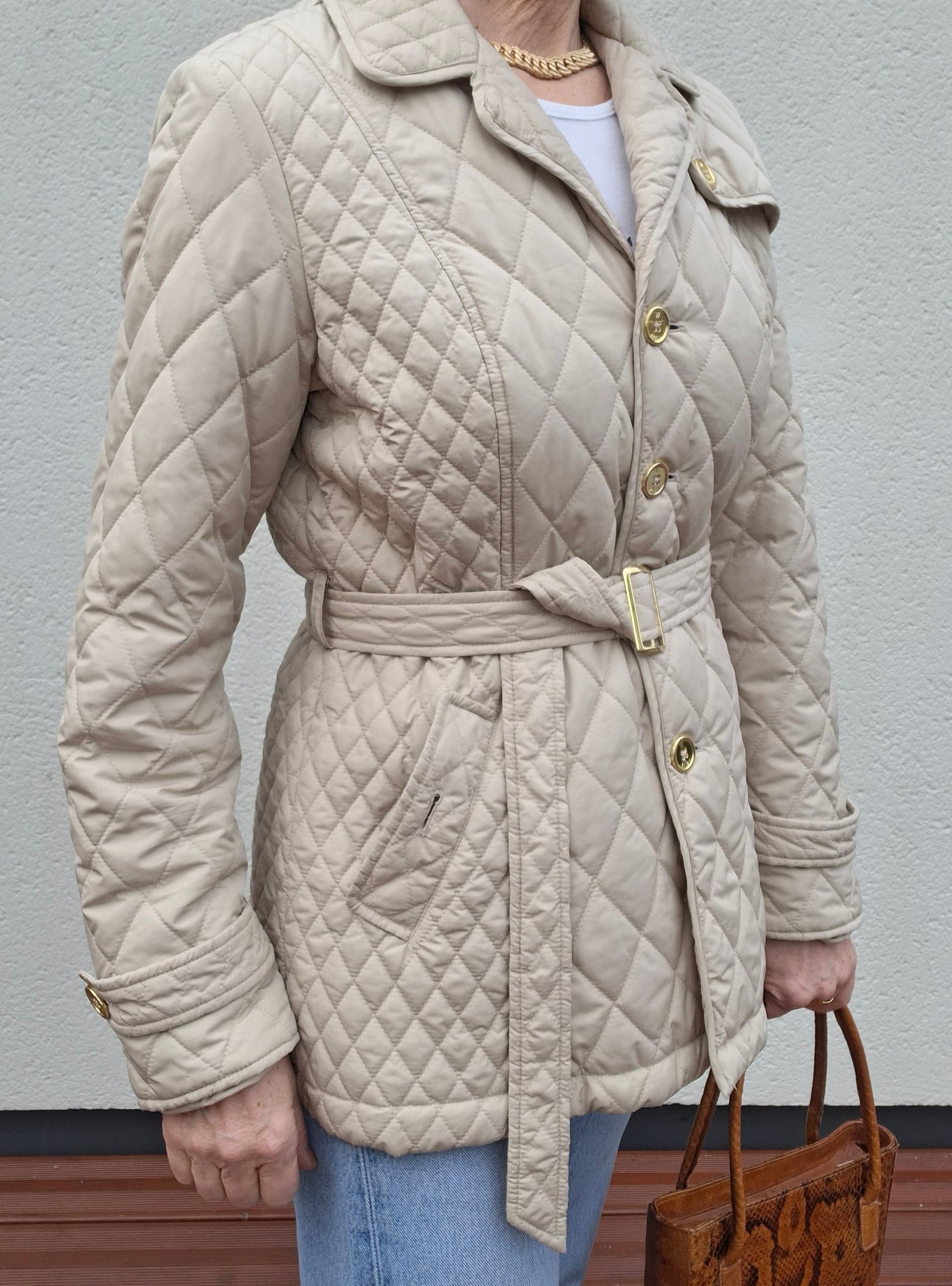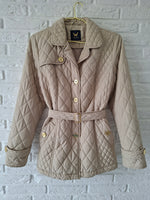 Veste matelassée ceinturée. 2 poches à rabats boutonnées. Ceinture assortie. Soufflet dans le dos. Doublée. Les mesures :Épaules 40cm.Aisselles 50cm.Longueur 70cm.Portée par Patricia qui fait une taille 40.