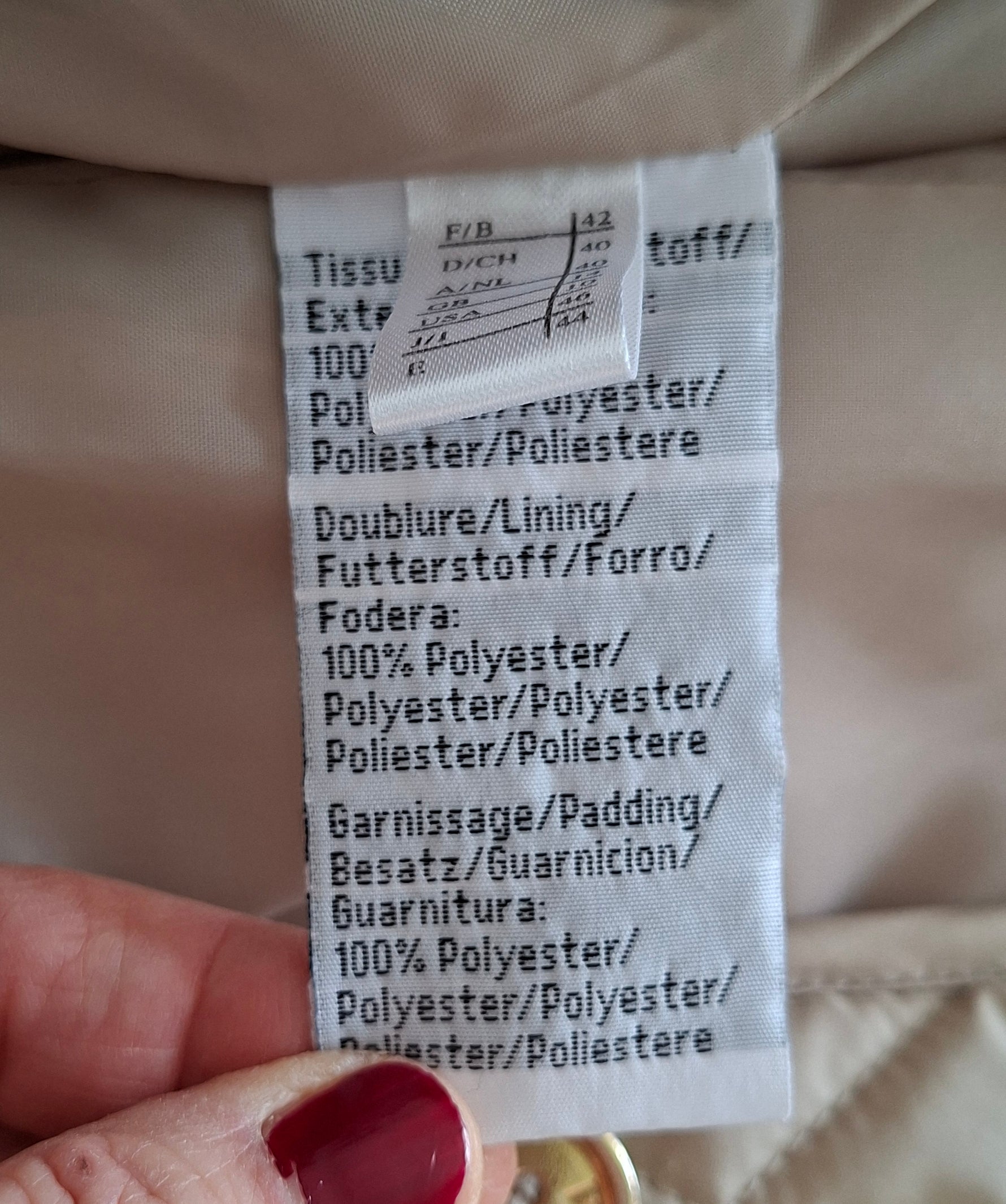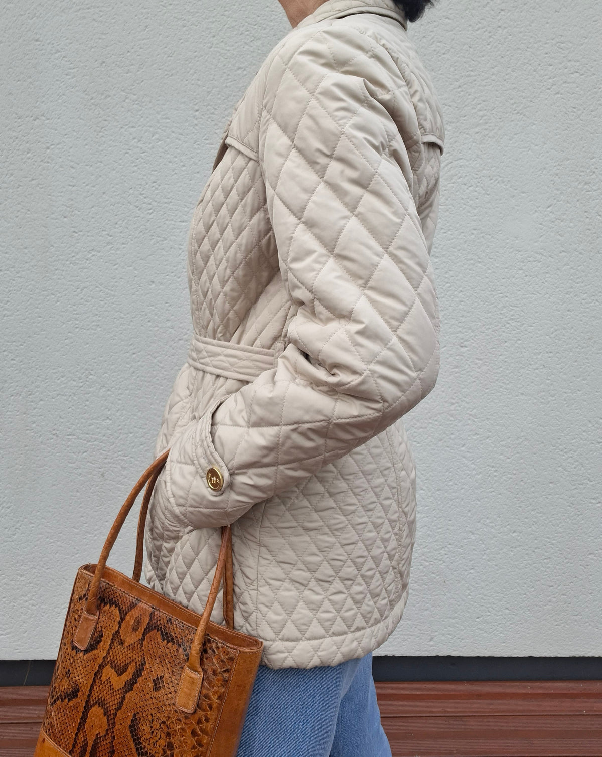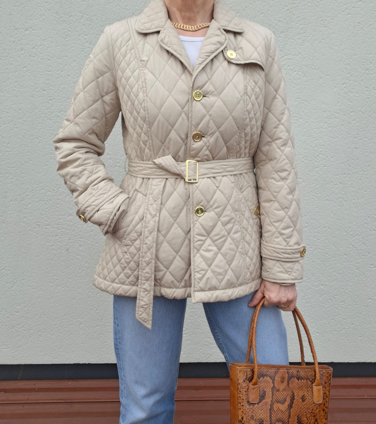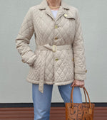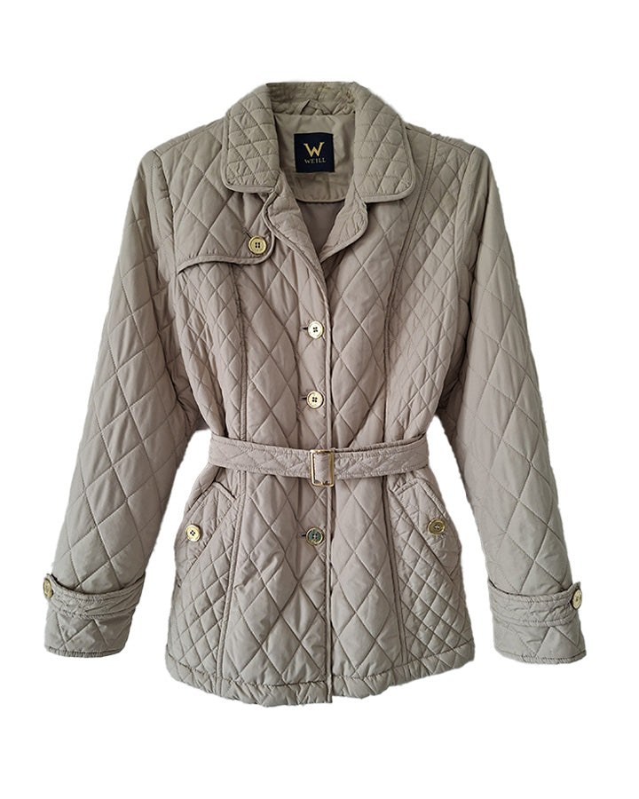 Veste matelassée ceinturée. 2 poches à rabats boutonnées. Ceinture assortie. Soufflet dans le dos. Doublée. Les mesures :Épaules 40cm.Aisselles 50cm.Longueur 70cm.Portée par Patricia qui fait une taille 40.