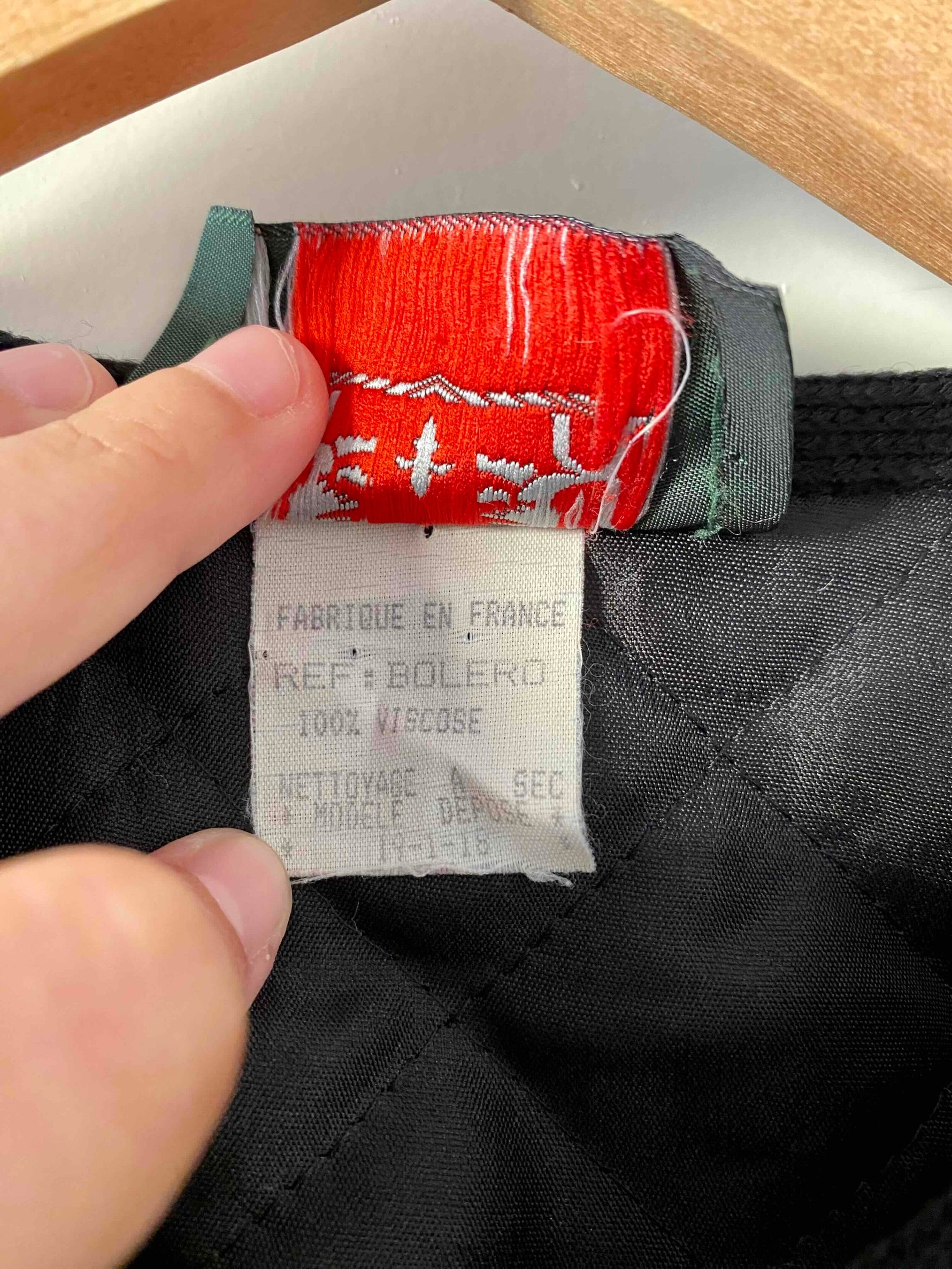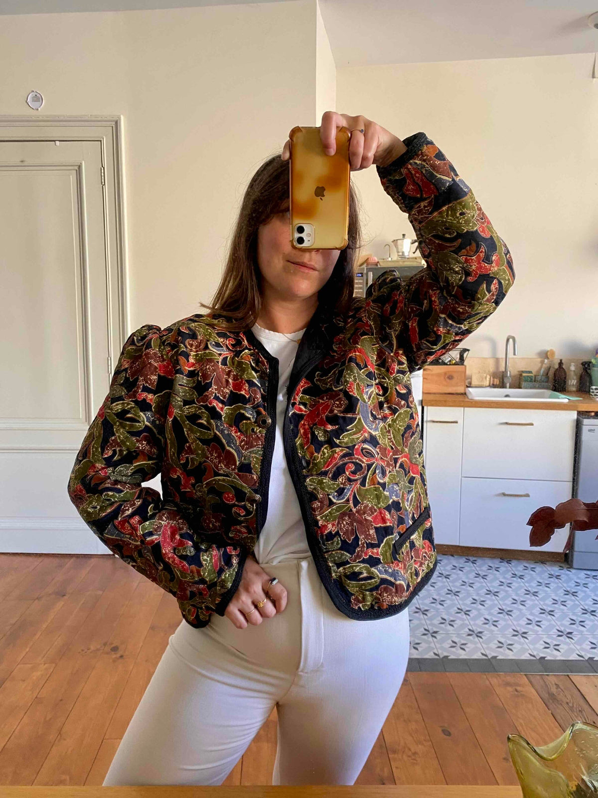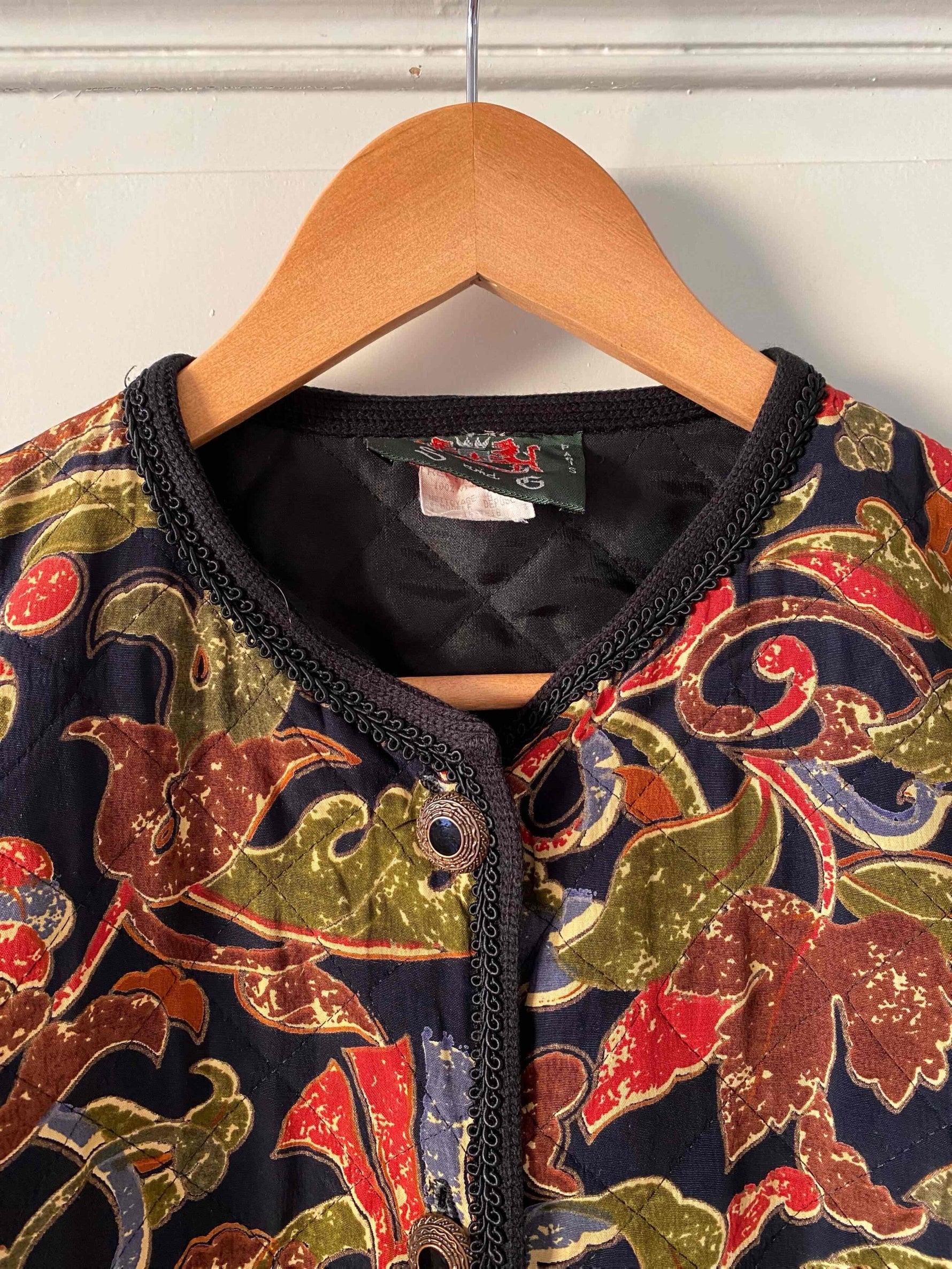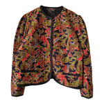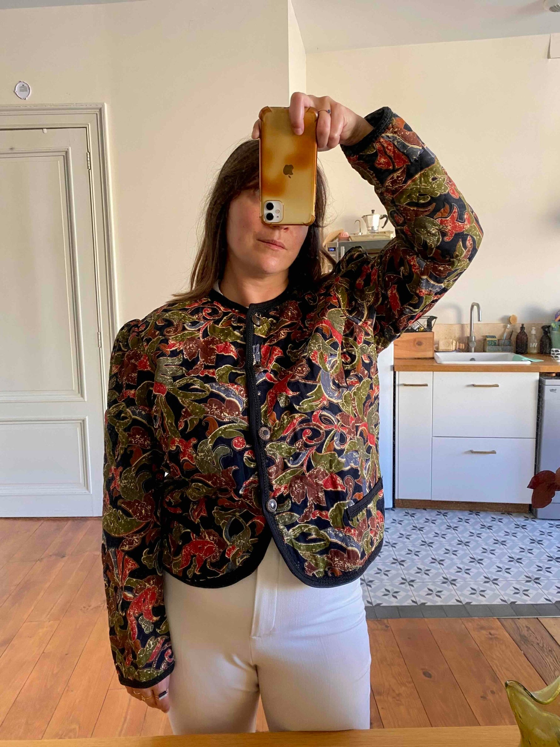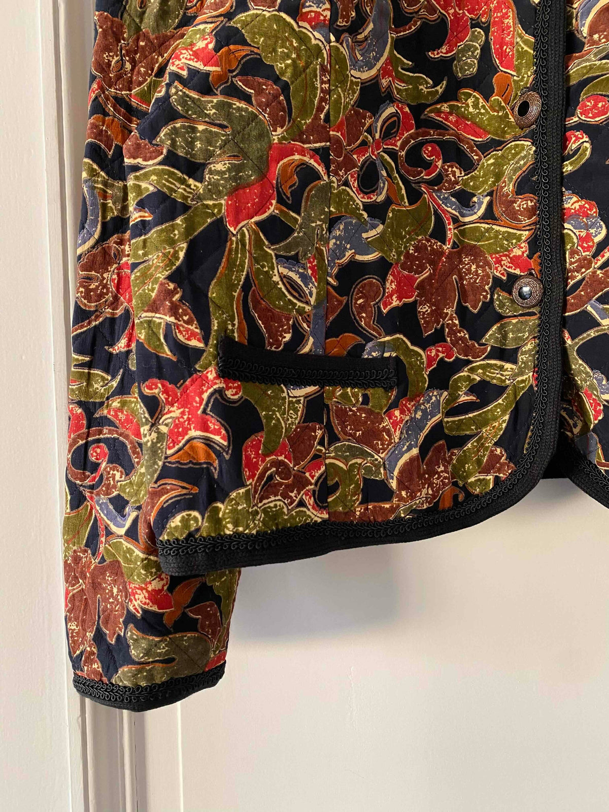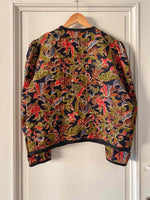 Prix unitaire parVeste Matelassée Paisley, en viscose noire imprimée paisley esprit batik ou wax dans les tons de vert olive, rouges, bruns et bleu, bordures brodées noires, matelassé croisillons, manches ballons gigots, boutons bijoux noirs et dorés, fabriqué en France, taille 40 porté ici sur une personne T40.