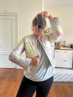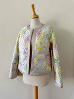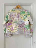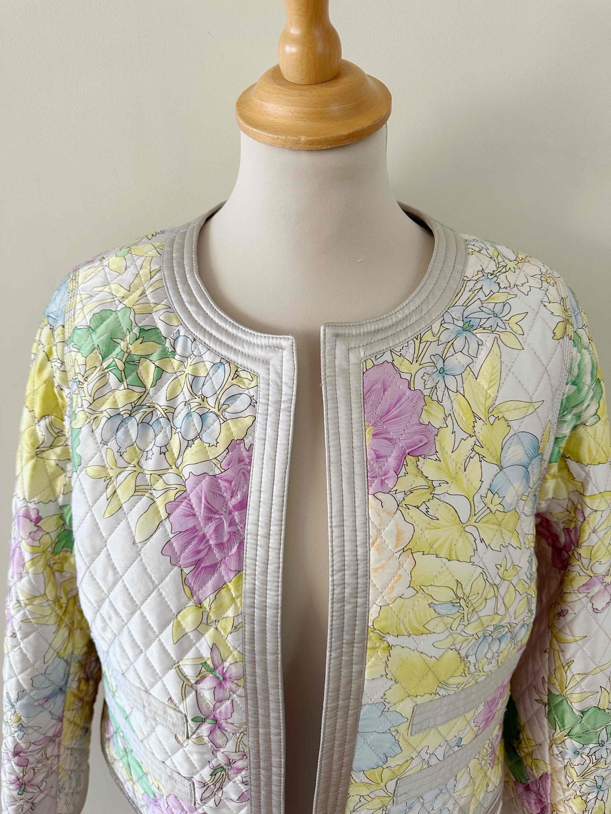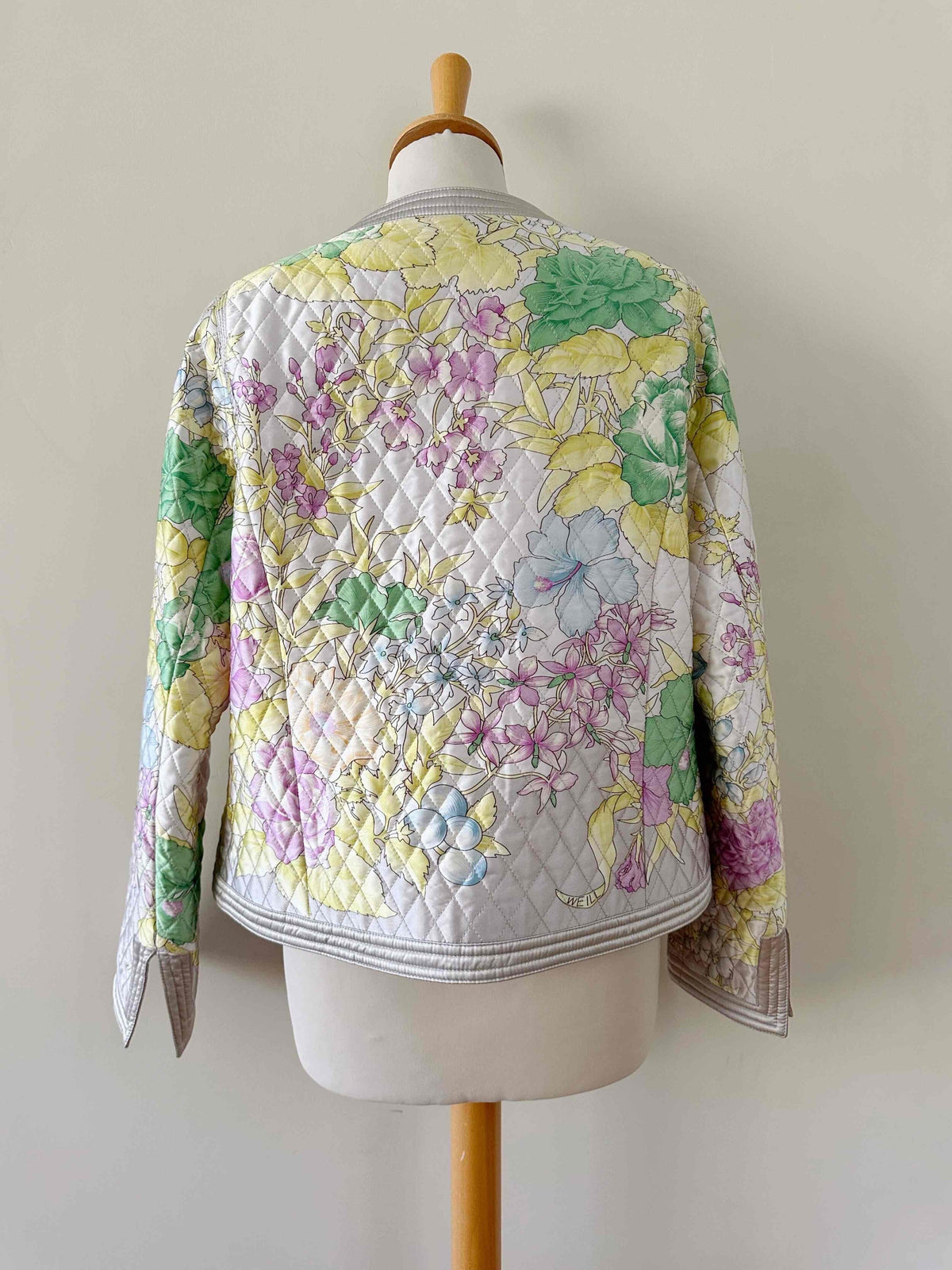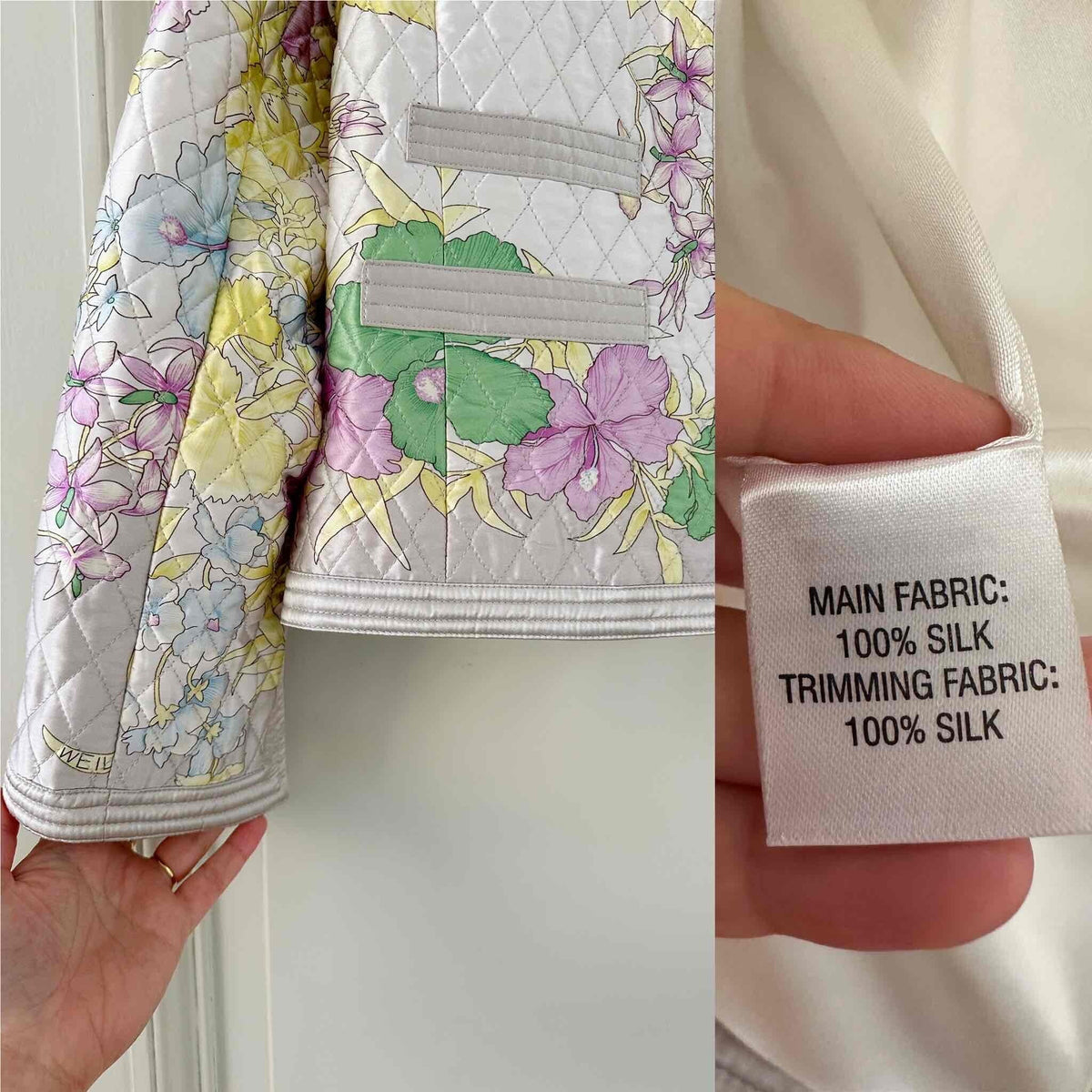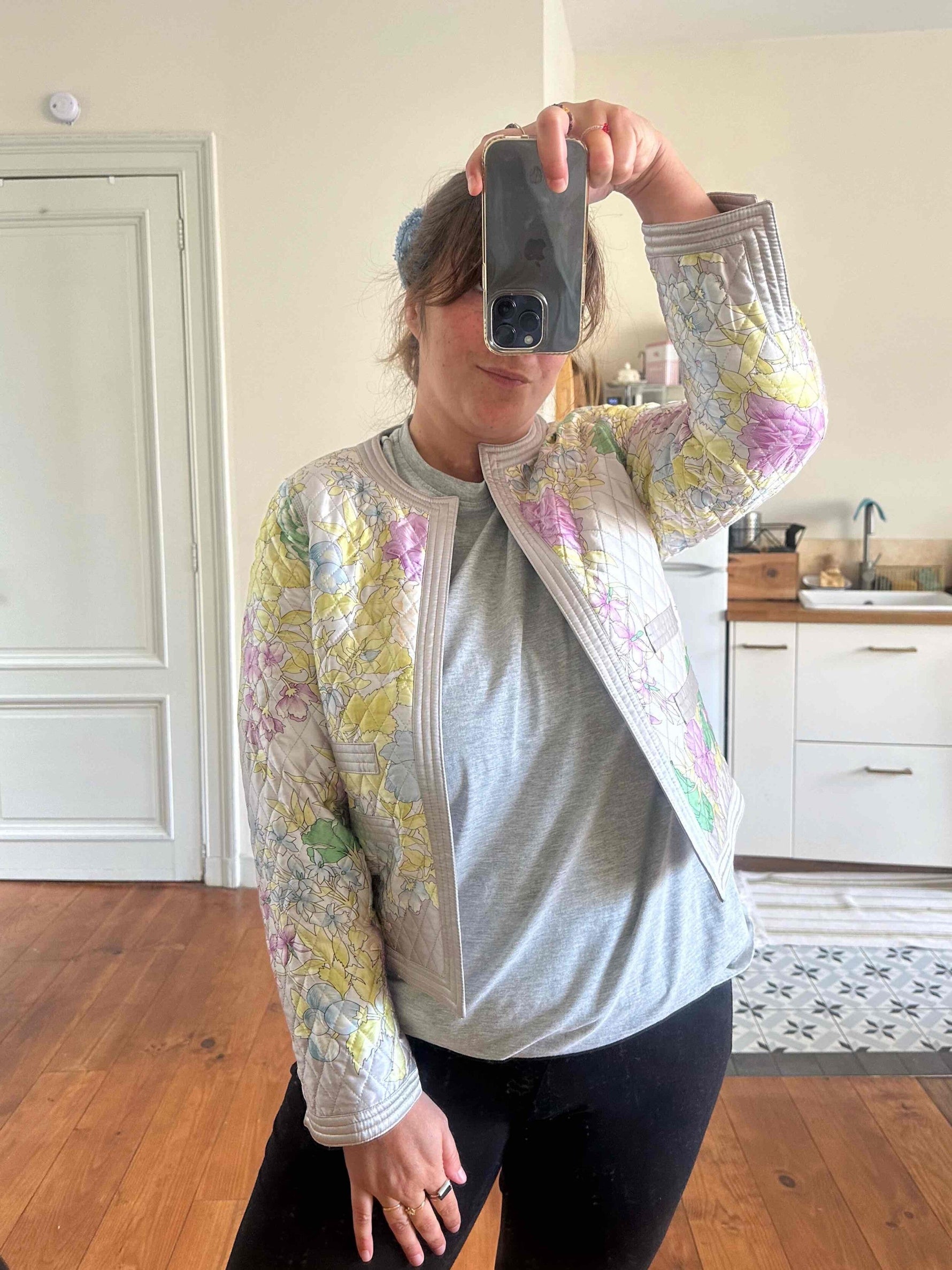 Prix unitaire parVeste matelassée en soie Weill, satin de soie gris clair imprimé de fleurs multicolores pastels, poignets crantés, convient aux tailles 36 et 38 portée ici sur un mannequin T36 et serrée sur une personne T40.