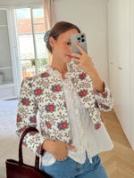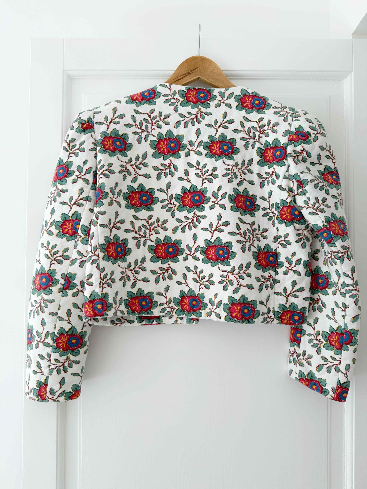 Prix unitaire parVeste courte blanche matelassée, ornée de fleurs aux couleurs vives (rouge, bleu, vert). Sans boutons ni poches. Fabriquée en France. Portée ici sur une taille 36 (1m64)
