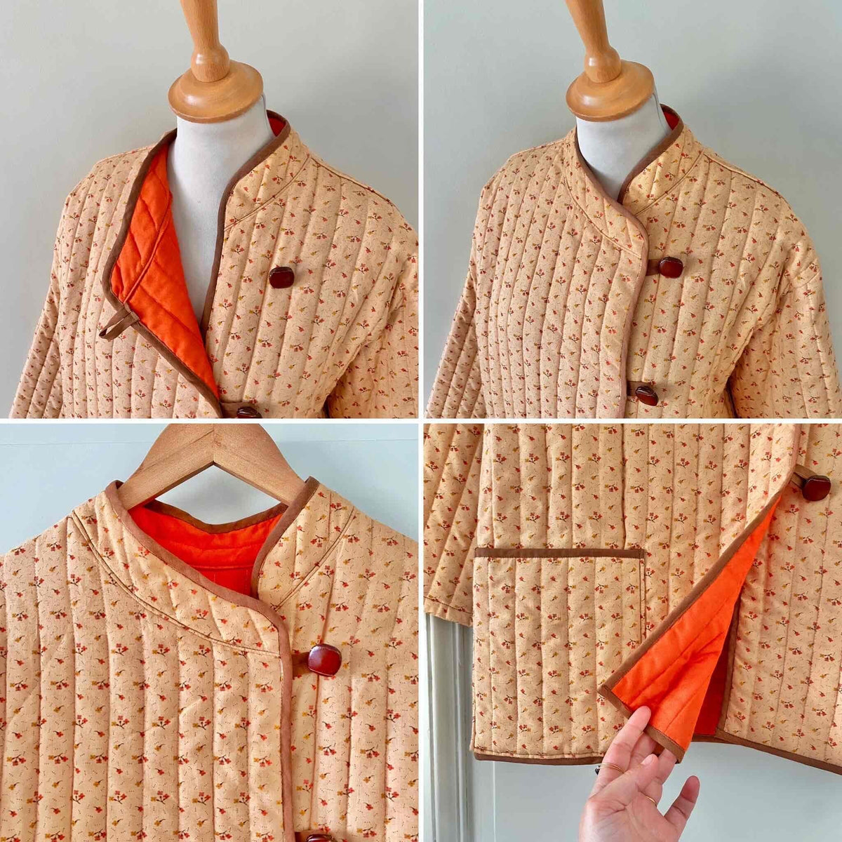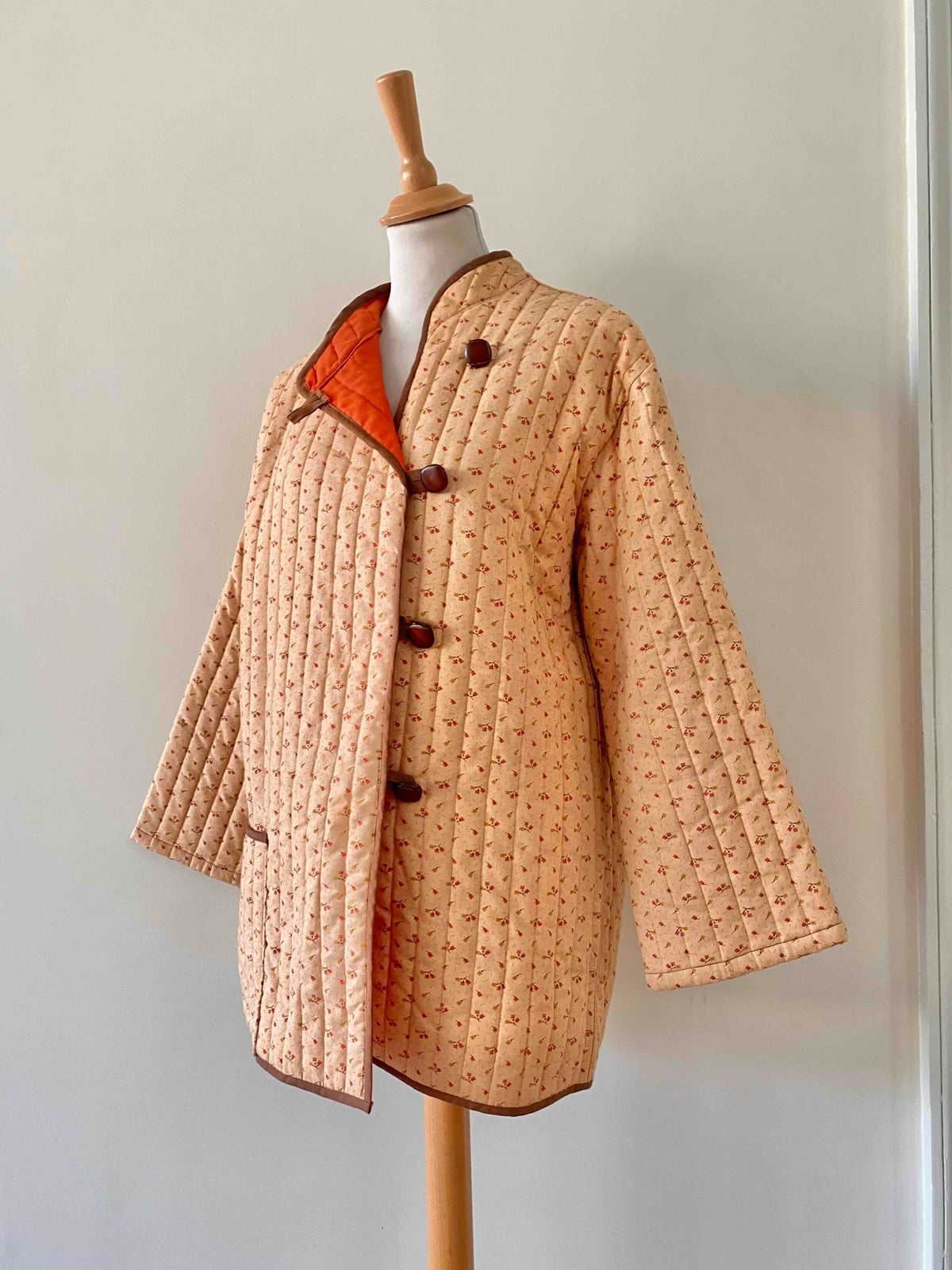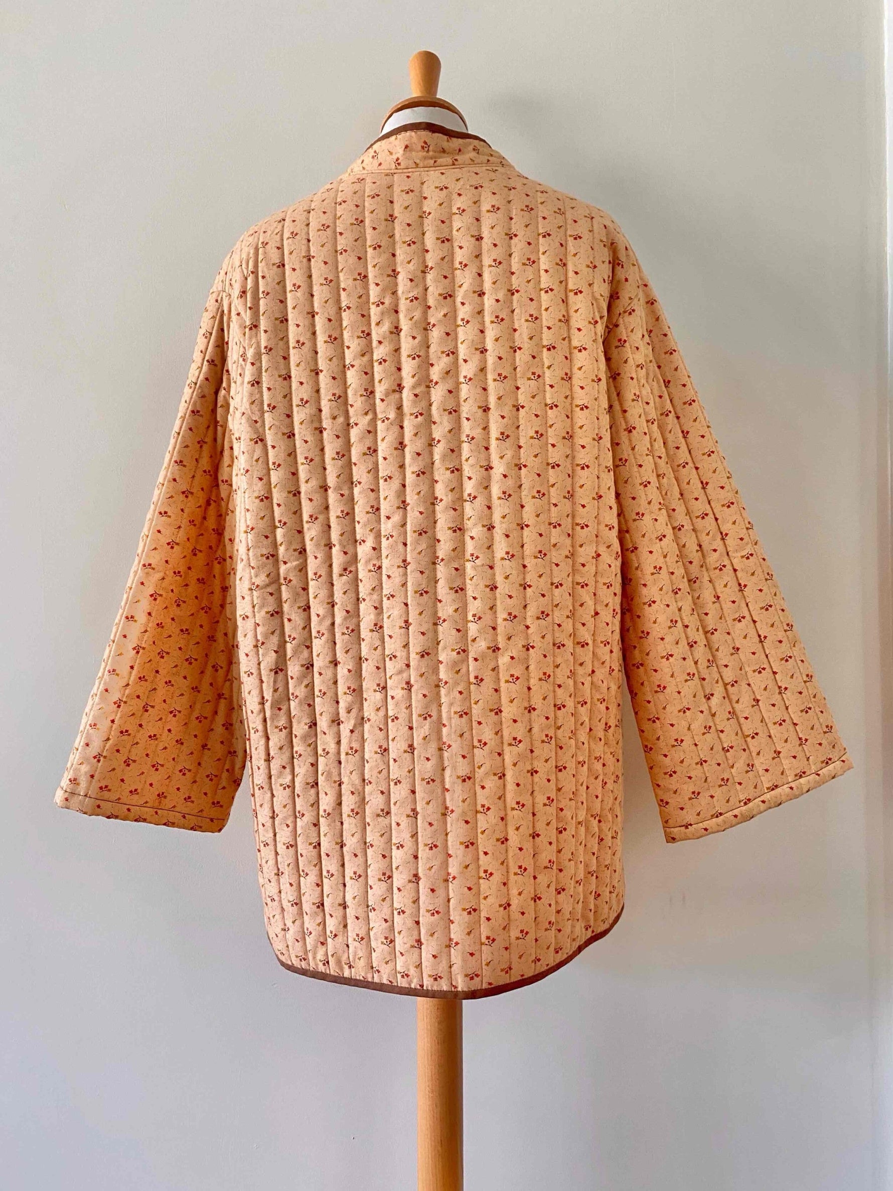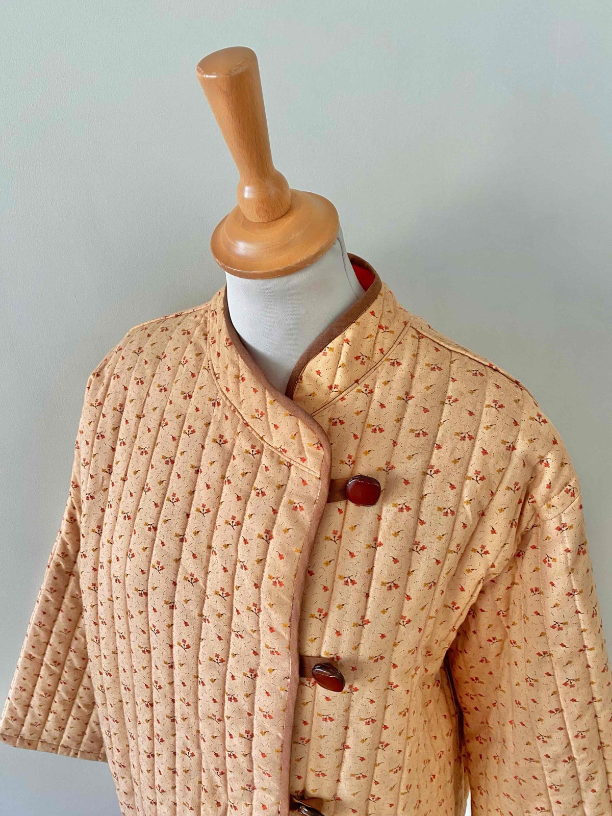 Prix unitaire parVeste matelassée à fleurs, en 100% coton rose orangé pêche, imprimée petites fleurs liberty roses et jaunes, doublure orange, gansé d’un liseré marron, boutons cuir, col mao et boutonnage asymétrique sur un côté, manches kimono, fait mains années 70’s, taille 36 et 38 portée ici sur un mannequin T36 et serrée sur une personne T40.