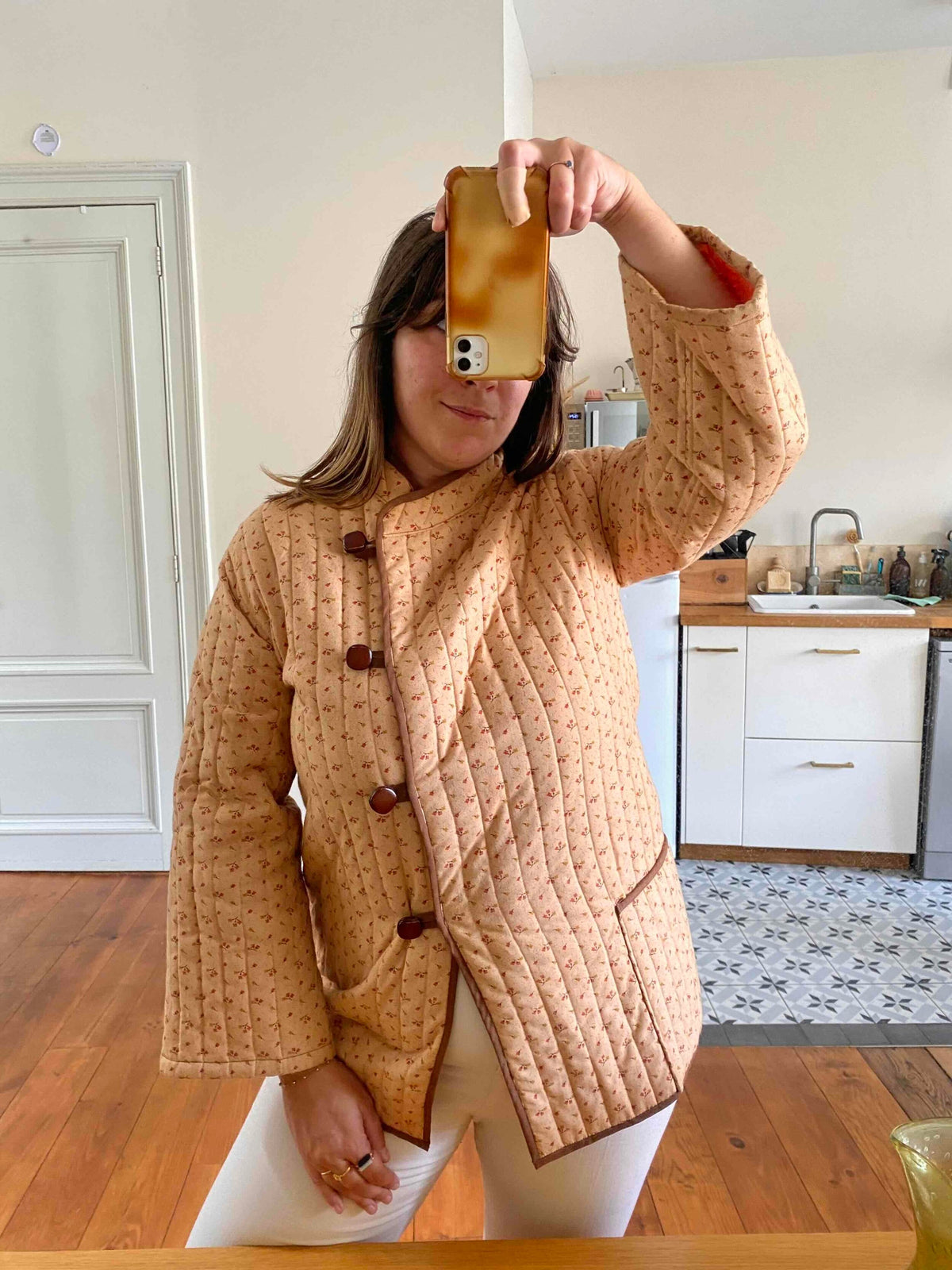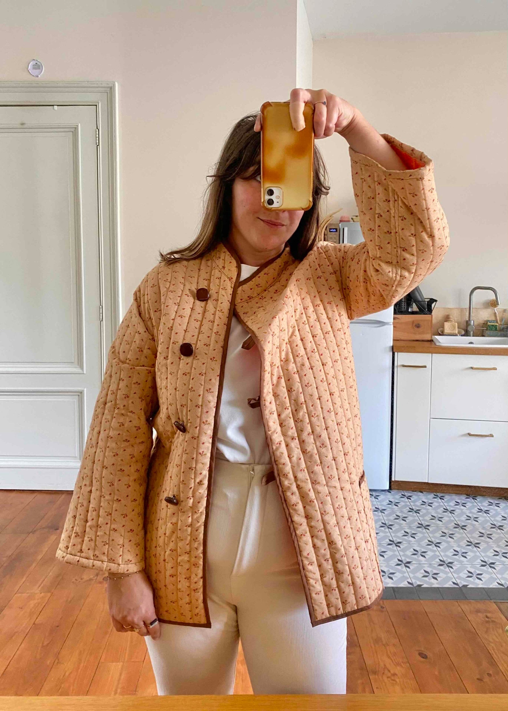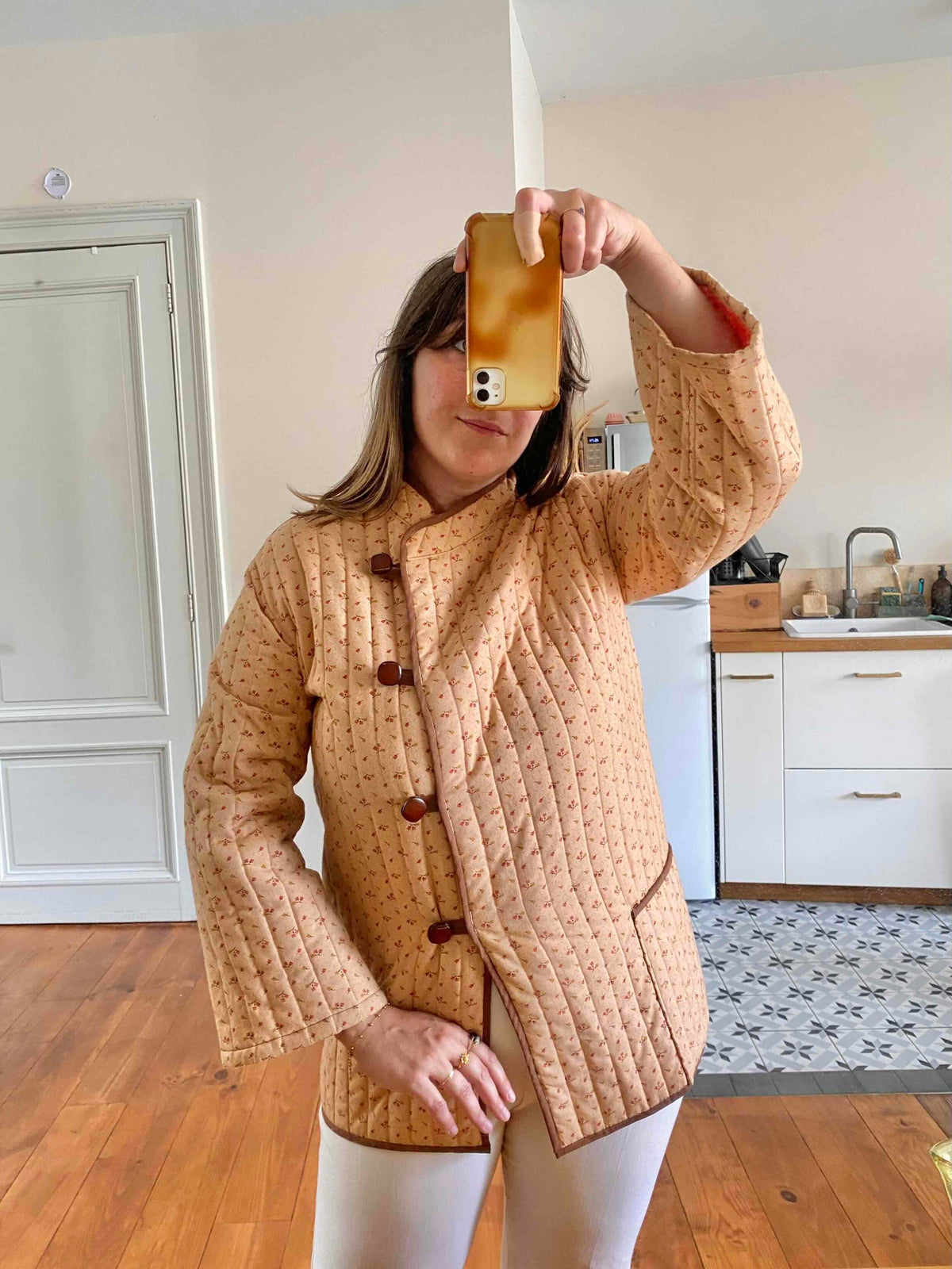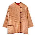 Prix unitaire parVeste matelassée à fleurs, en 100% coton rose orangé pêche, imprimée petites fleurs liberty roses et jaunes, doublure orange, gansé d’un liseré marron, boutons cuir, col mao et boutonnage asymétrique sur un côté, manches kimono, fait mains années 70’s, taille 36 et 38 portée ici sur un mannequin T36 et serrée sur une personne T40.