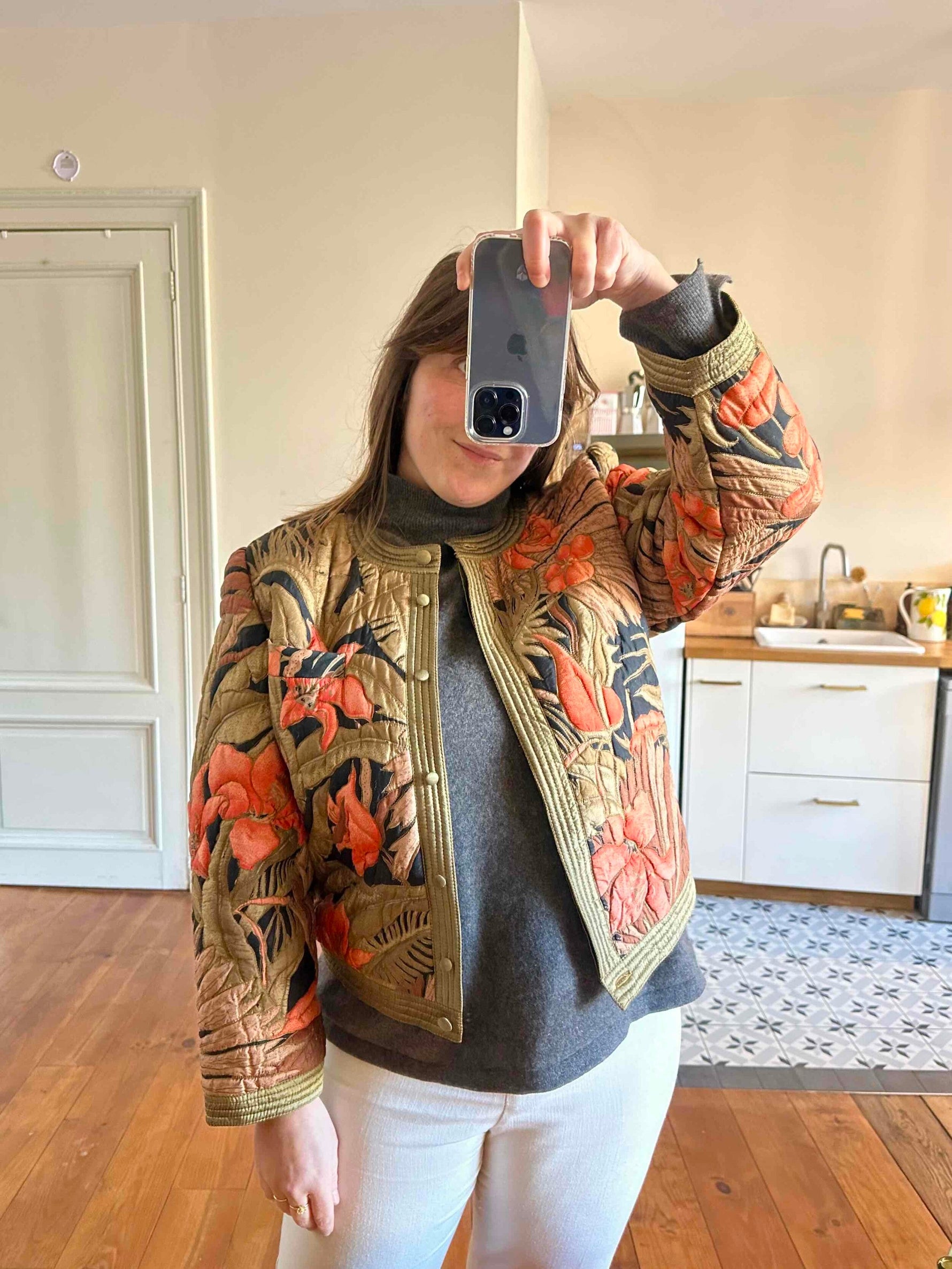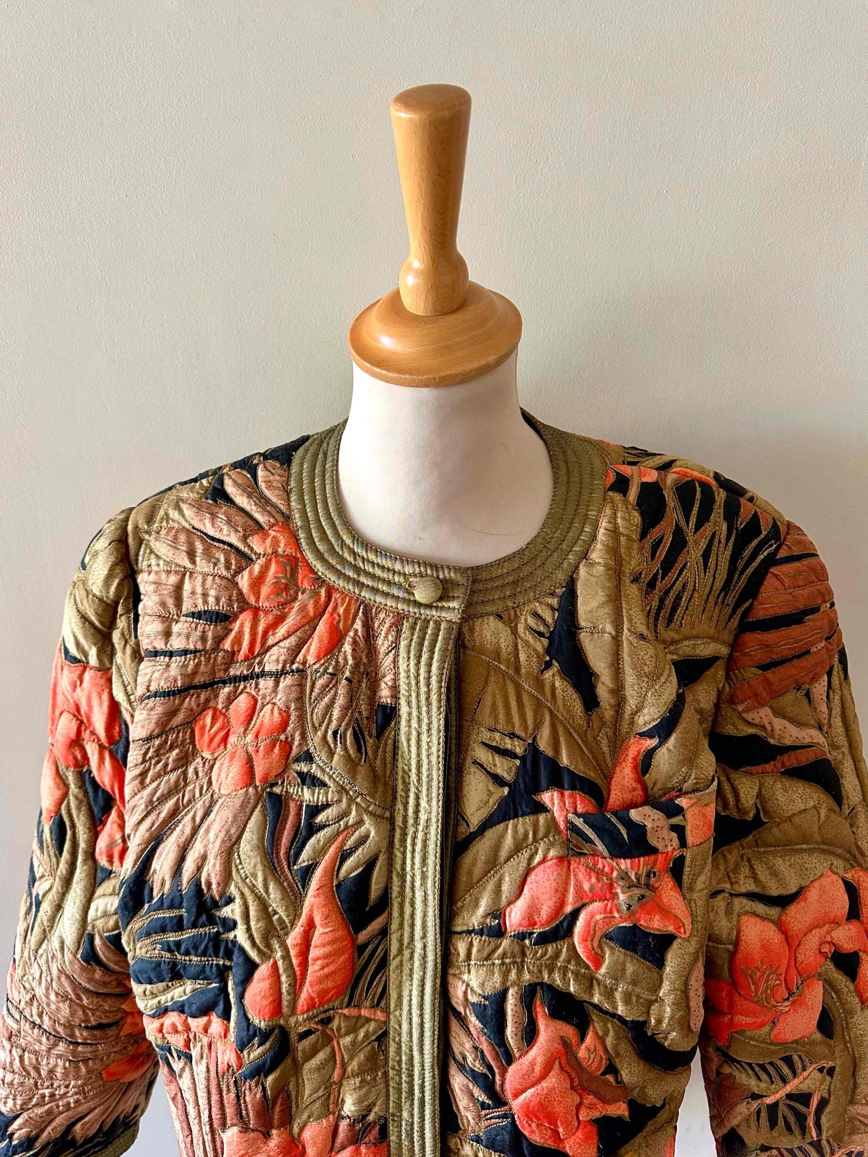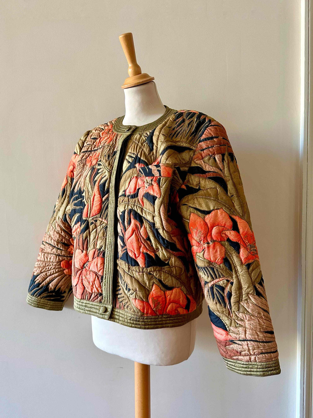 Prix unitaire parVeste matelassée en Soie, soie vert olive doré, motifs fleurs roses corail, matelassé au motifs, fabriquée en France, taille 36 et 38 portée ici sur un mannequin T36 et ouverte sur une personne T40.