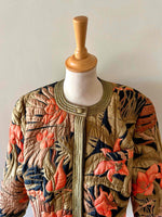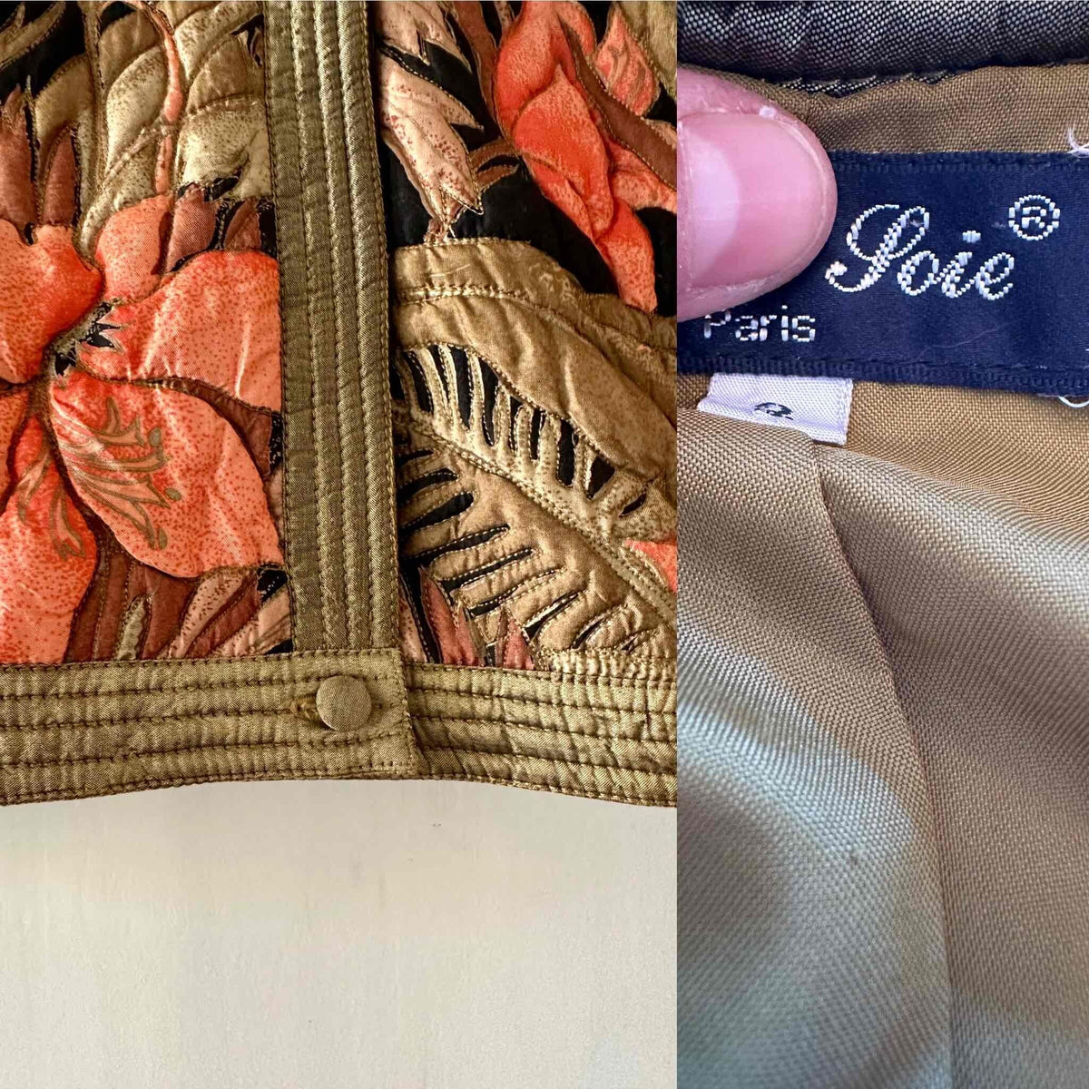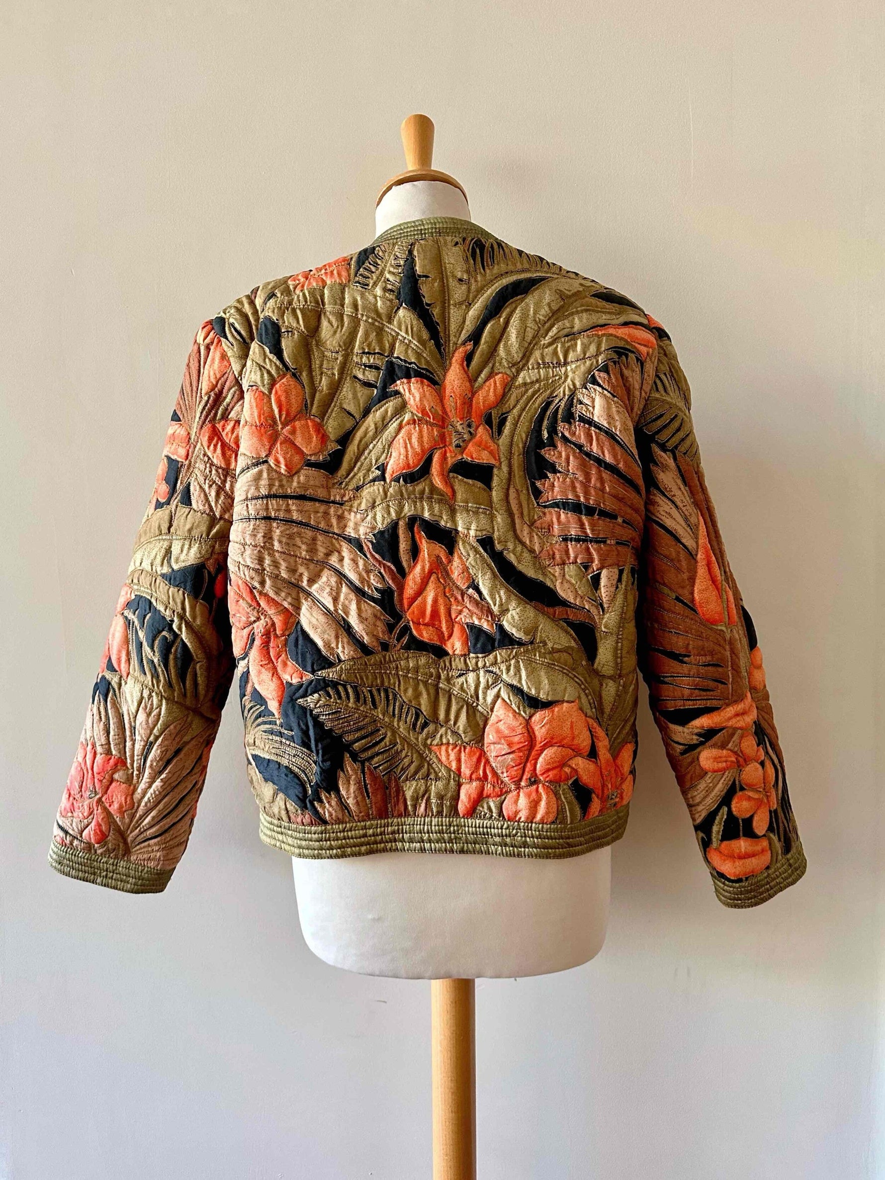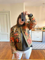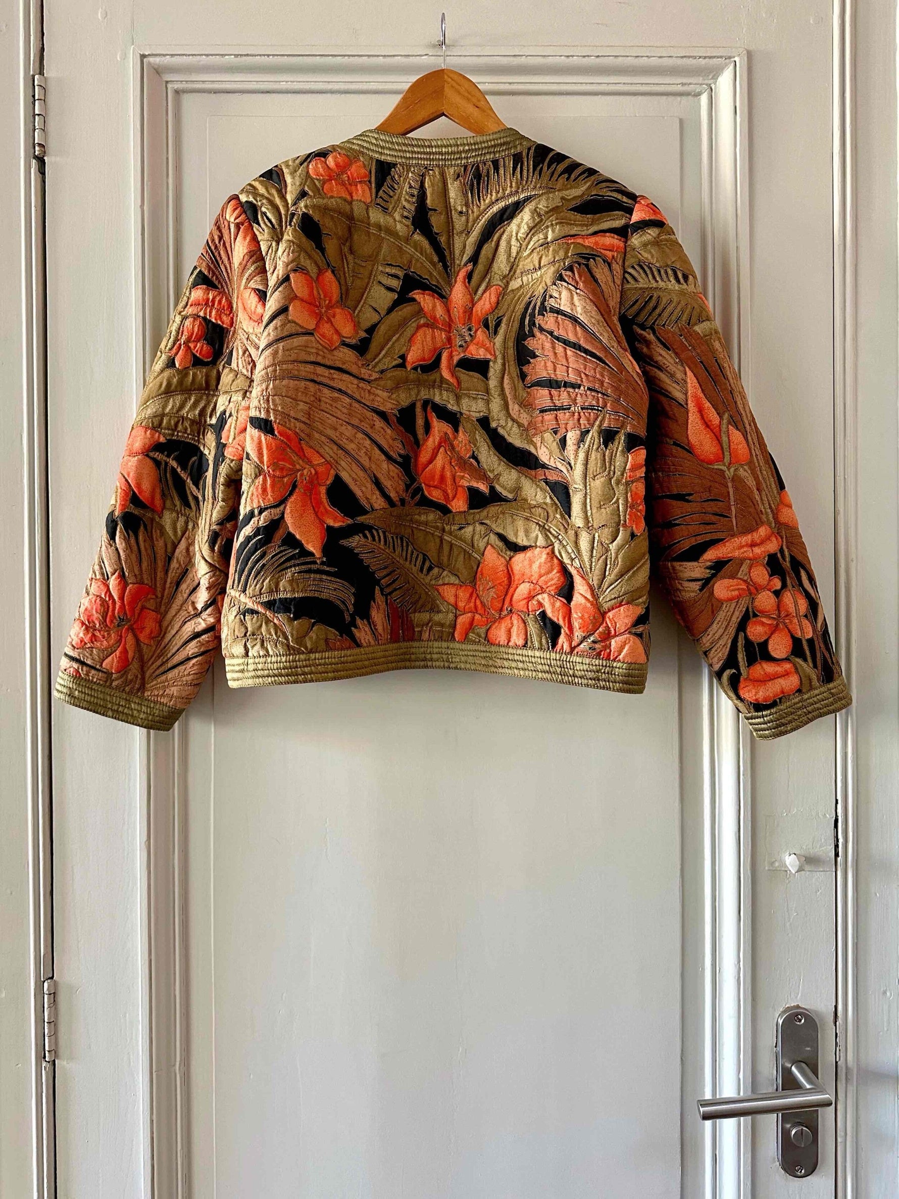 Prix unitaire parVeste matelassée en Soie, soie vert olive doré, motifs fleurs roses corail, matelassé au motifs, fabriquée en France, taille 36 et 38 portée ici sur un mannequin T36 et ouverte sur une personne T40.