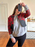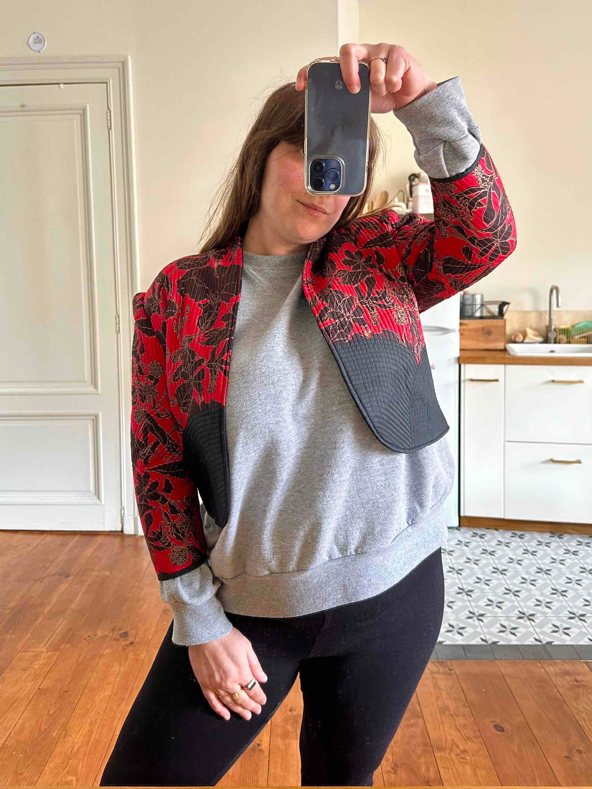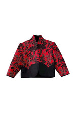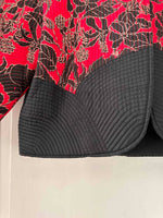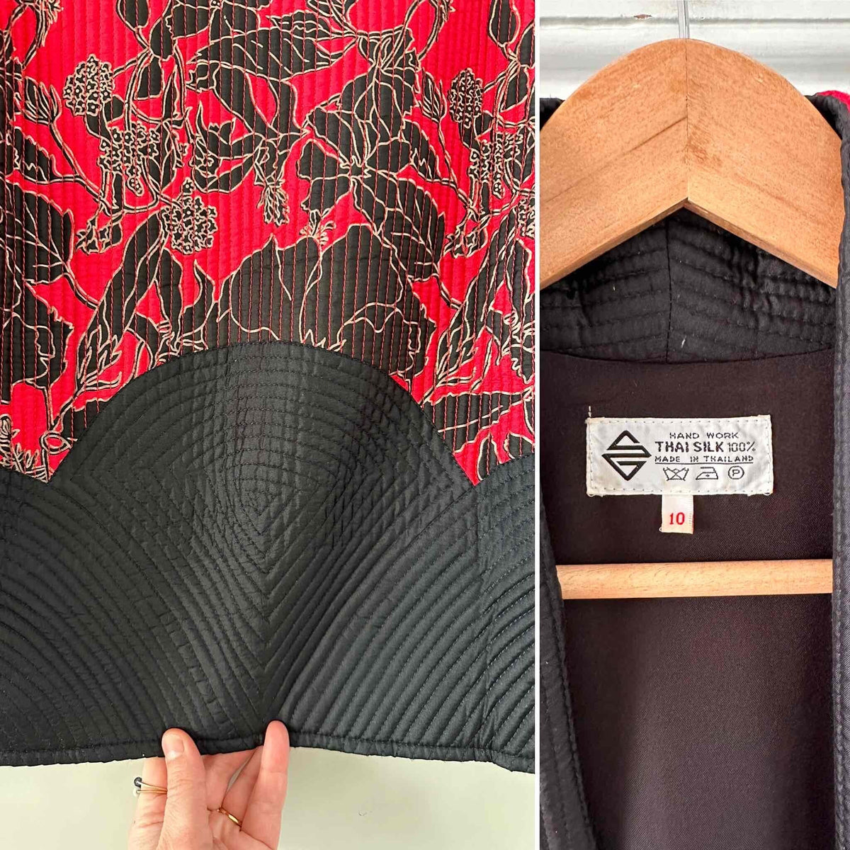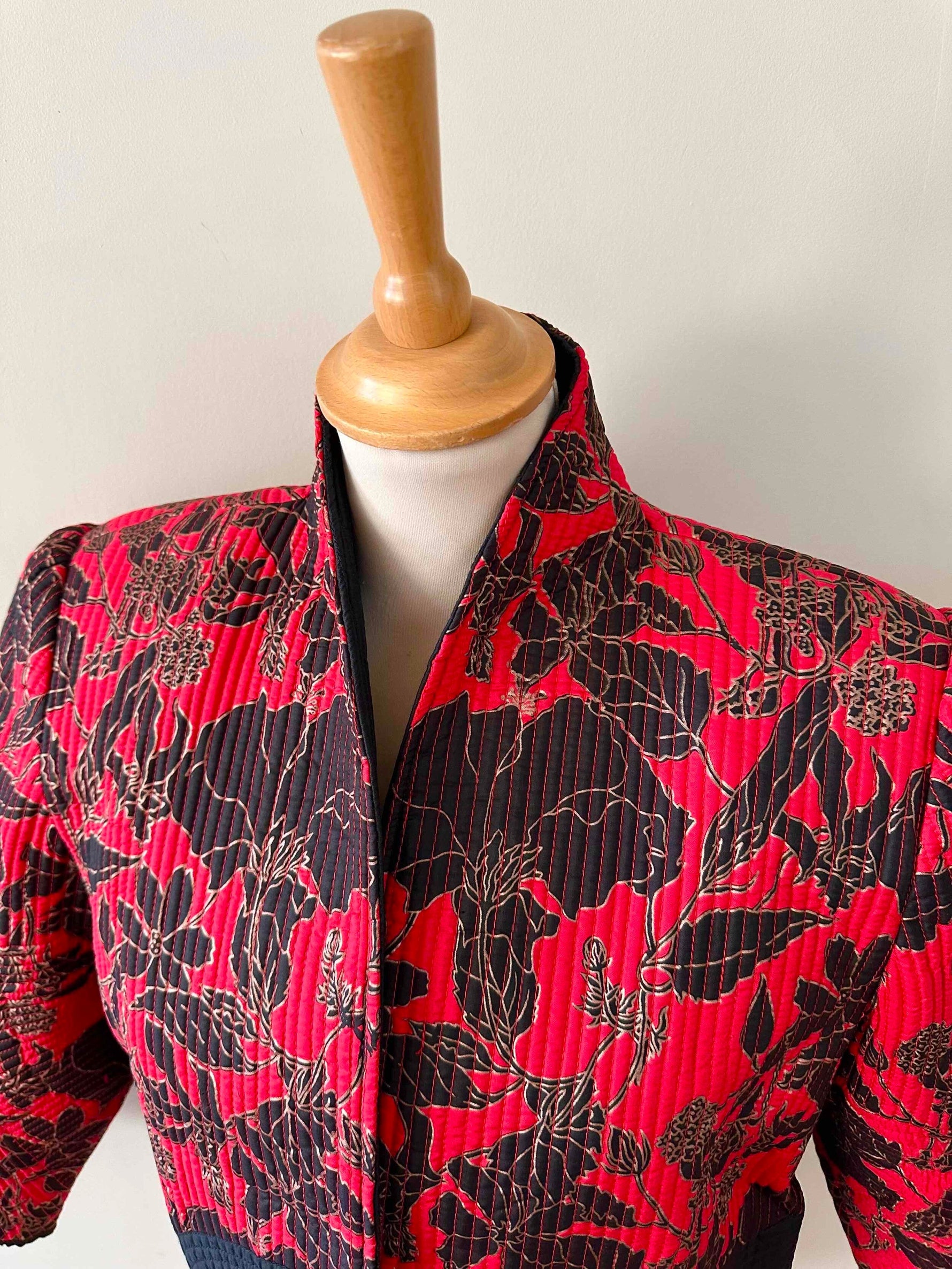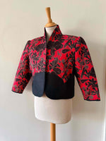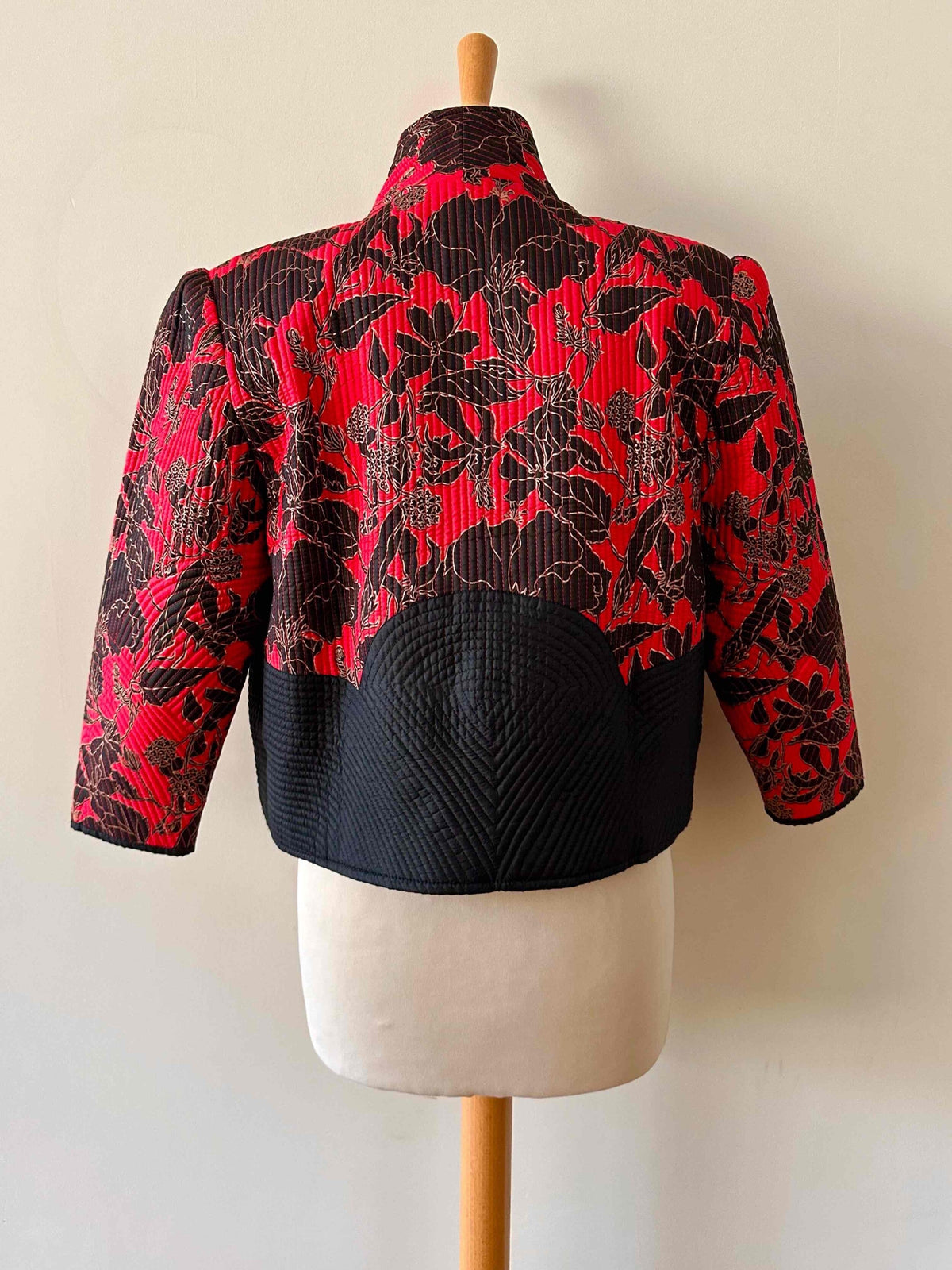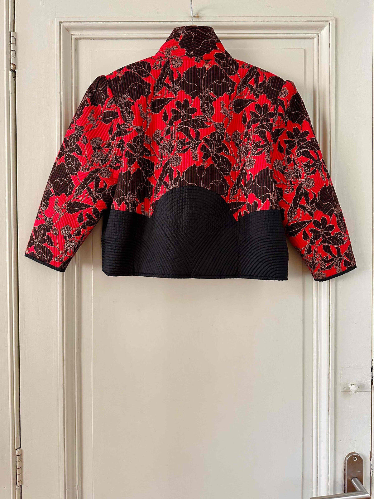 Prix unitaire parVeste matelassée en Soie, forme veste cropped boléro, en soie noire et rouge imprimée fleurs dorées, matelassé fin, manches 3/4, années 80s, convient aux tailles 36 et 38, portée ici sur un mannequin T36 et serrée sur une personne T40.