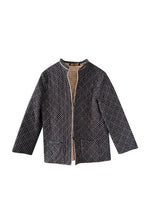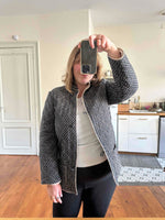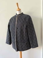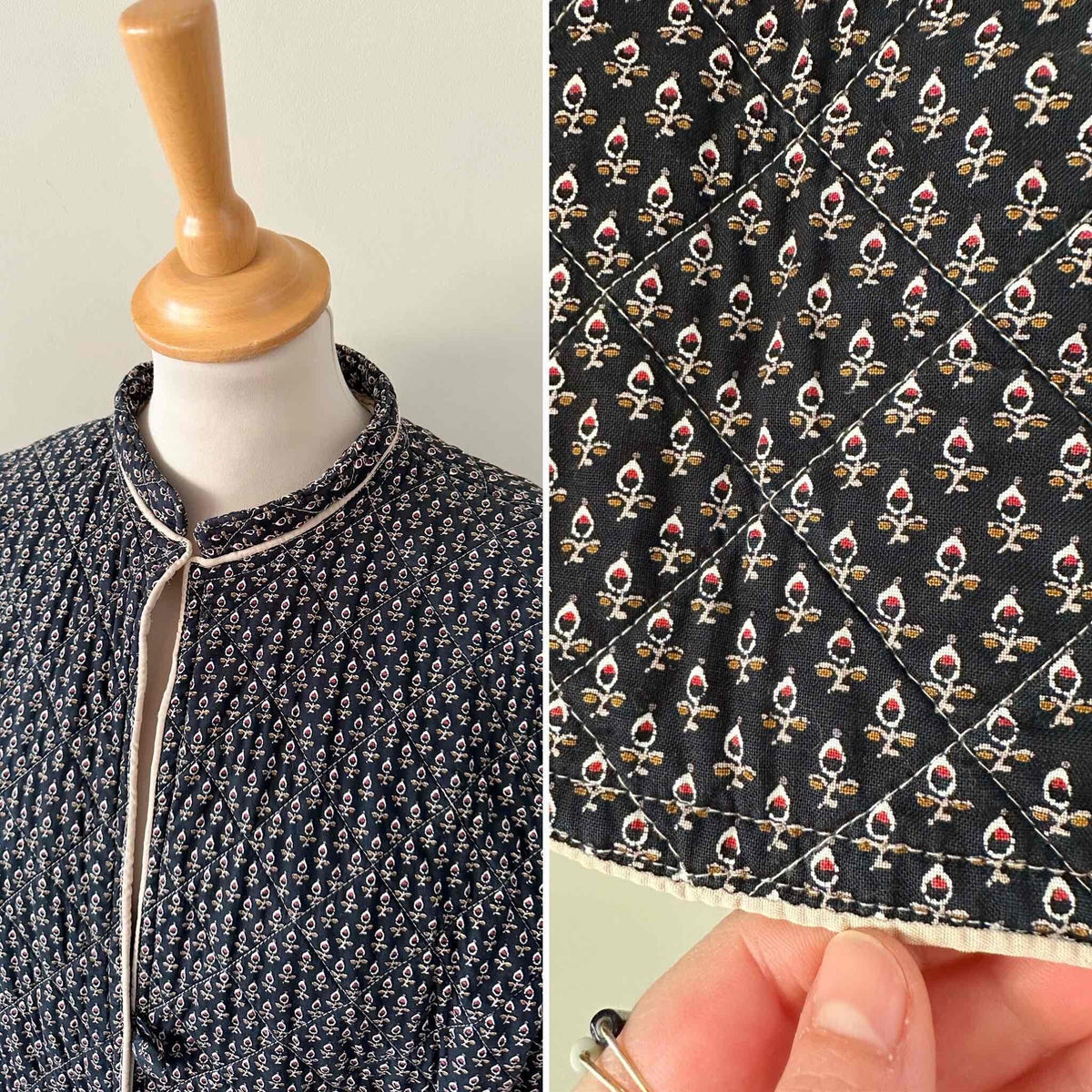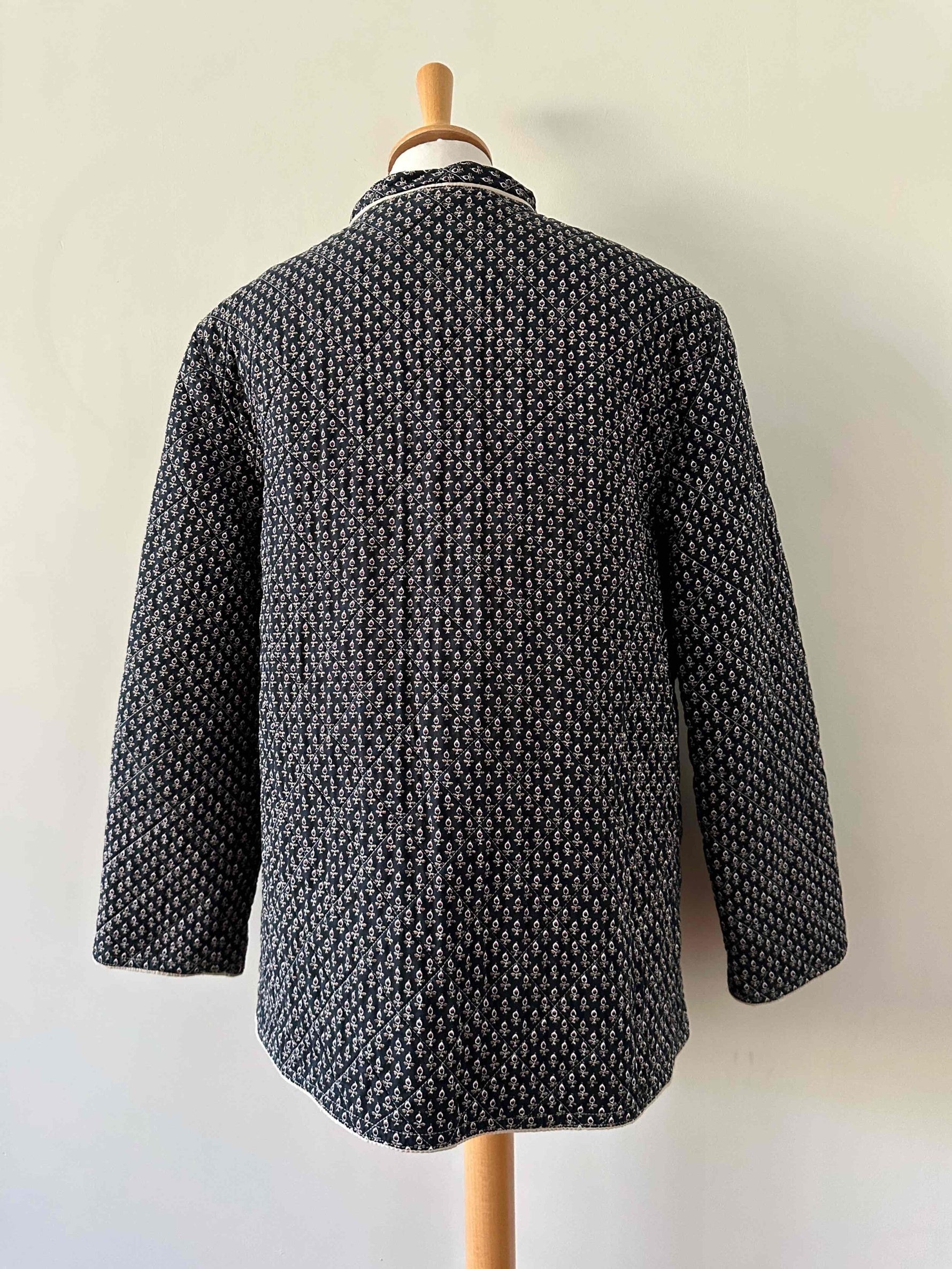Prix unitaire parVeste matelassée provençale, en 100% coton matelassé quilté, fond noir minis motifs provençaux ocre, blancs et rouges, interieur coton beige, fermeture par deux boutons, col montant, fabriquée en France, taille 36 portée ici sur un mannequin T36 et ouverte sur une personne T40.