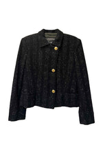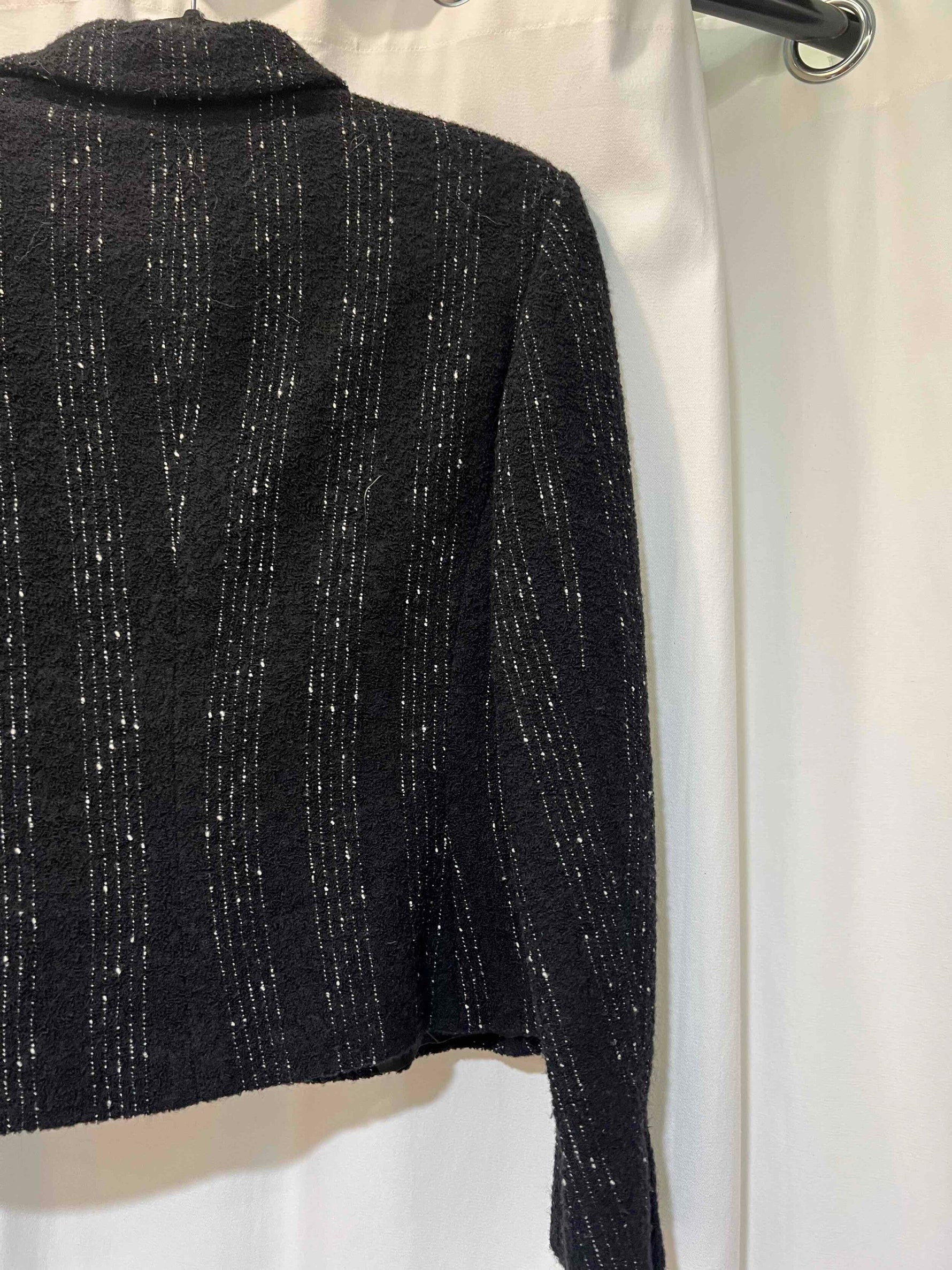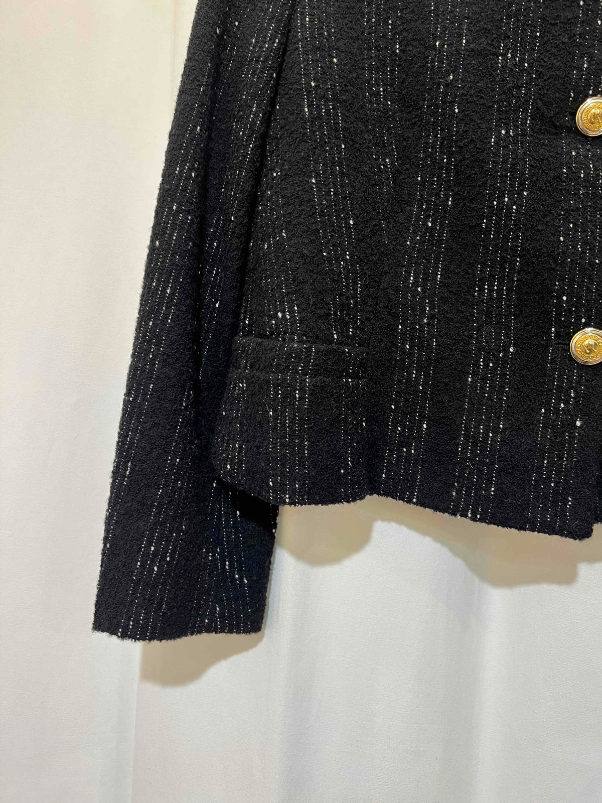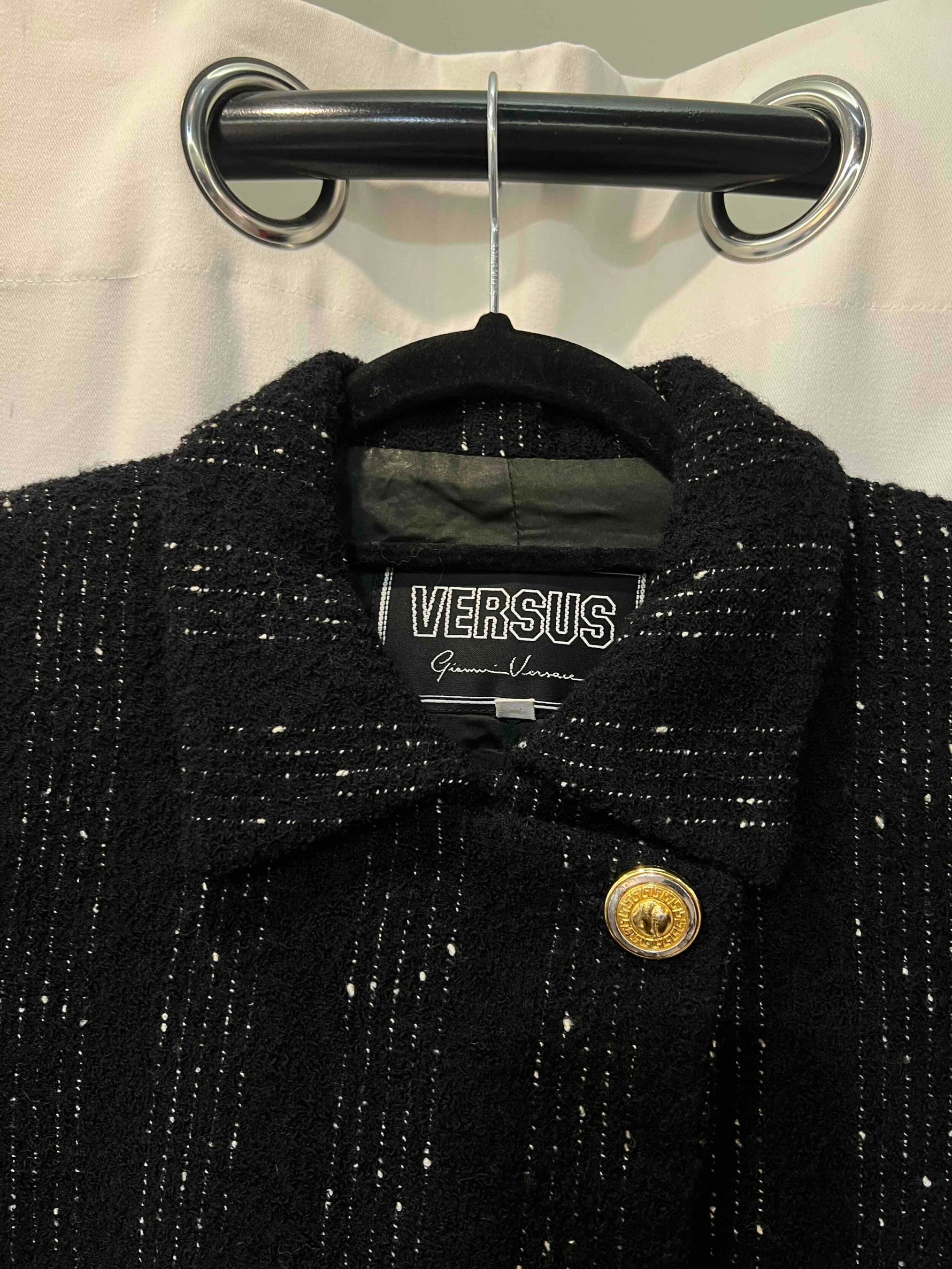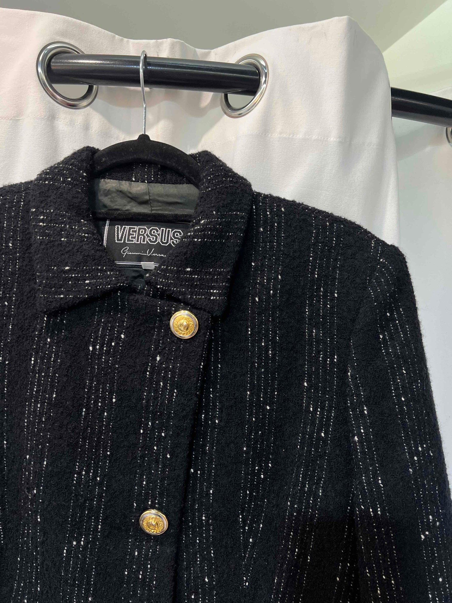 Prix unitaire parVeste courte en laine vierge noire chiné de la marque Versus Versace. Excellent état. Effet tweed. Boutons dorés avec une panthère sur le côté. Fabrique en Italie. Coupe crop, deux petites poches.