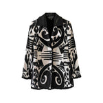 Blazer Christian Linares, en coton denim blanc Imprimé motifs ikats noirs, bordures à franges noires, col et détails en cuir noir, boutons pressionnés, fabriquée en France, taille 36 portée ici sur un mannequin T36.