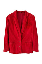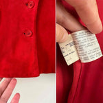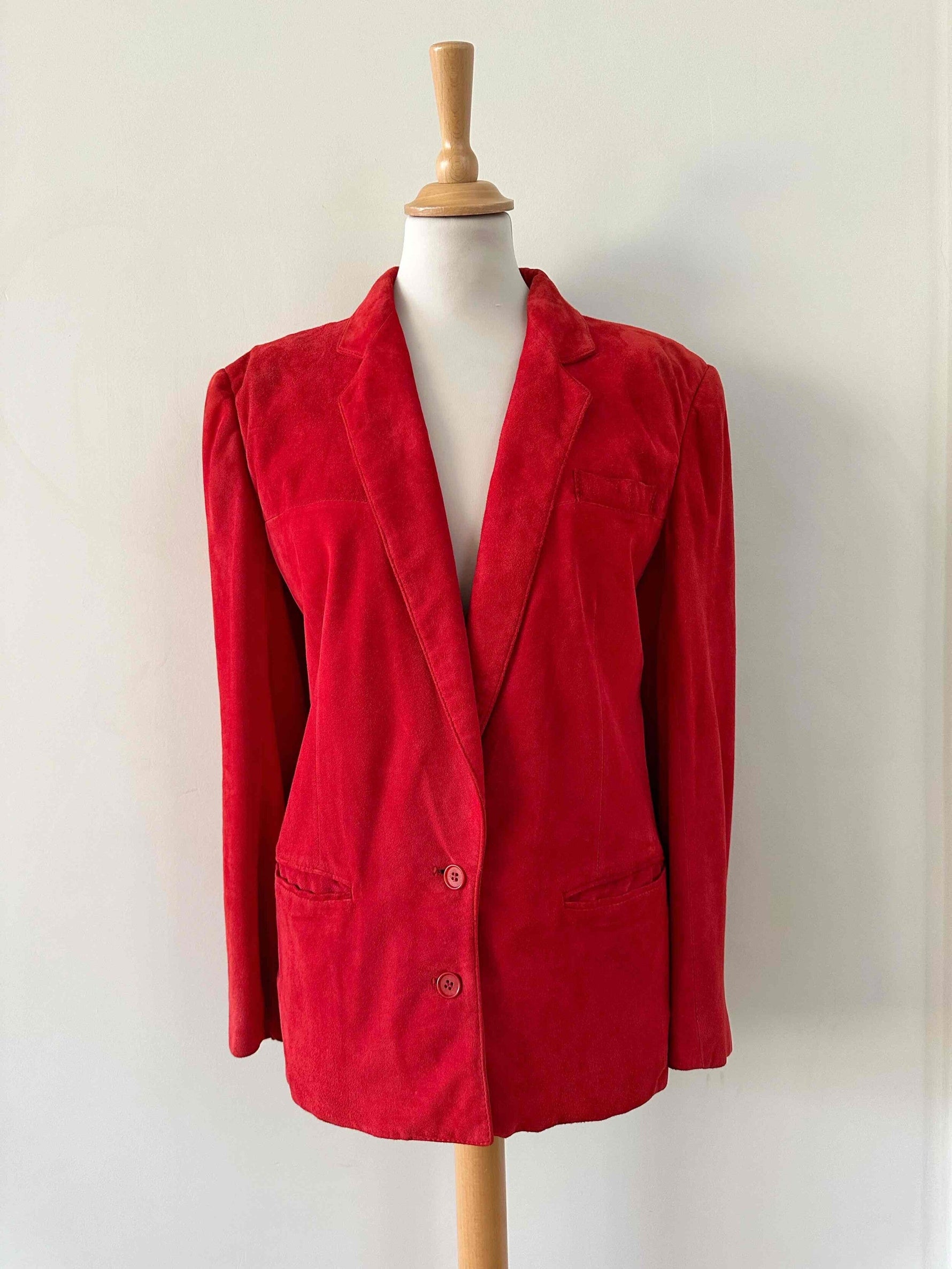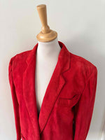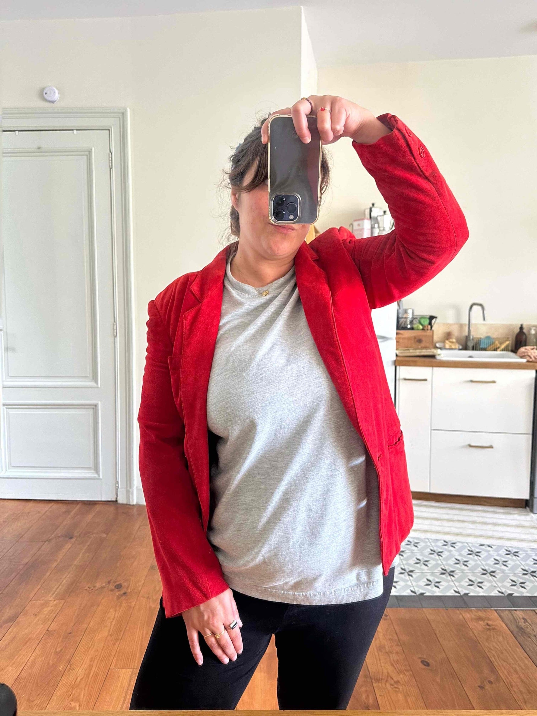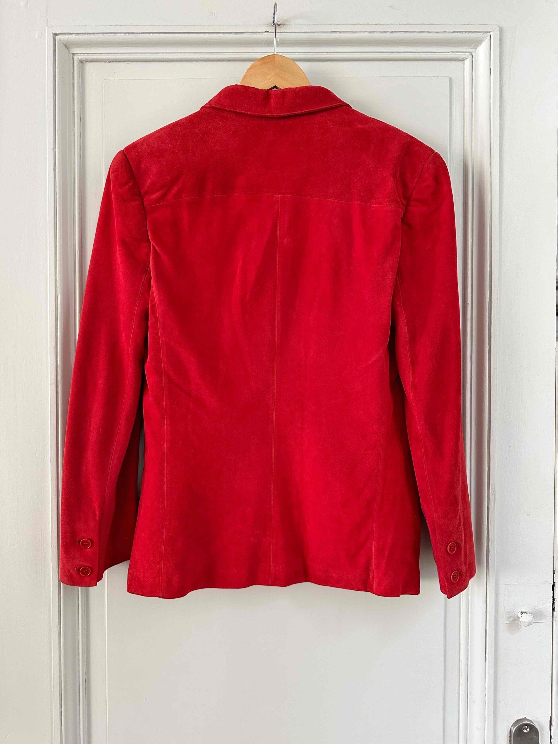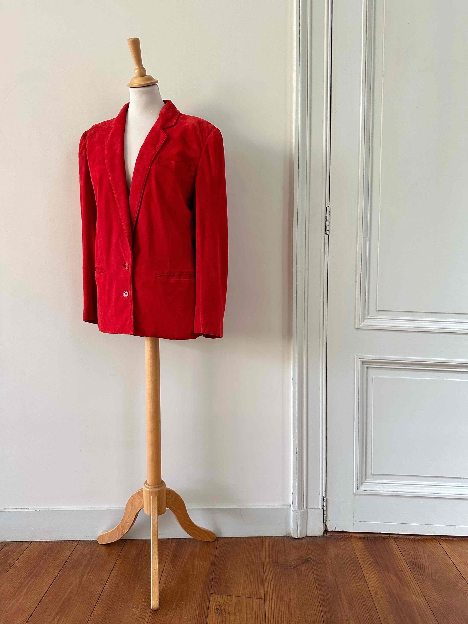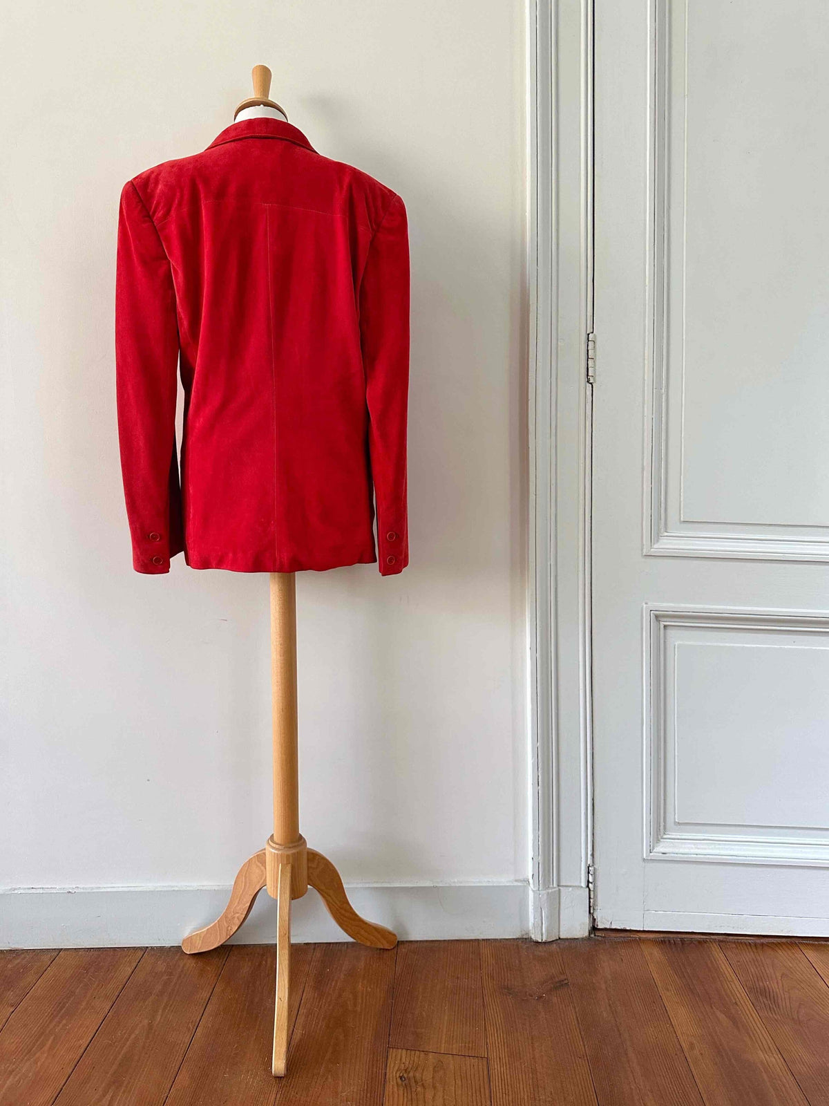 Prix unitaire parBlazer en daim, agneau plongé velours rouge vermillon, carrure à épaulettes, encolure V plongeante boutonnée à la taille, fabriquée en Italie, taille 36 portée ici sur un mannequin T36 et ouverte sur une personne T40.