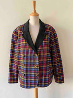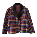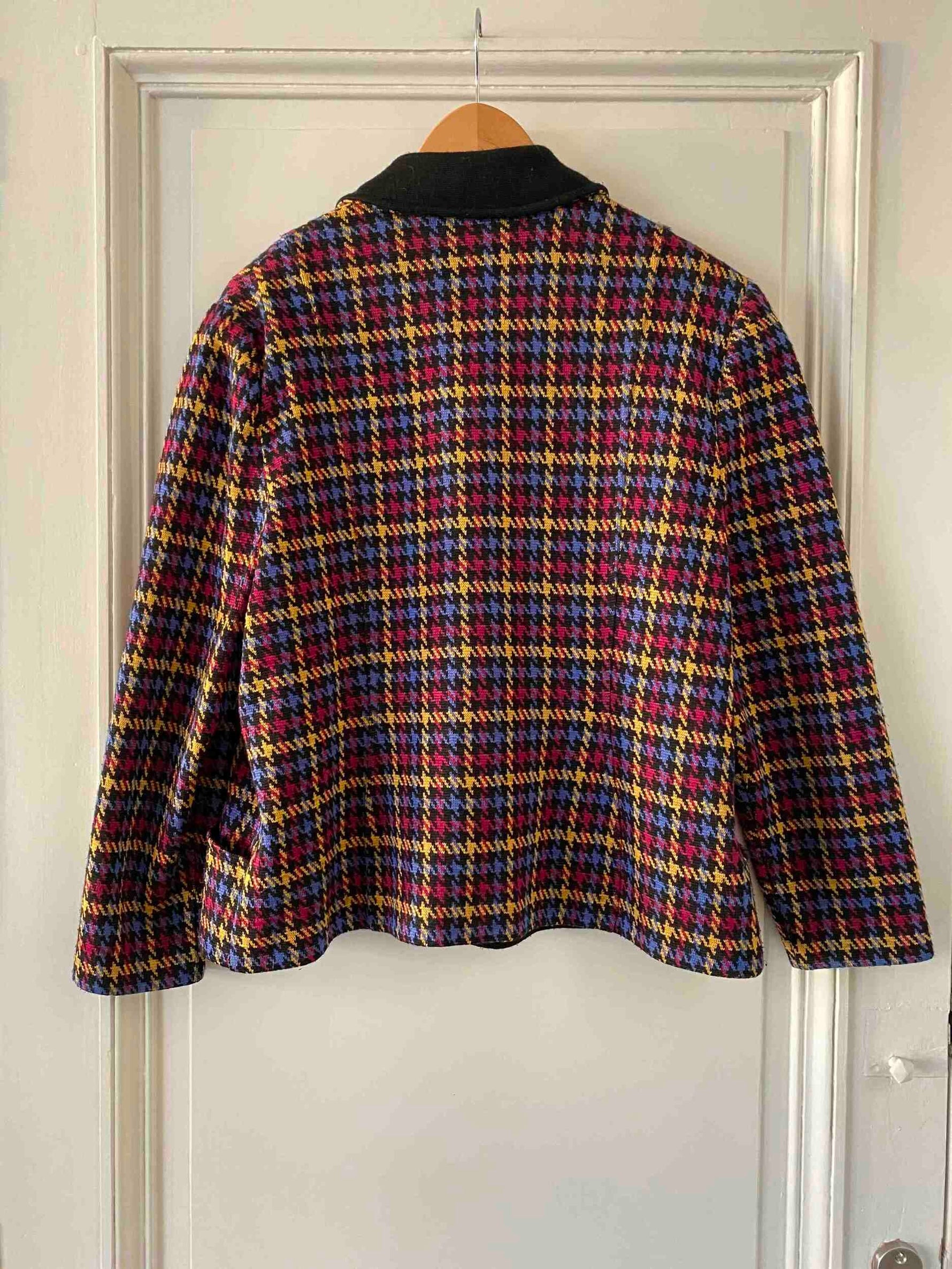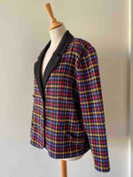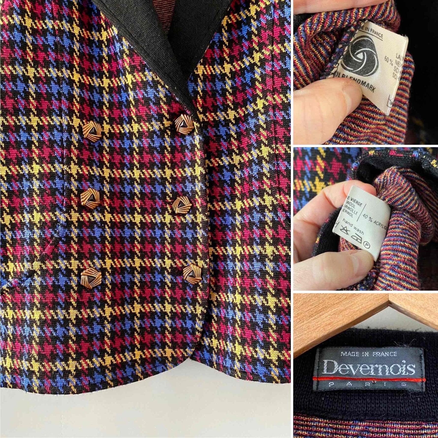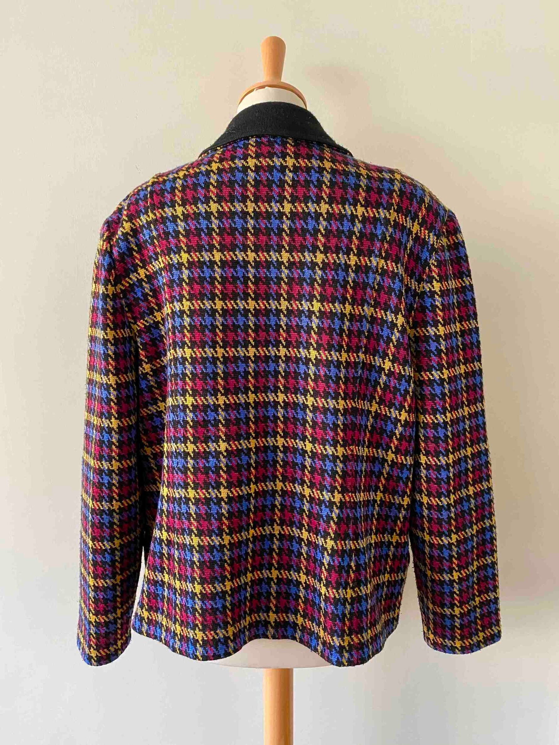 Prix unitaire parBlazer Devernois en laine maille milano intarsia, motif pied de poule multicolore noir, bleu, jaune et fuchsia, col contrasté noir, boutonnage croisé bijoux métalliques dorés et noirs, Fabriqué en France, se porte du 36 au 40