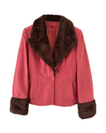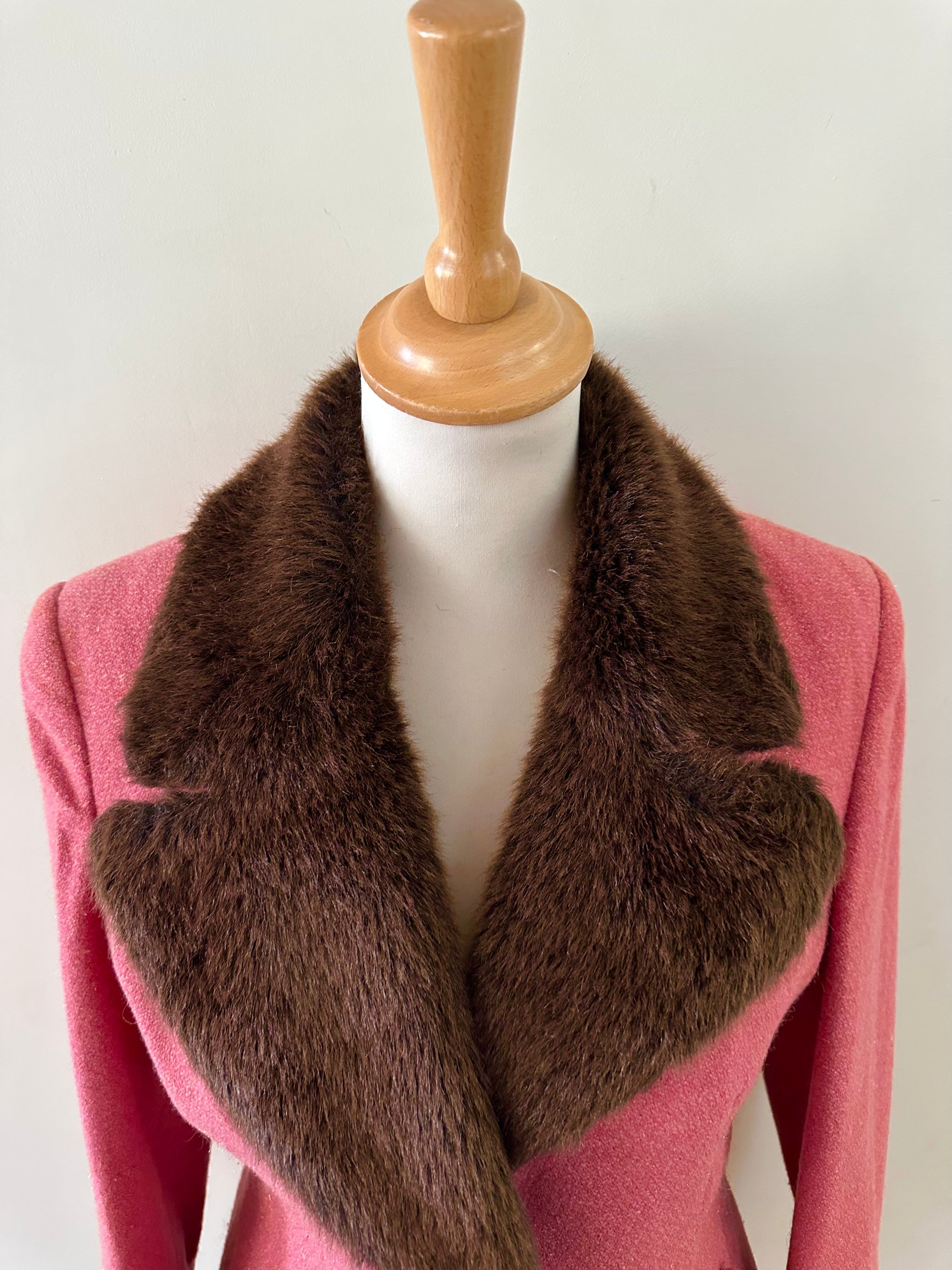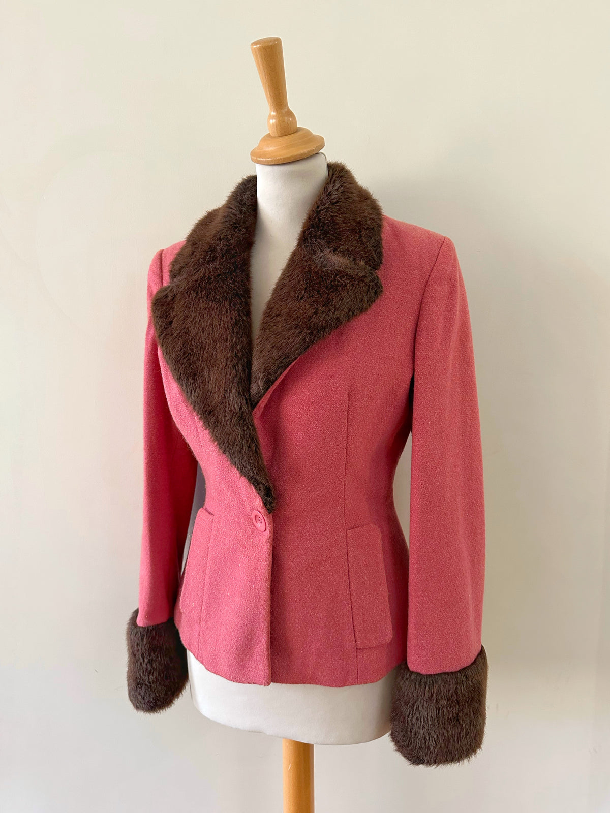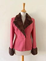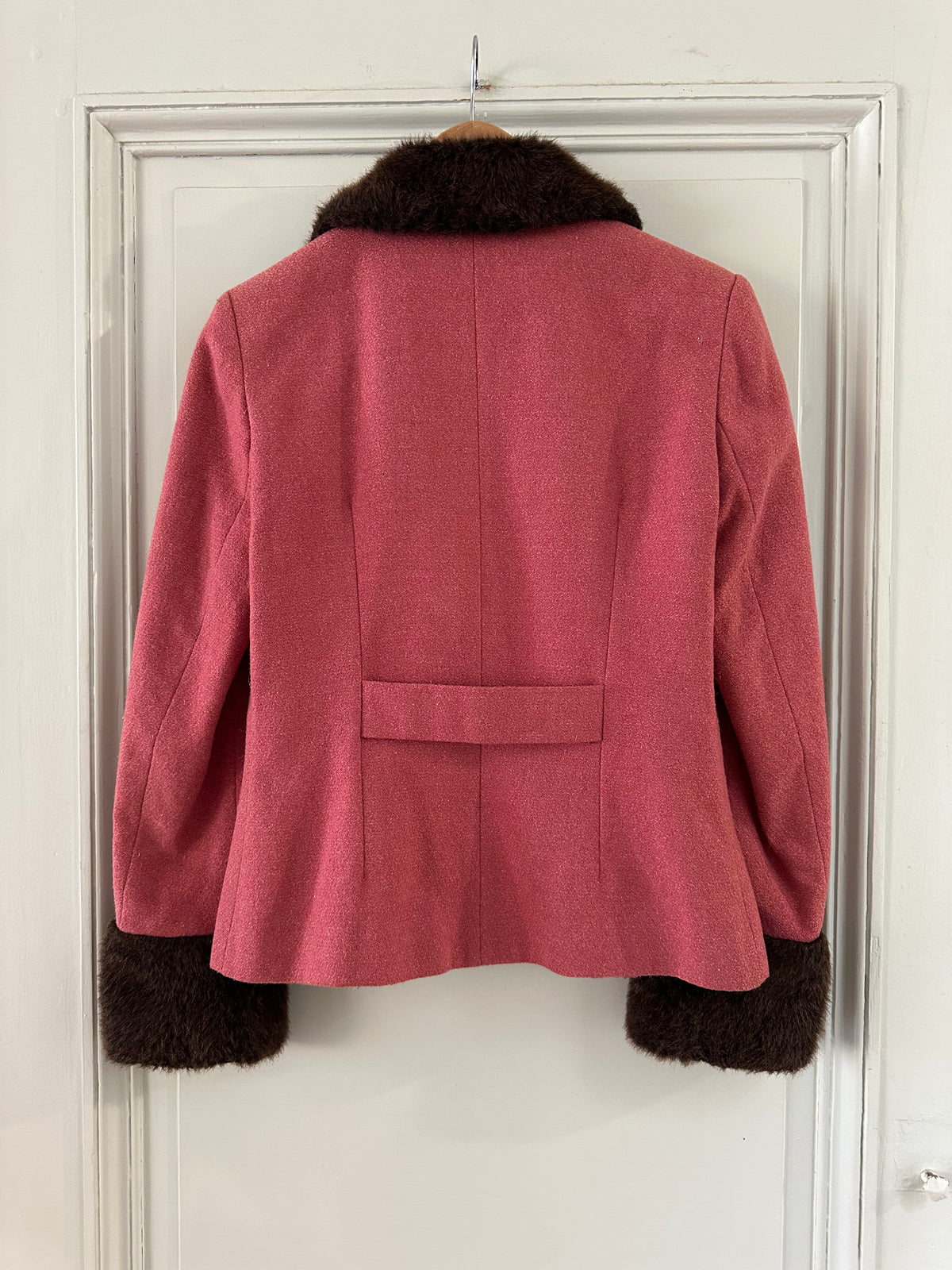 Prix unitaire parBlazer en laine mélangé rose, col et poignets en fausse fourrure chocolat, un bouton à fermer taille, fabriqué en France. Taille 36 porté ici sur un mannequin T36. Longueur 58cm.