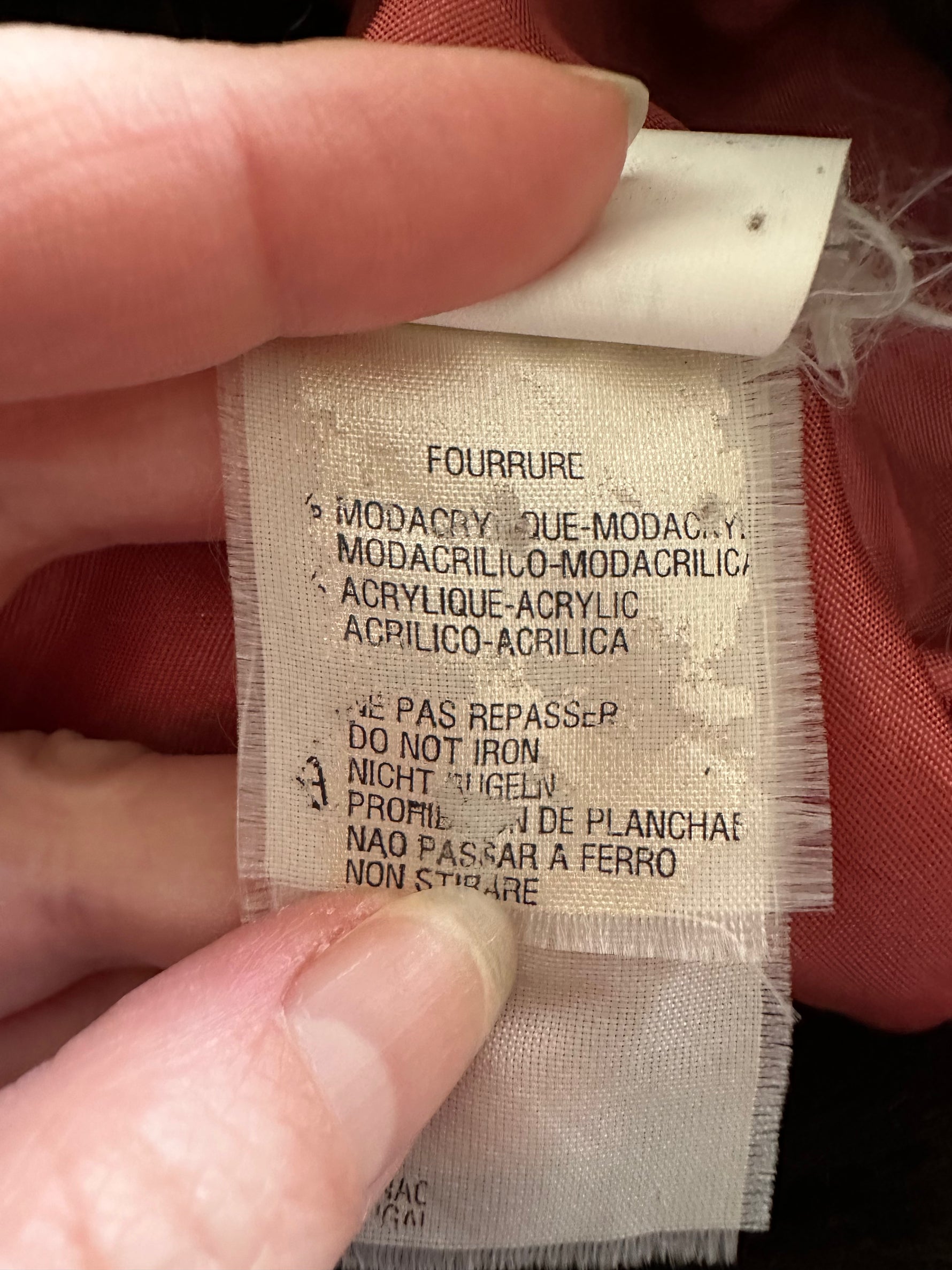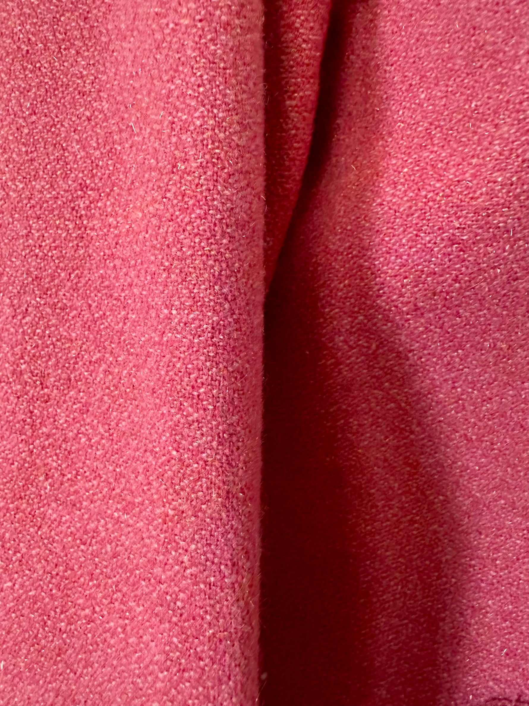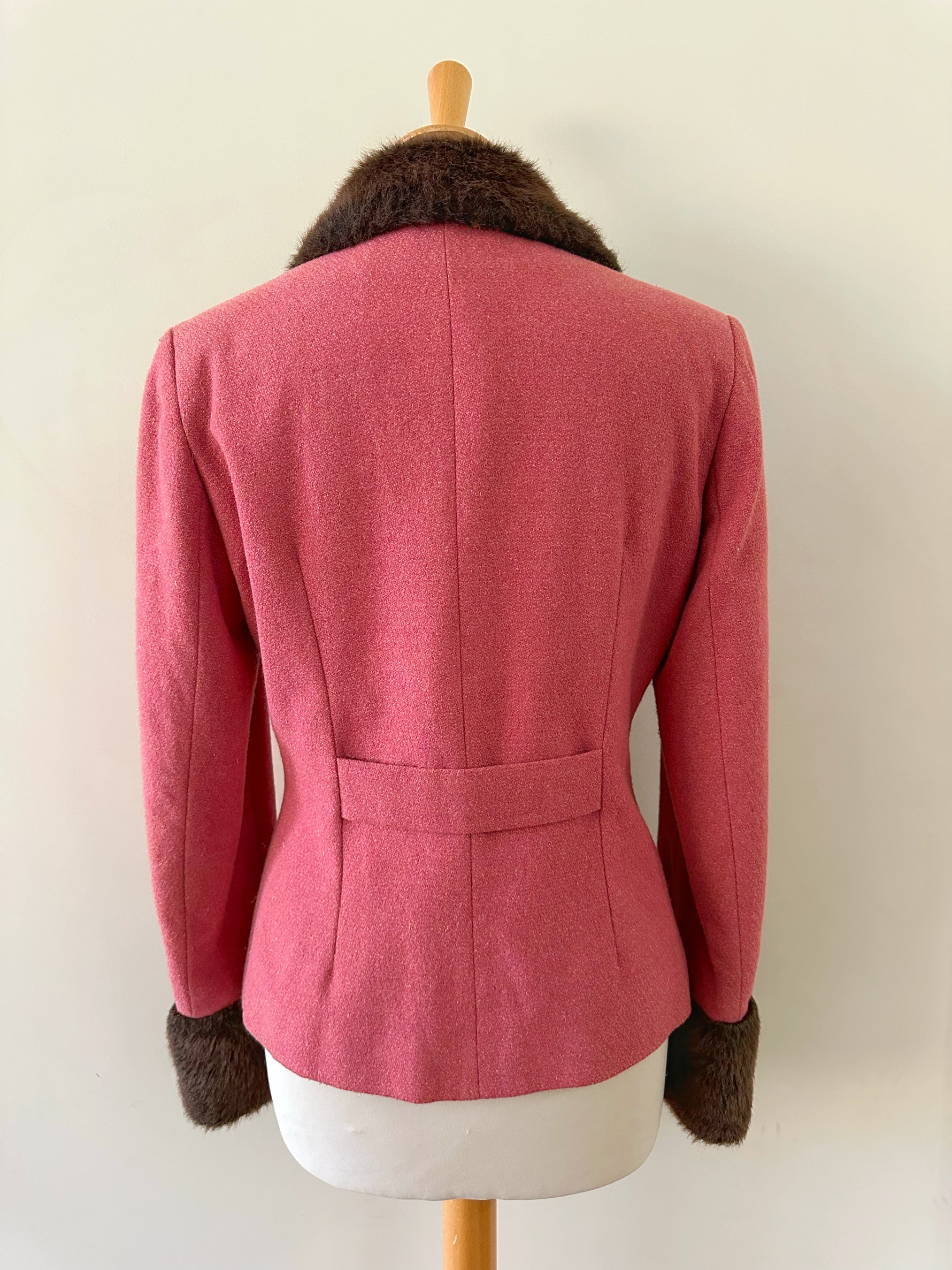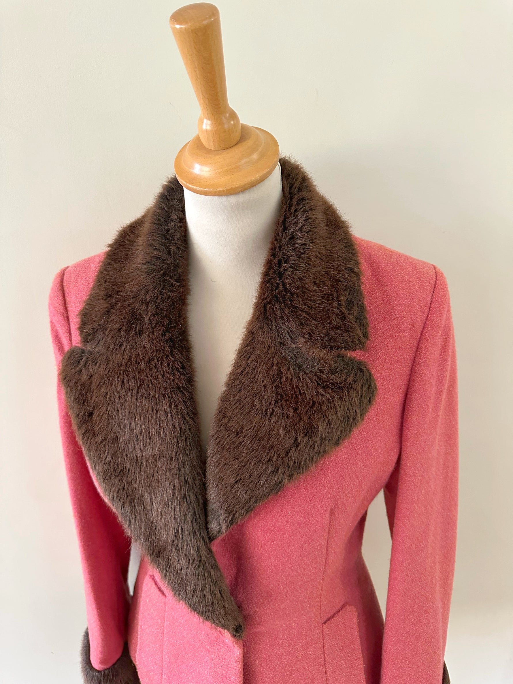 Prix unitaire parBlazer en laine mélangé rose, col et poignets en fausse fourrure chocolat, un bouton à fermer taille, fabriqué en France. Taille 36 porté ici sur un mannequin T36. Longueur 58cm.