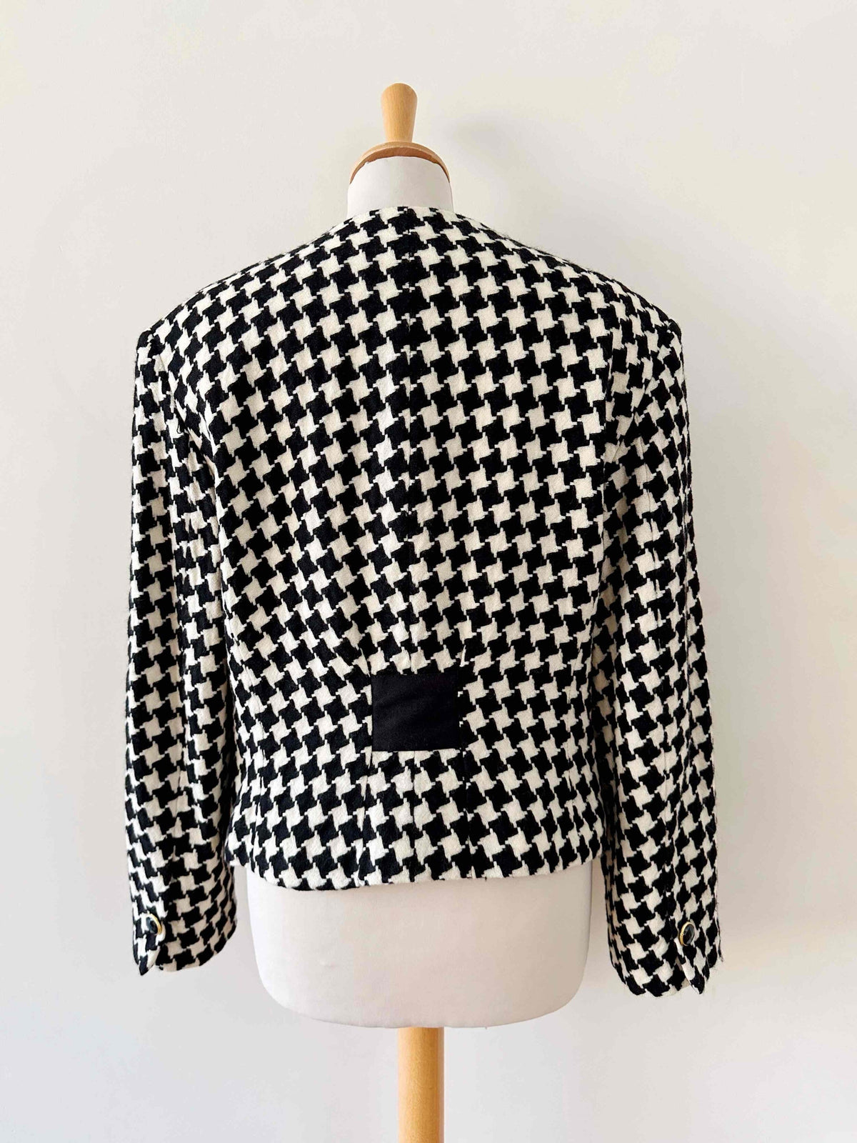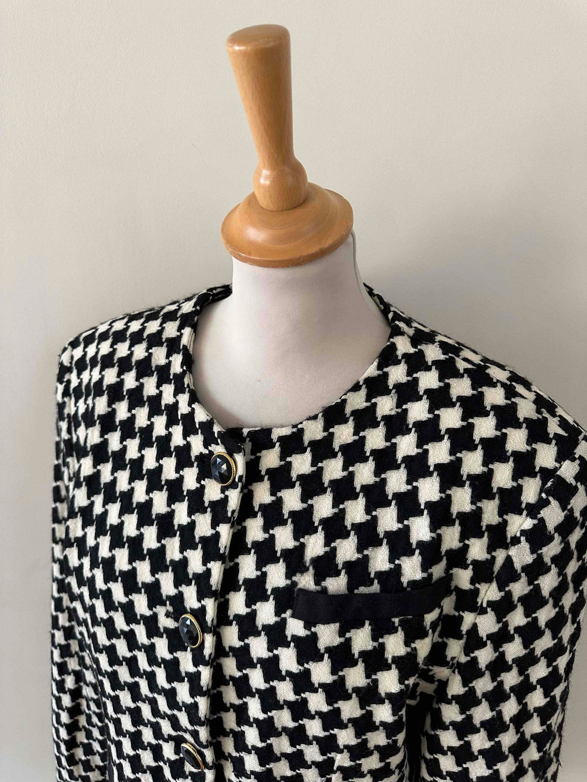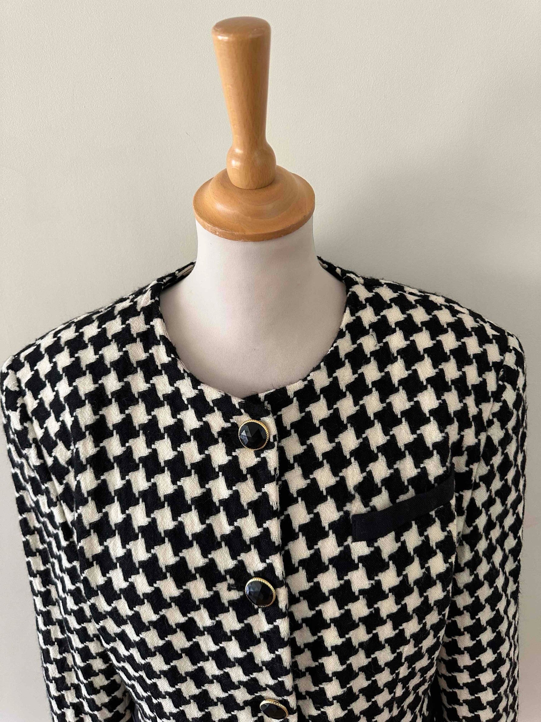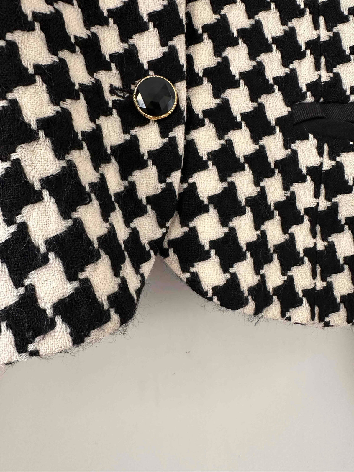 Prix unitaire parBlazer en laine pied de poule tweed blanc et noir, boutons bijoux dorés et strass noirs, forme spencer court, taille 36 porté ici sur un mannequin T36.