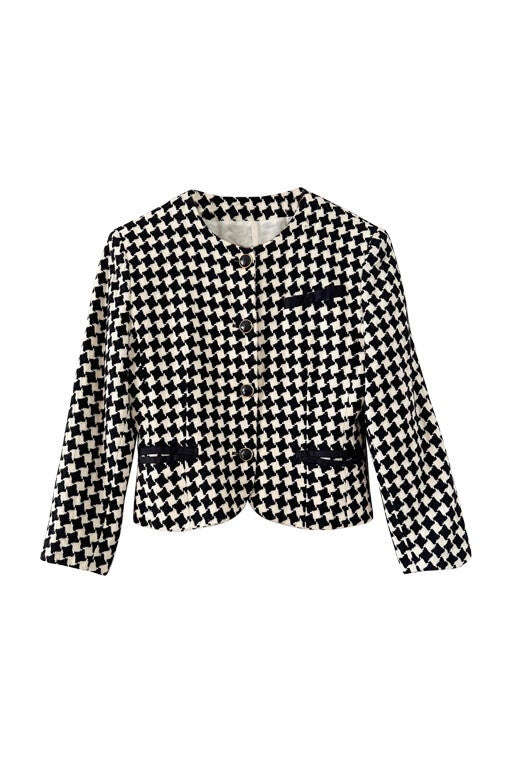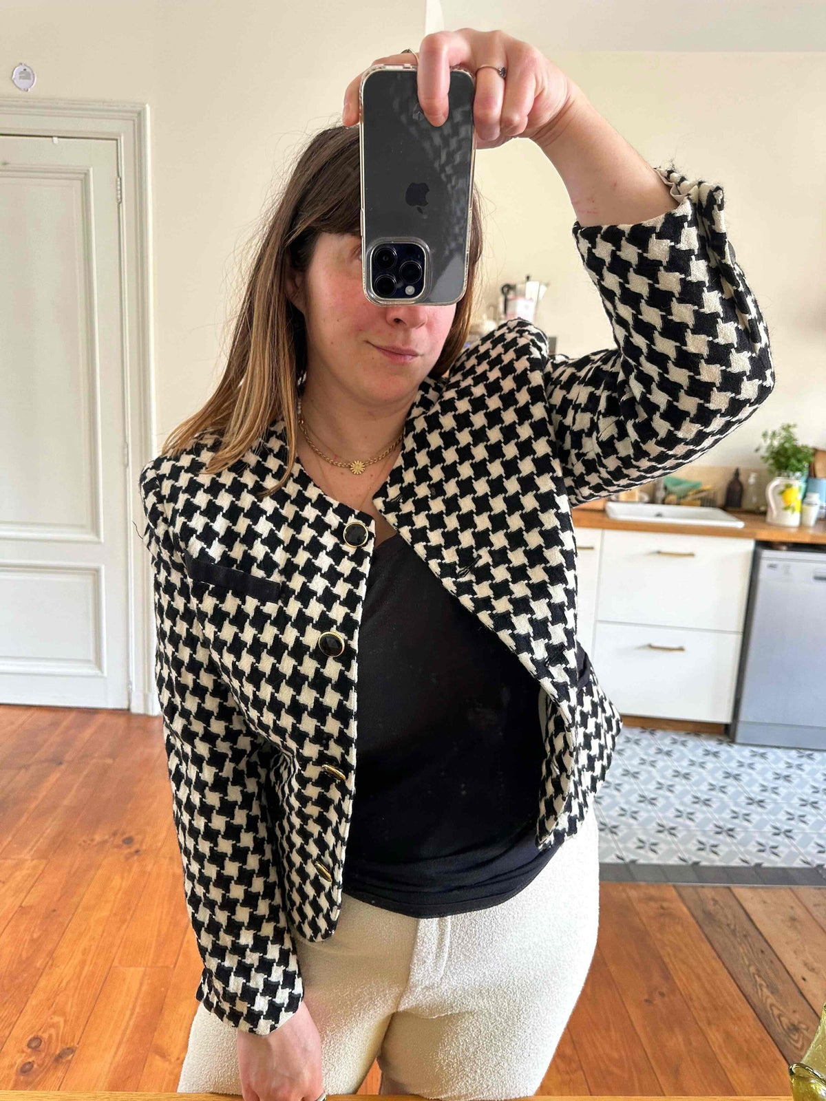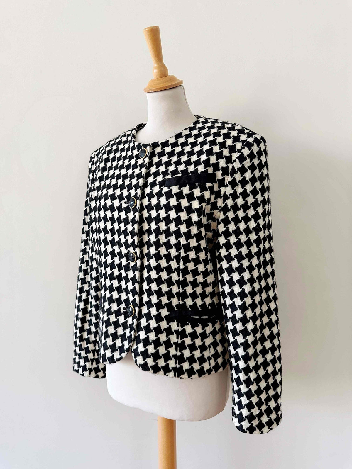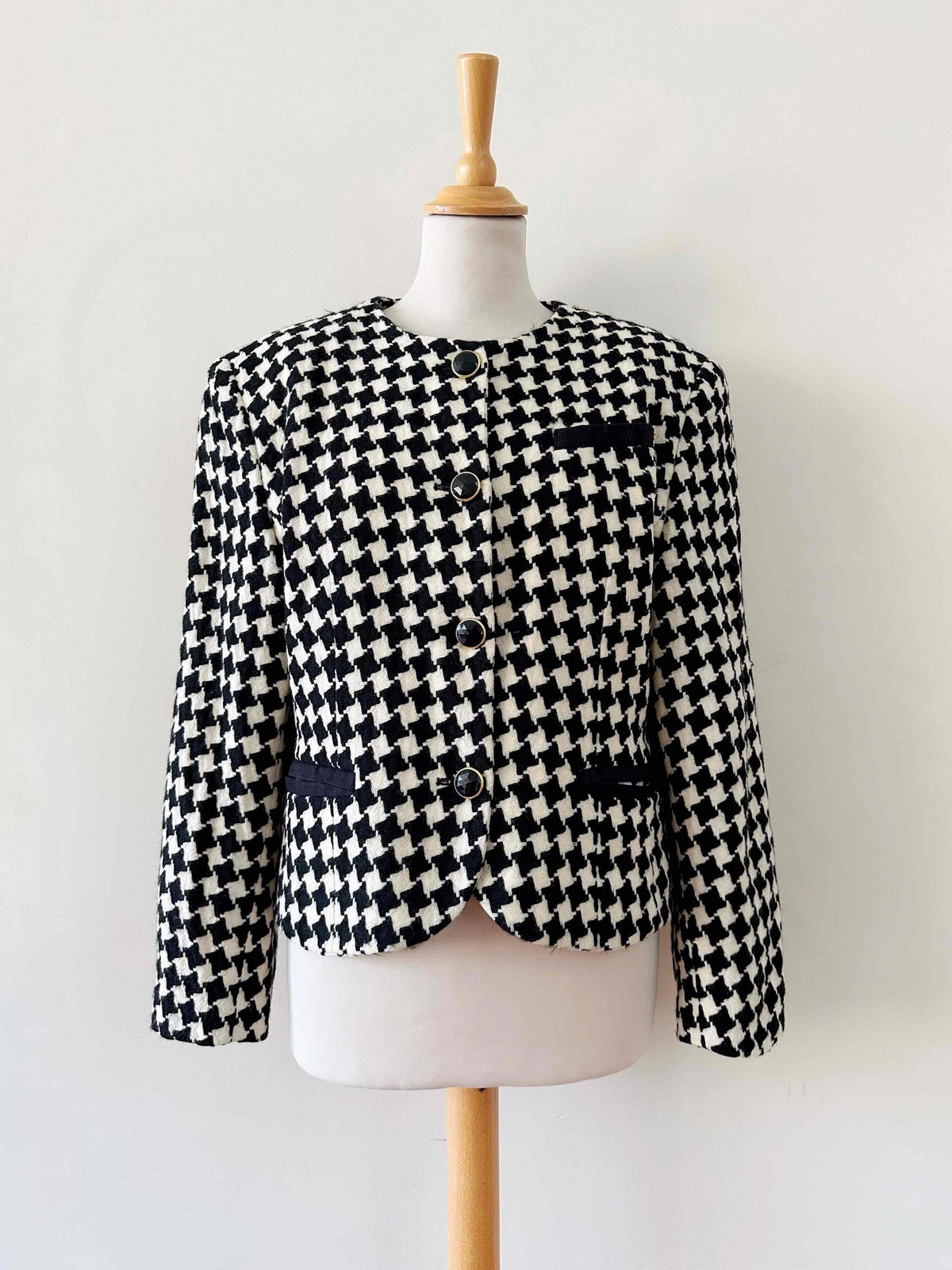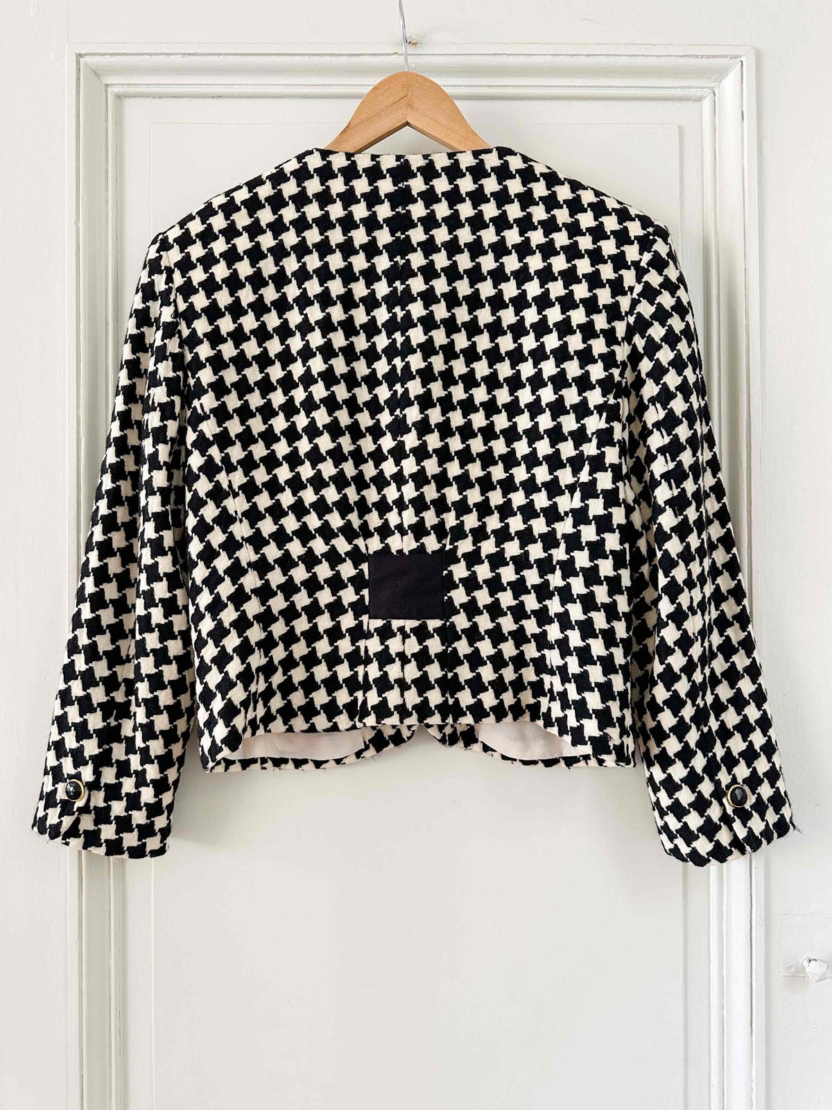 Prix unitaire parBlazer en laine pied de poule tweed blanc et noir, boutons bijoux dorés et strass noirs, forme spencer court, taille 36 porté ici sur un mannequin T36.