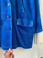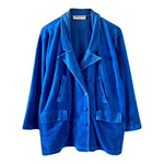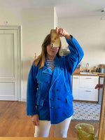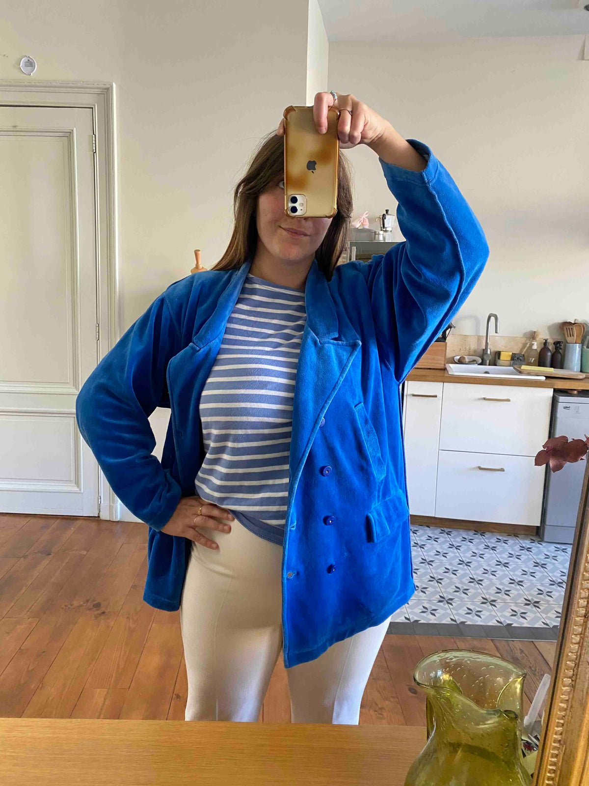 Blazer Sonia Rykiel en velours ras de coton bleu électrique, forme blazer saharienne, boutonnage croisé, couture apparentes typique de la maison Rykiel, fabriqué en France, taille 40 portée ici sur une personne T40, aussi belle fermée qu’ouverte.