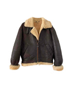 Bombardier en peau lainée en mouton retourné extérieur cuir chocolat noir, intérieur mouton écru naturel, type B3, fabriqué en France, taille 40 ou 38 oversize porté ici sur une personne T40.