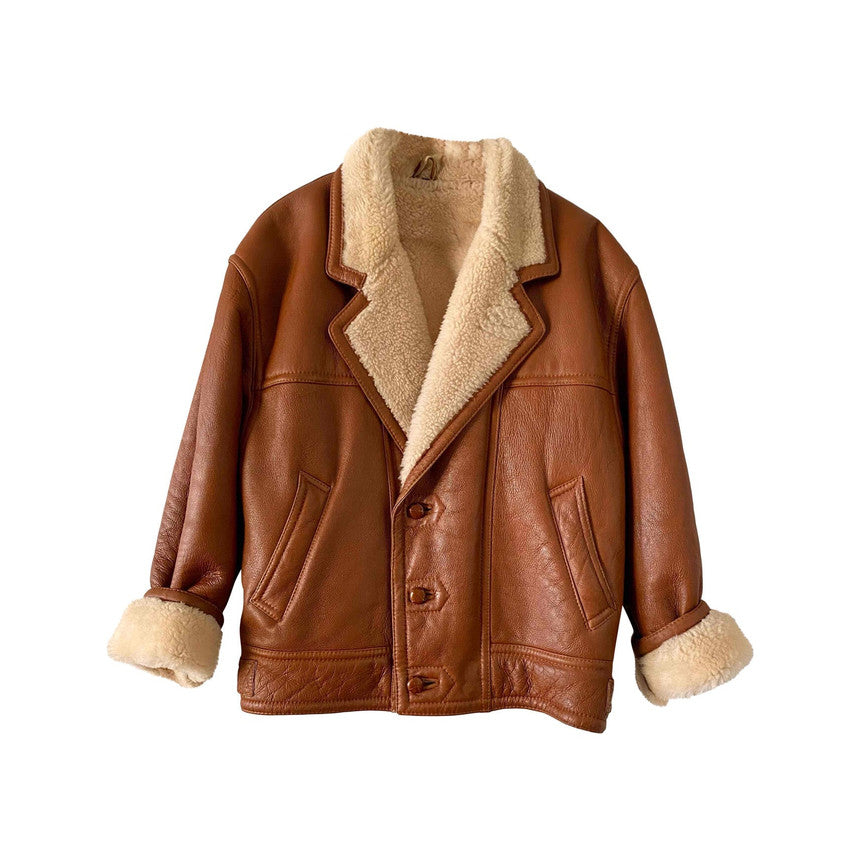 Prix unitaire parBombardier peau lainée en mouton retourné extérieur cuir caramel, intérieur mouton écru, grand col retourné, boutons en cuir, forme droite, pattes de serrages à bohtons sur les côtés, shearling original, taille 38 porté ici sur un mannequin T36 et sur une personne T40.