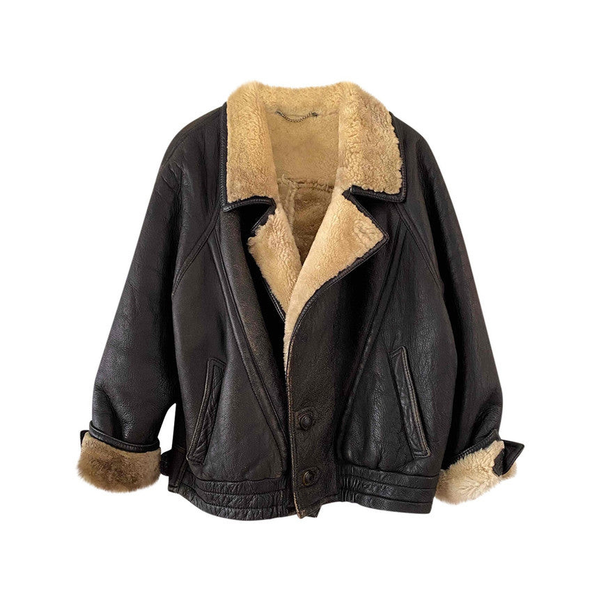 Bombardier peau lainee en mouton retourné extérieur cuir noir, intérieur mouton naturel non-blanchi écru et beige, grand col châle, fermeture par boutons, fabriqué en Italie, taille 40 porté ici sur une personne T40.