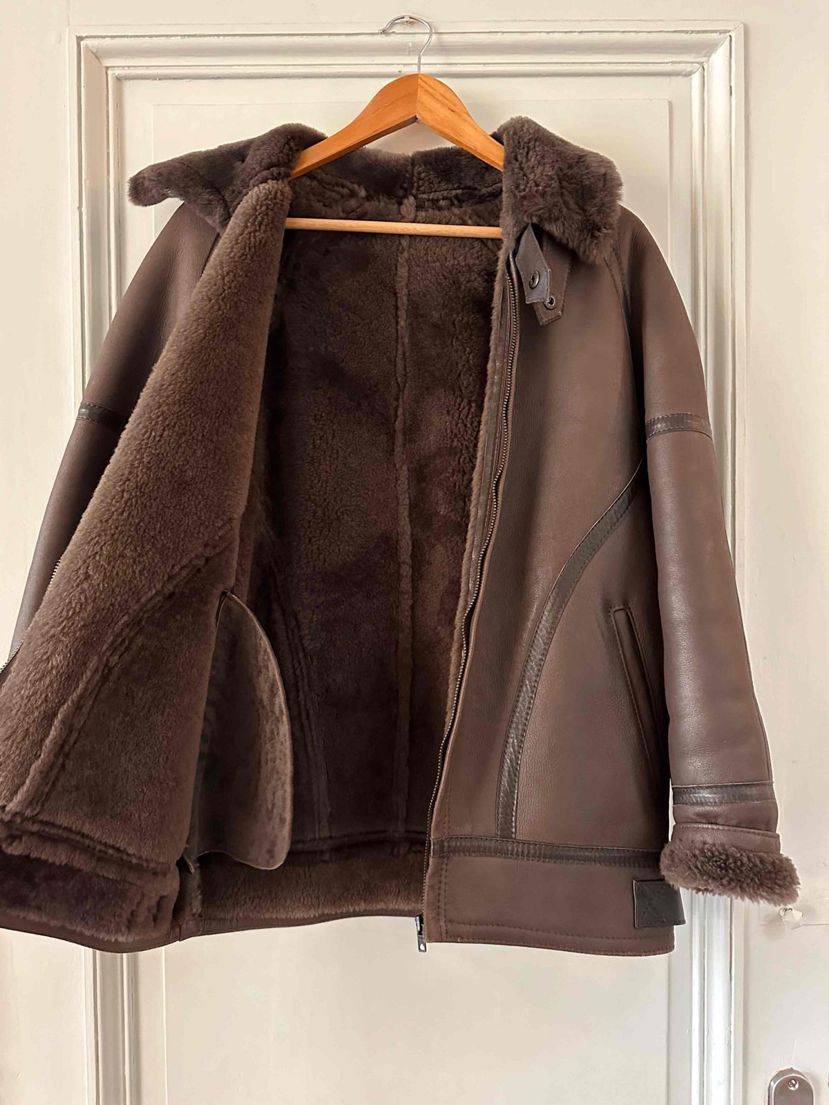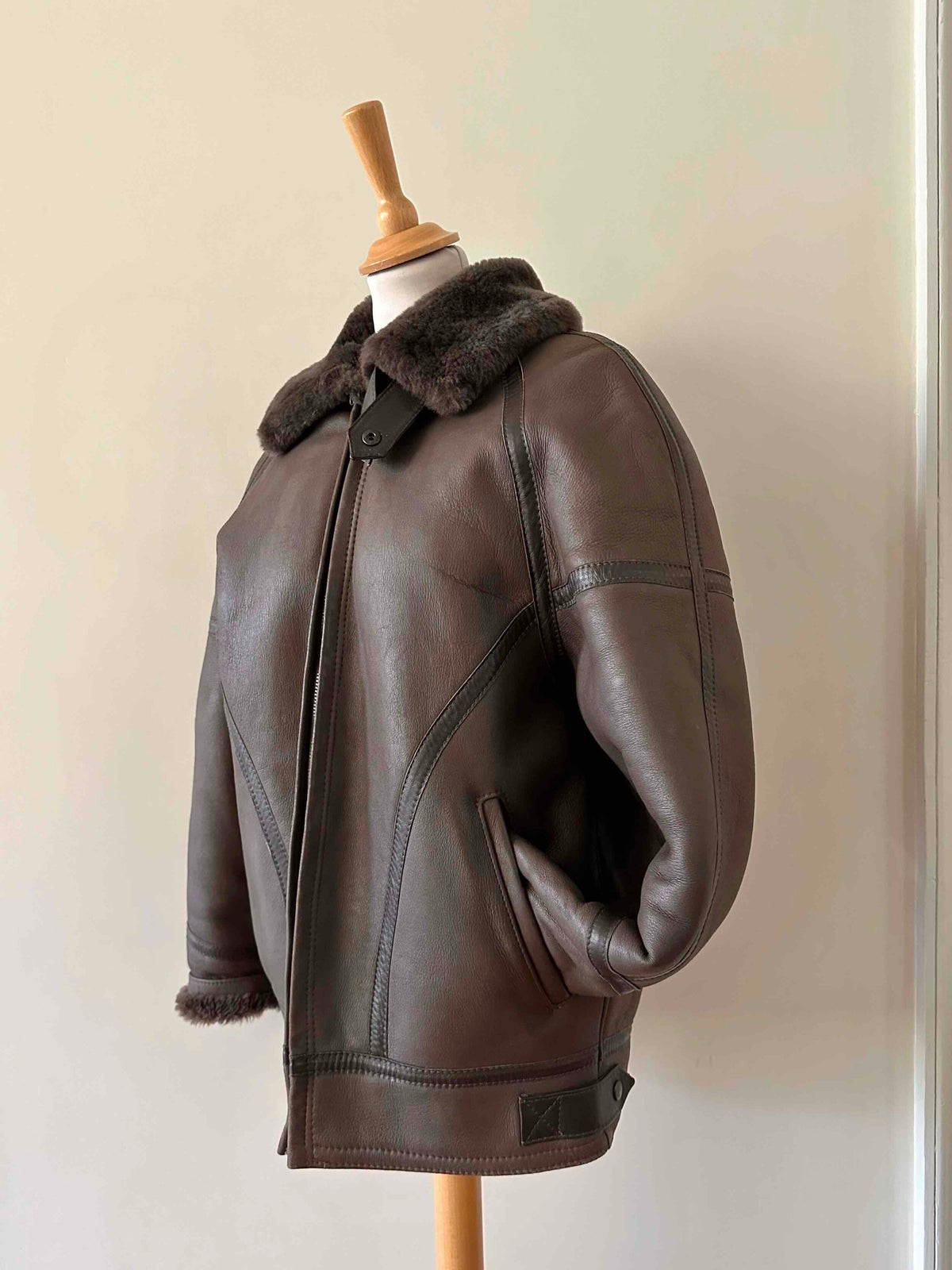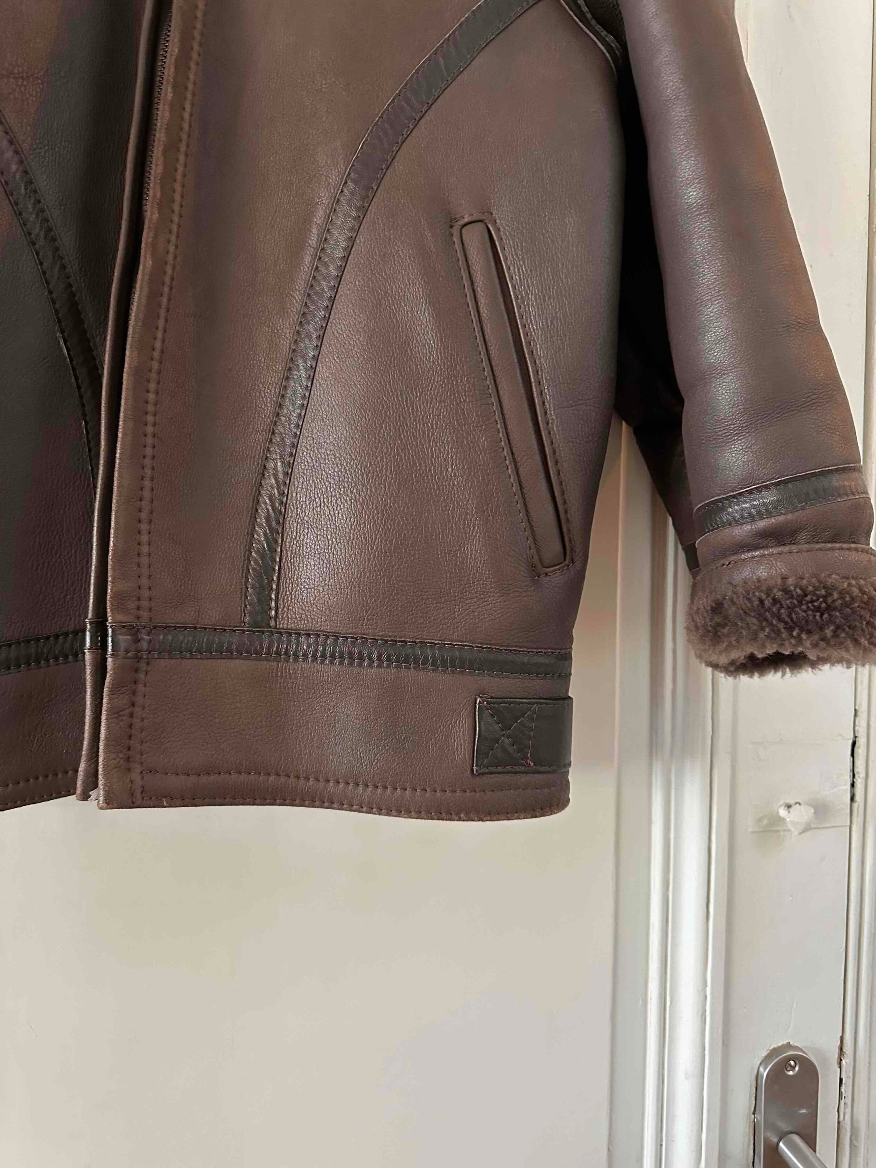 Prix unitaire parBombardier peau lainée en mouton retourné extérieur cuir marron glacé et chocolat, intérieur mouton brun, pattes de serrages à boutons pressions, fabriqué en France, taille 36 porté ici sur un mannequin T36 et ouvert sur une personne T40, hanches à plat 47cm.