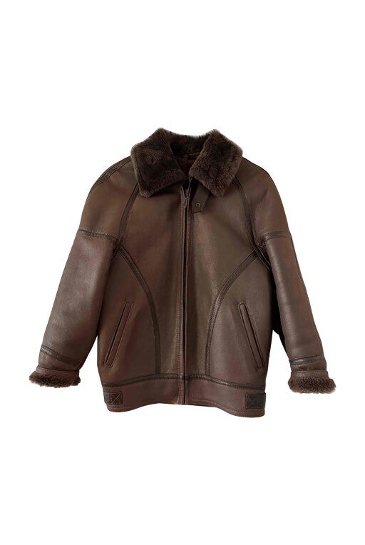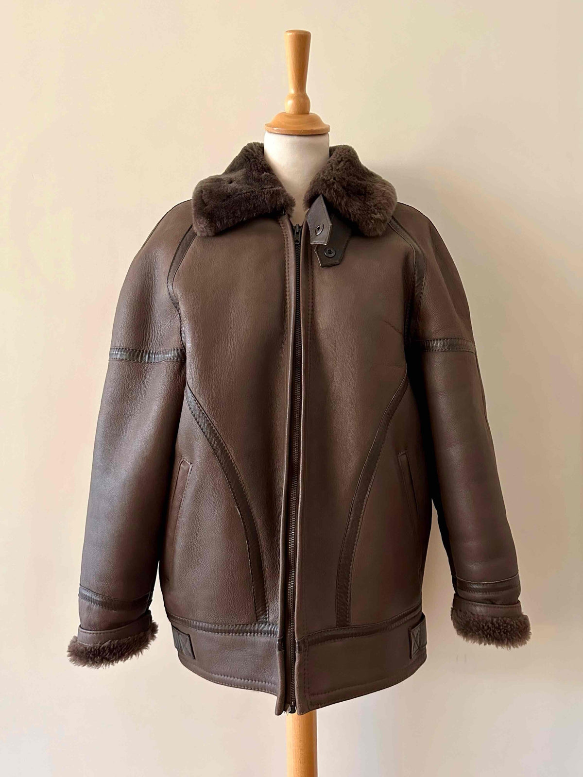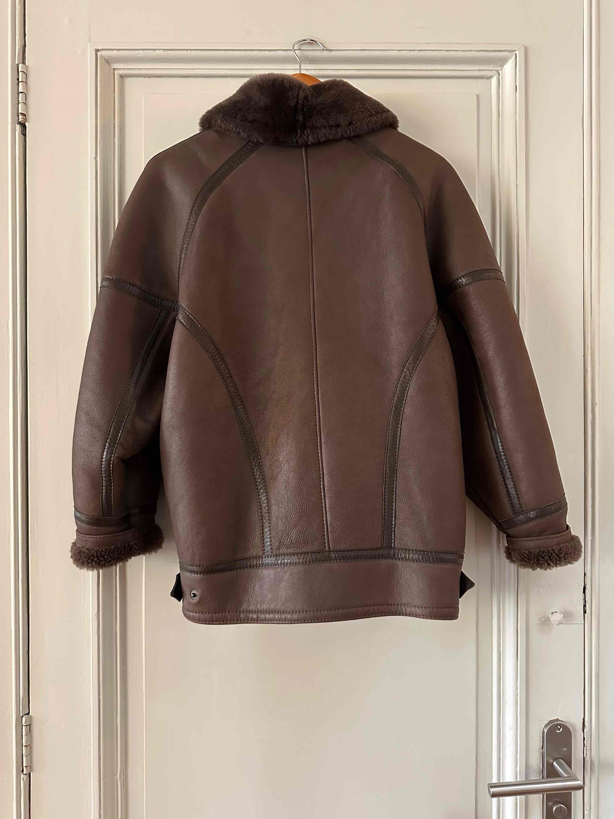 Prix unitaire parBombardier peau lainée en mouton retourné extérieur cuir marron glacé et chocolat, intérieur mouton brun, pattes de serrages à boutons pressions, fabriqué en France, taille 36 porté ici sur un mannequin T36 et ouvert sur une personne T40, hanches à plat 47cm.