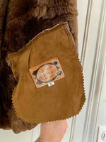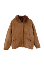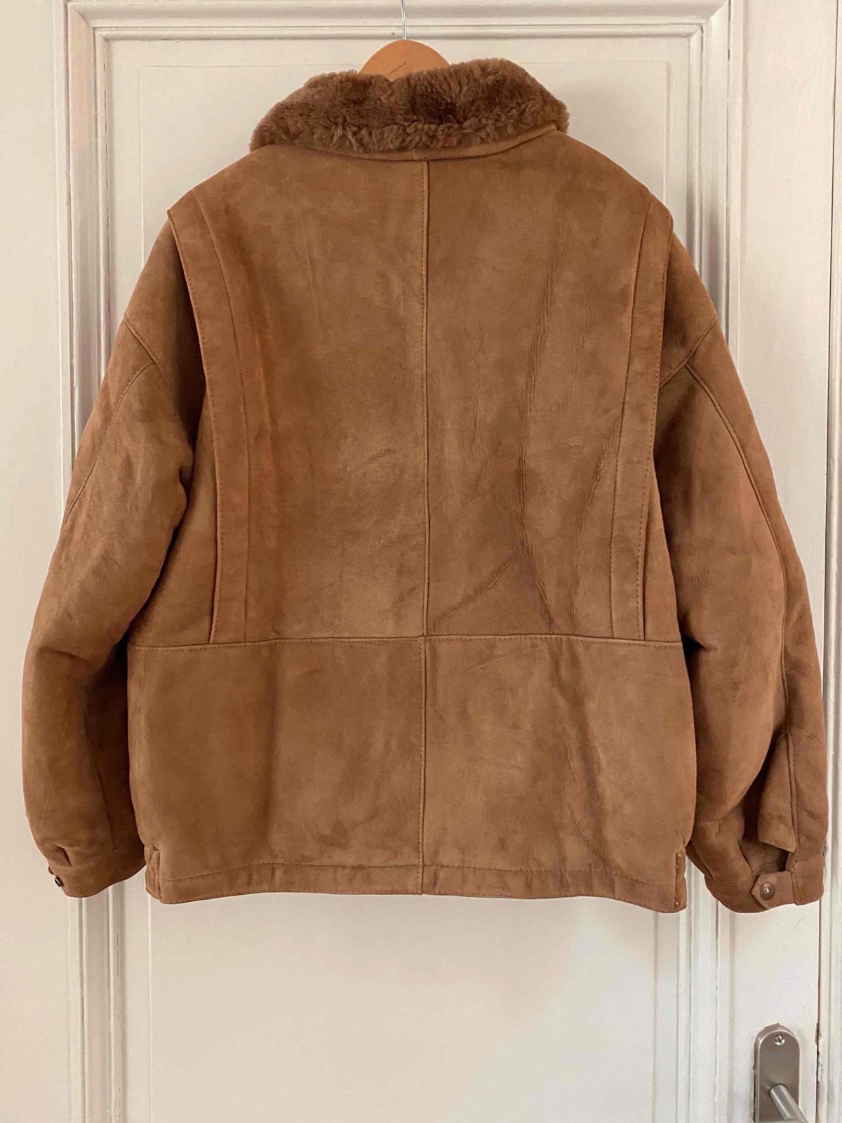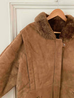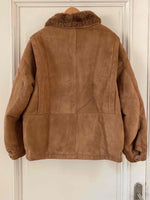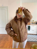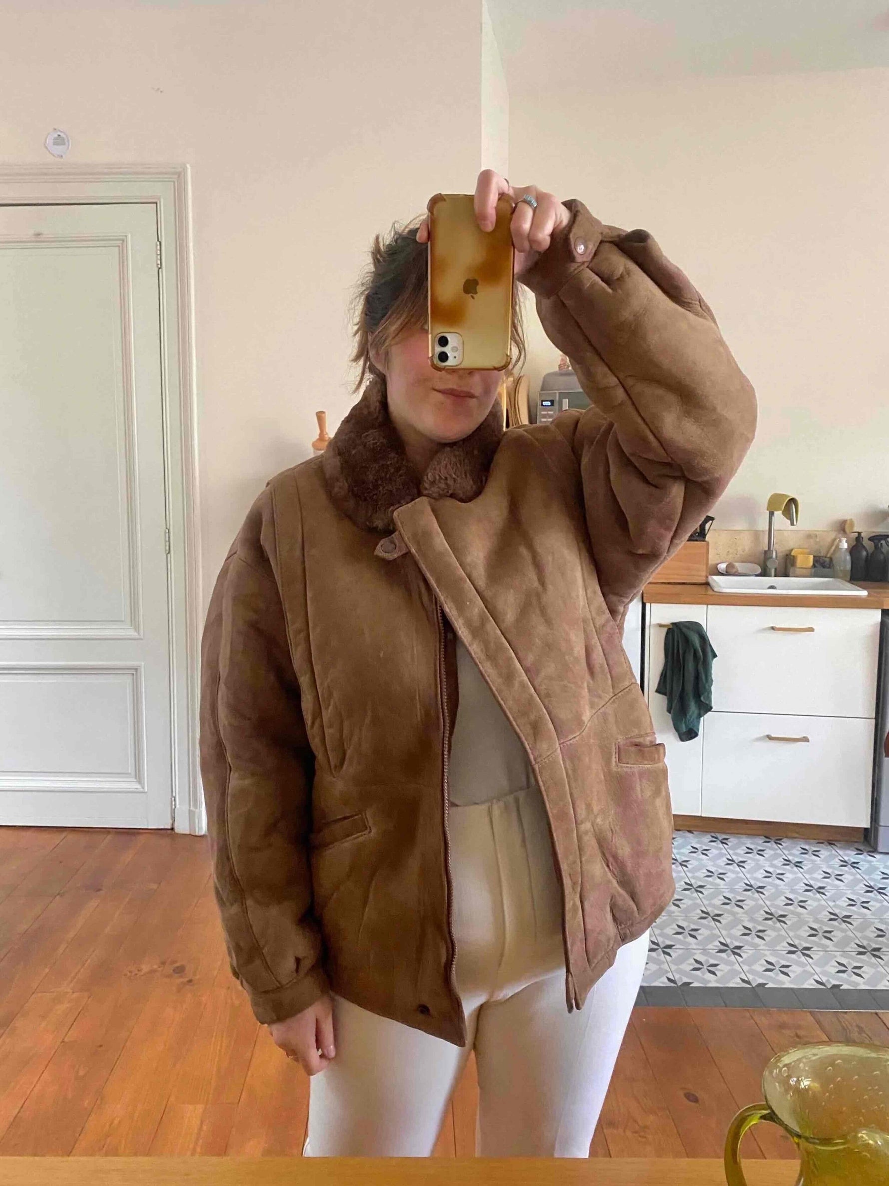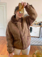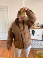 Bombardier en peau lainée, en mouton retourné extérieur daim camel et intérieur mouton camel. Forme en blouson, col claudine mouton, découpes aux épaules, fabriqué au Canada, taille 40 porté ici sur une personne taille 40.