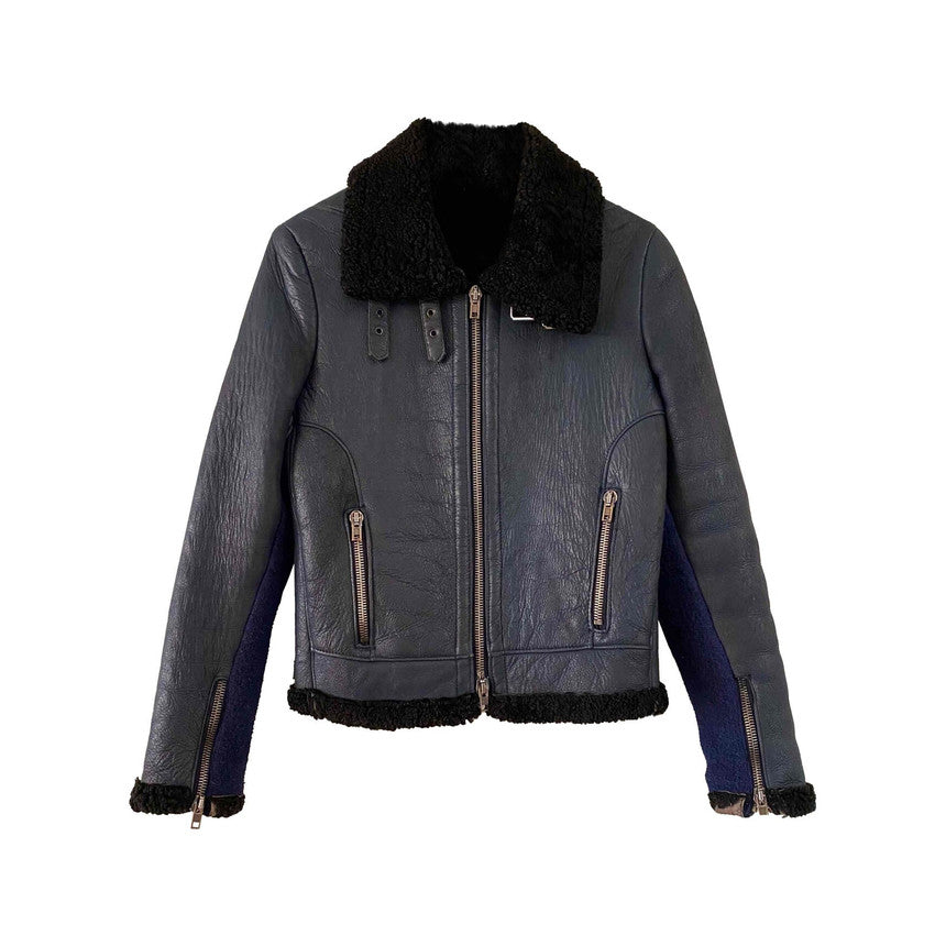 Bombardier en peau lainée, en mouton retourné extérieur cuir bleu nuit, intérieur mouton noir, dessous des manches en laine peignée bleue nuit, détails de zip argentés, fabriqué en Italie, taille 36 porté ici sur un mannequin T36.