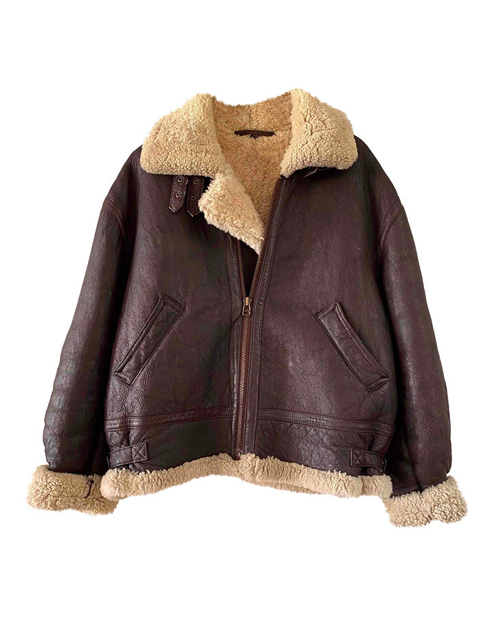 Bombardier peau lainée en mouton retourné extérieur cuir chocolat, intérieur mouton écru, sangles de serrages à boucles, type B3, taille 40 porté ici sur une personne T40.