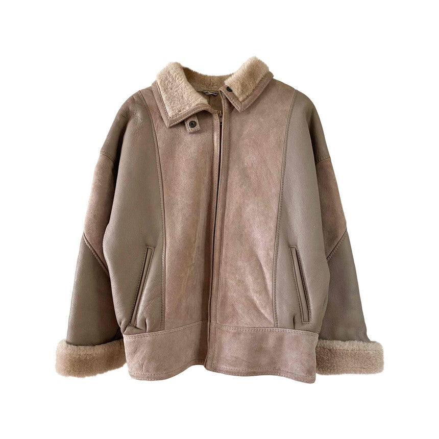 Bombardier peau lainée en mouton retourné extérieur cuir et daim en patch beige grisé taupe, intérieur mouton beige, forme blouson, manches chauve-souris, fermeture éclaire, fabriqué en France, taille 38 porté ici serré sur une personne T40.