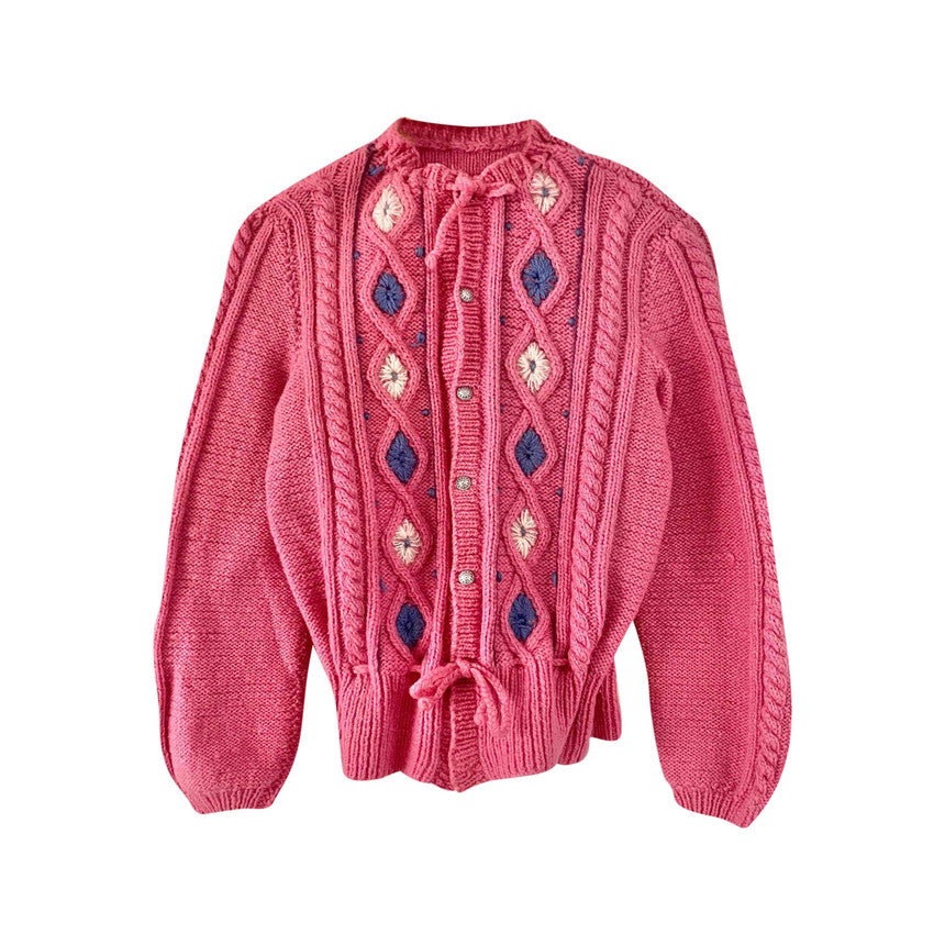 Cardigan autrichien en laine rose bubblegum brodé de fleurs lilas, blanches et liserés violets, boutons bijoux argentés, col et taille à nouer par un cordon, manches ballon.