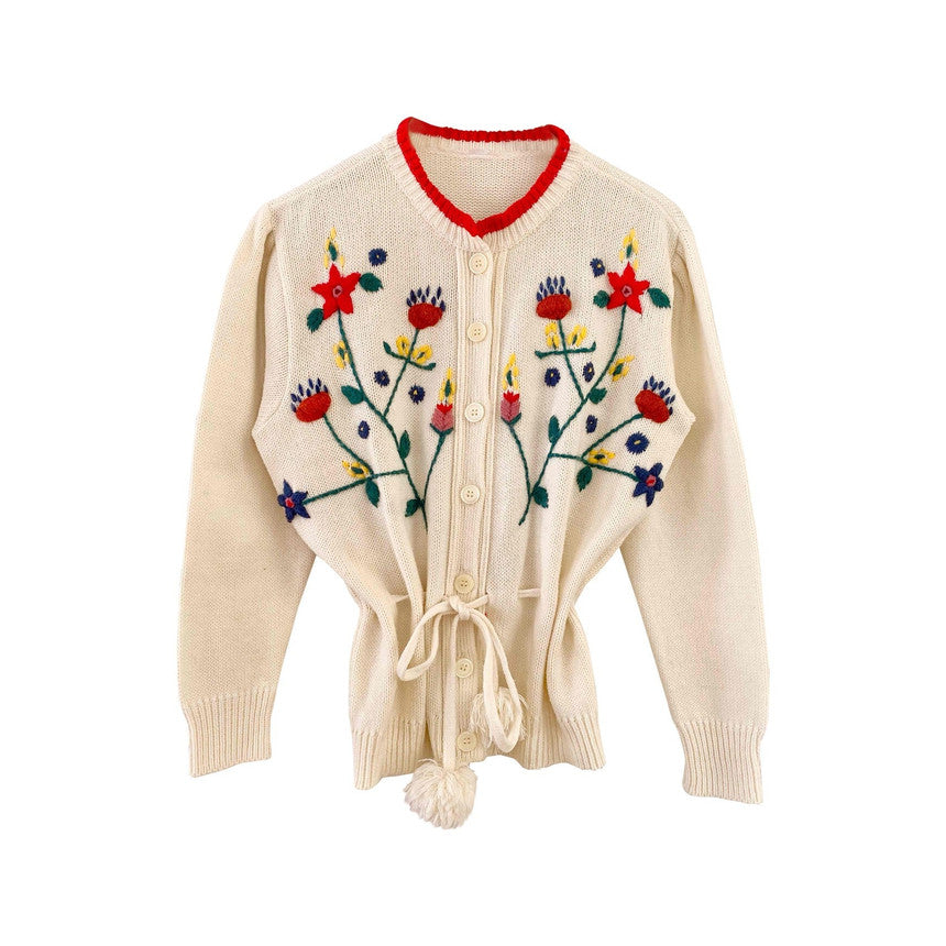 Cardigan autrichien en laine mélangée écrue plastron brodé de fleurs multicolores.