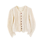 Cardigan Autrichien en laine et mohair écru, maille ajourée dentelle et torsades, finitions bordures vaguelettes, boutons bois, manches ballons, tricoté main en Autriche.