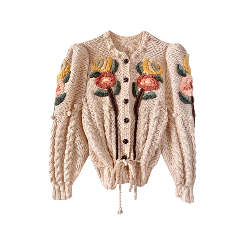 Prix unitaire parCardigan Autrichien en pure laine écrue, maille popcorn pompons brodés et torsades, brodé de fleurs esprit tapisserie dans les tons pastels roses, vert amande, jaunes et chocolat, boutons effet cuir, cordon torsadé à nouer taille, manches ballons xl, pièce unique tricottée et brodé mains en Autriche, taille 40 porté ici sur une personne T40.