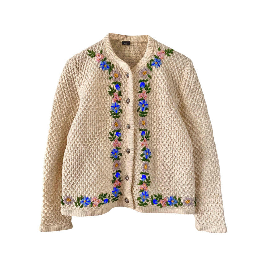 Prix unitaire parCardigan autrichien en pure laine écrue maille nid d'abeille croisillons, brodé de fleurs multicolores pastels, lilas, roses, jaunes, bleues roi et vertes, boutons bijoux argentés fleuris, fabriqué en Autriche, taille 38 porté ici sur un mannequin T36 et serré sur une personne T40.