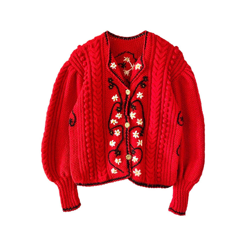 En laine rouge vermillon, brodé de fleurs noires, blanches et jaunes.