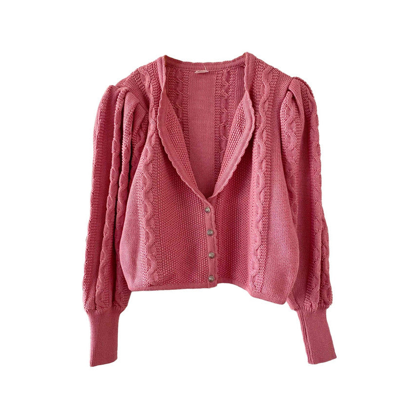 Cardigan Autrichien, en pure laine rose poudré, forme cropped, col V plongeant, manches ballons torsadées, boutons bijoux argentés fleuris, fabriqué en Autriche, taille 38 et 40 porté ici sur une personne T40.
