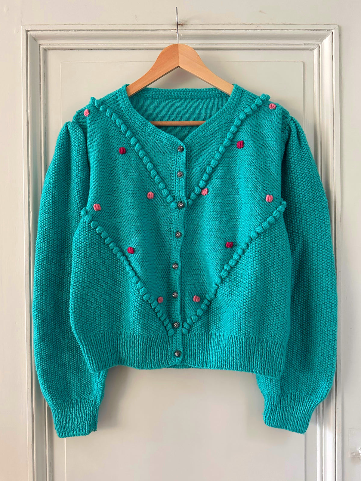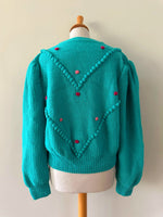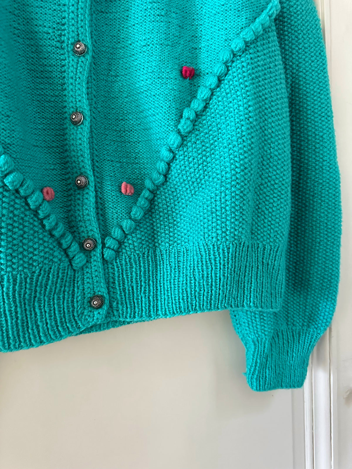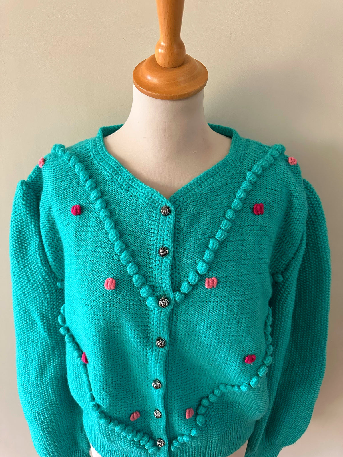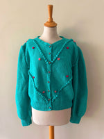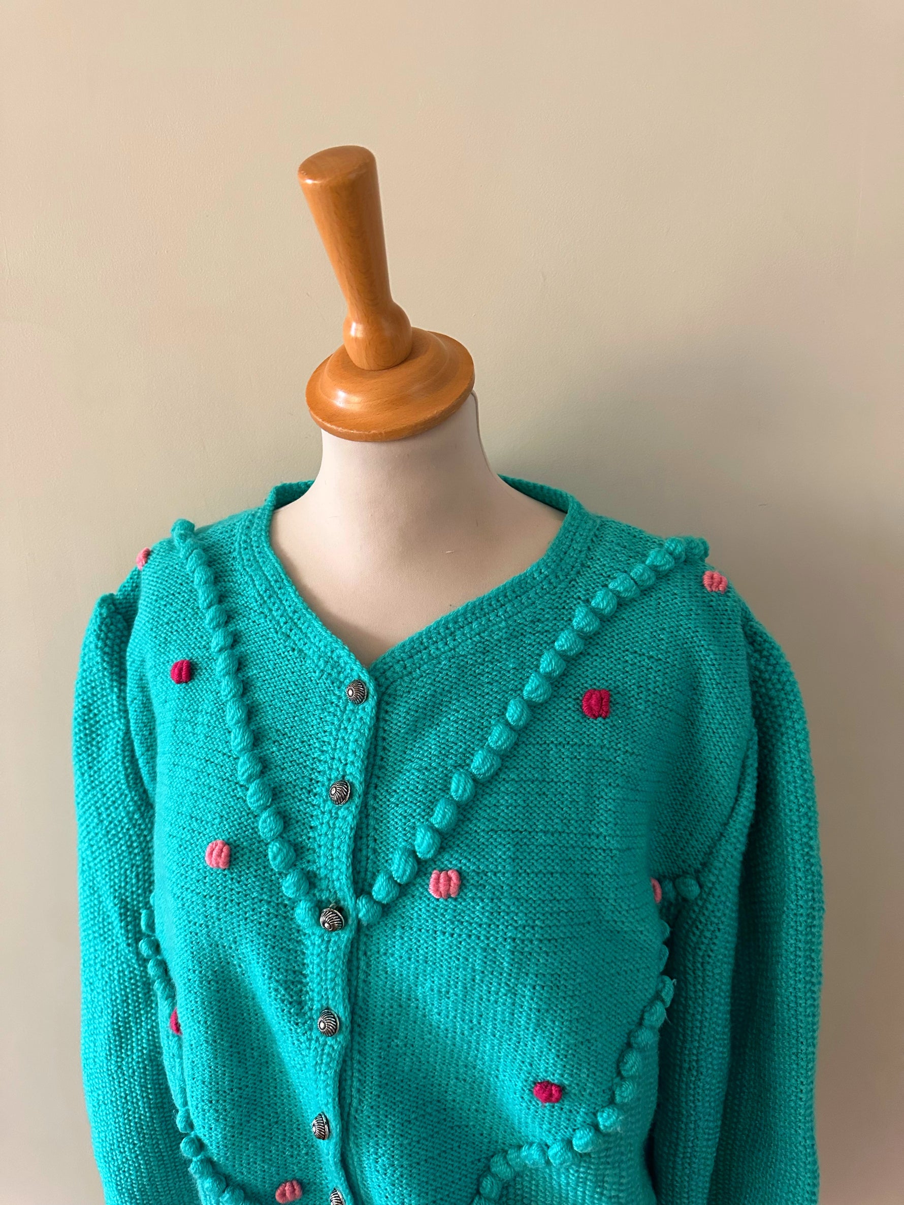 Prix unitaire parCardigan Autrichien en laine vert-bleu turquoise, brodé de fleurs roses et fuschias, pompons brodés, manches ballons, boutons bijoux argentés fleuris, tricoté mains en Autriche. Convient aux tailles 38 et 40 porté ici sur un mannequin T36 et sur une personne T40. Aisselles 50cm Longueur 58cm.