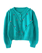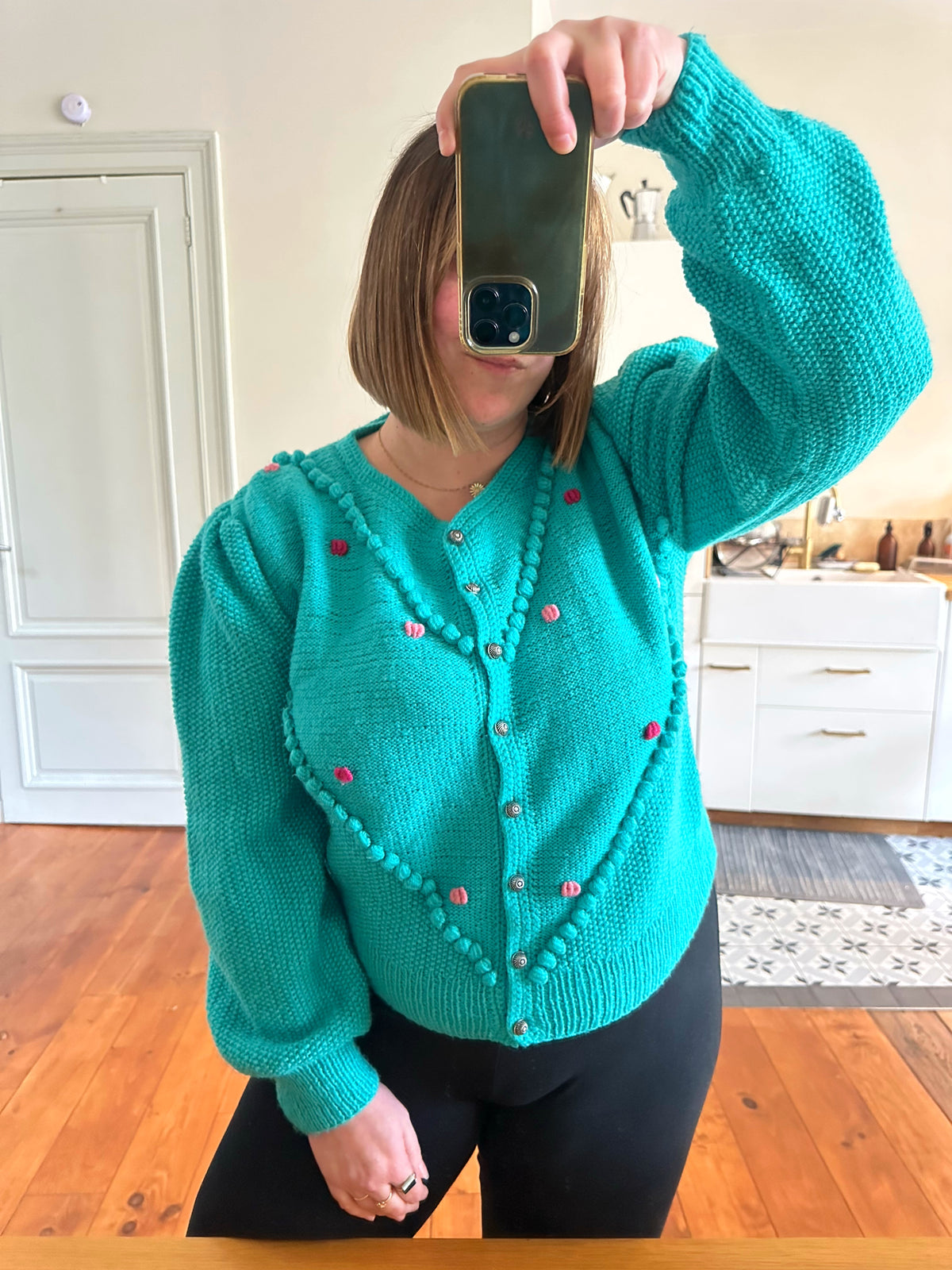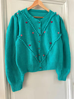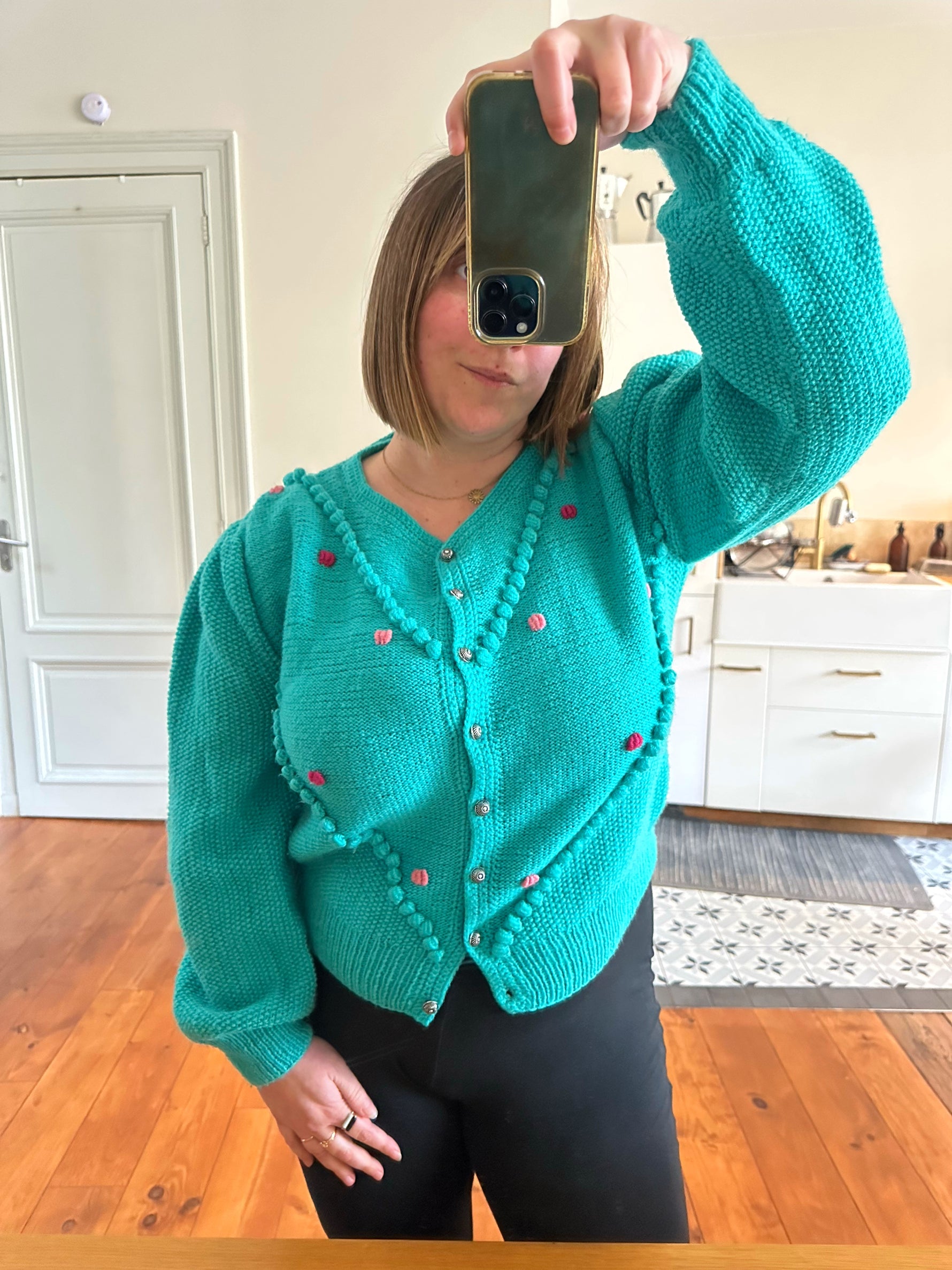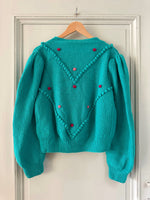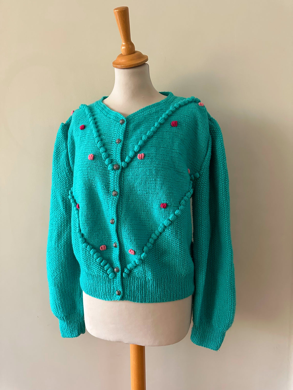 Prix unitaire parCardigan Autrichien en laine vert-bleu turquoise, brodé de fleurs roses et fuschias, pompons brodés, manches ballons, boutons bijoux argentés fleuris, tricoté mains en Autriche. Convient aux tailles 38 et 40 porté ici sur un mannequin T36 et sur une personne T40. Aisselles 50cm Longueur 58cm.