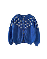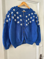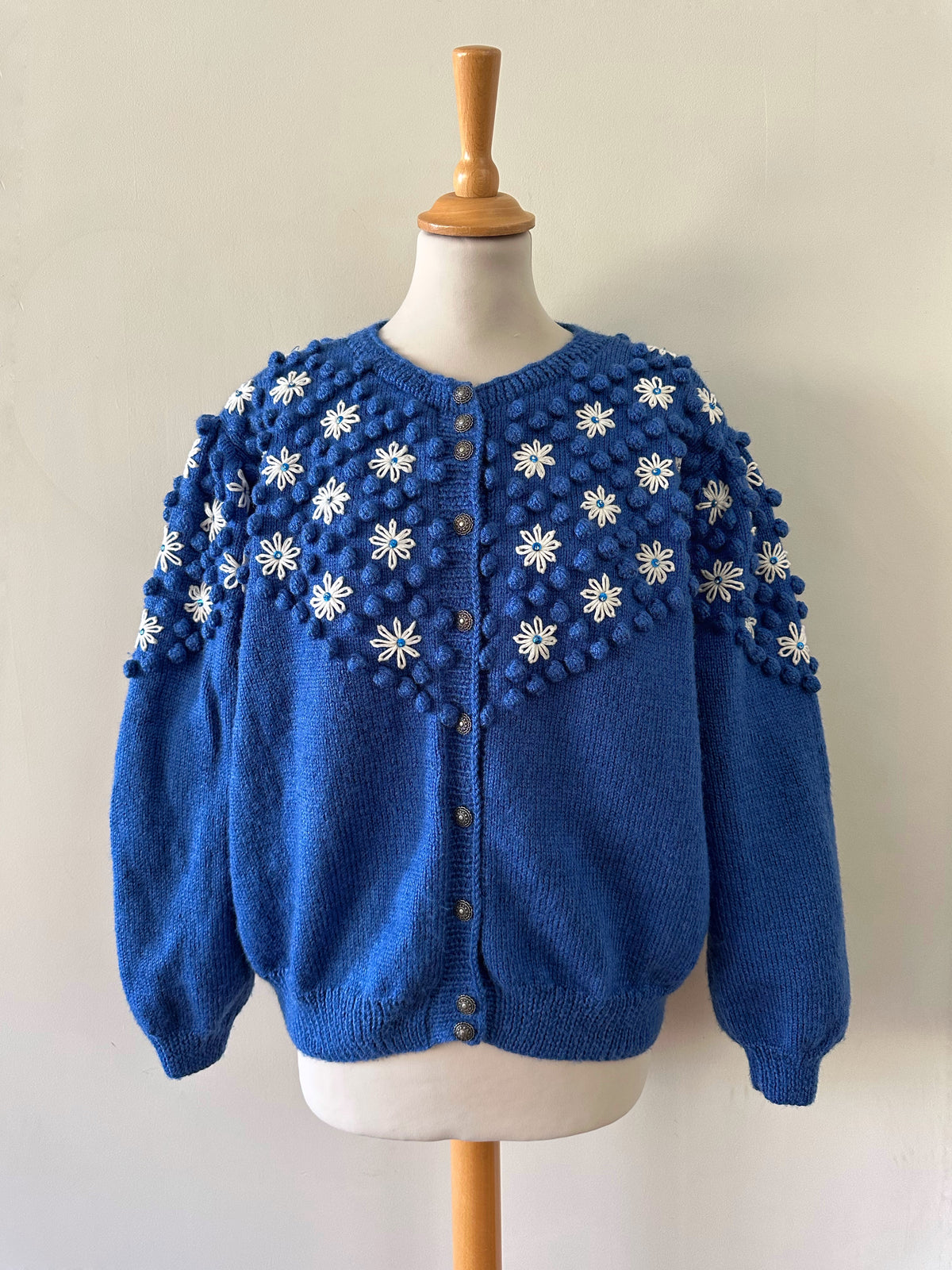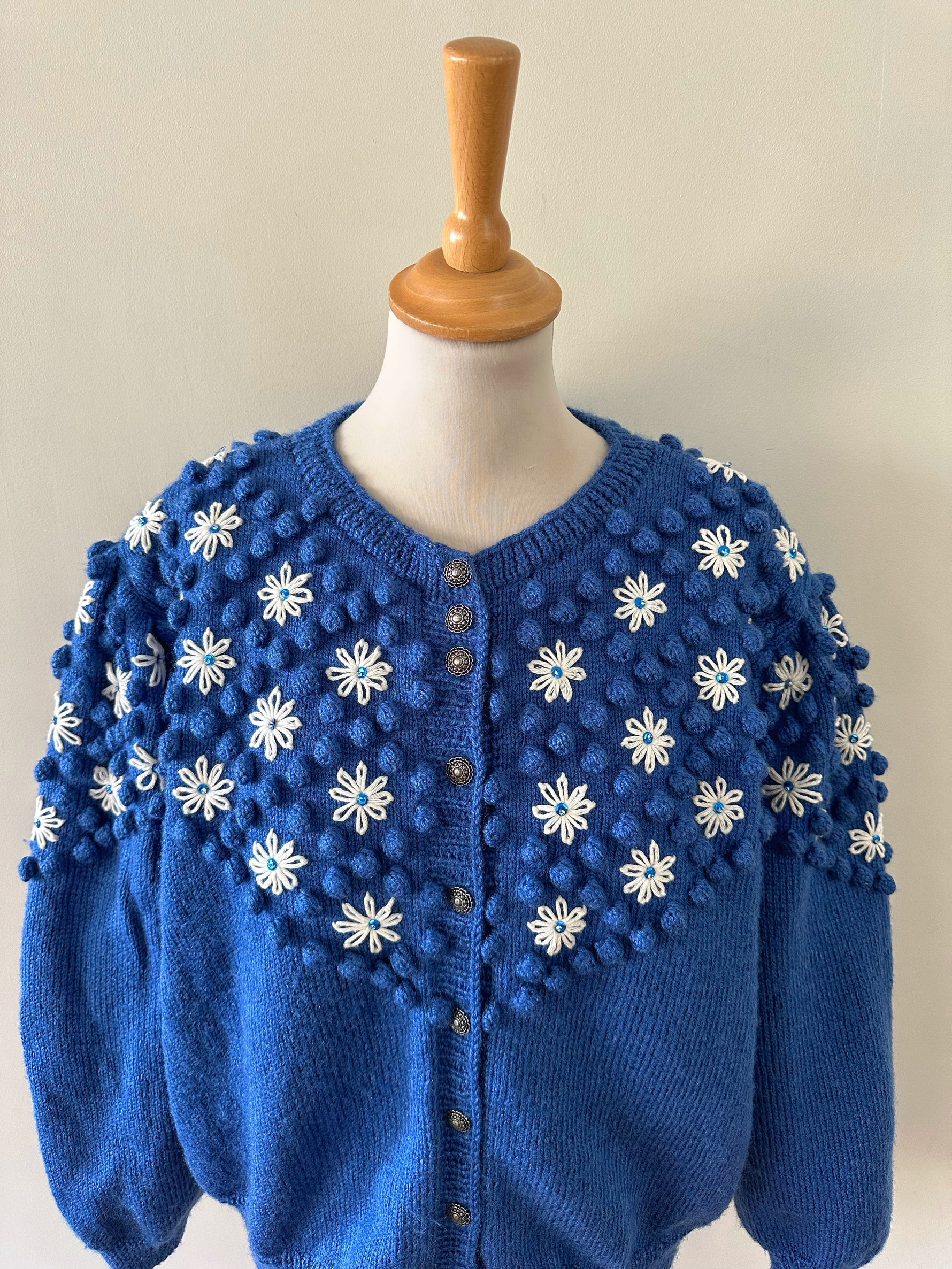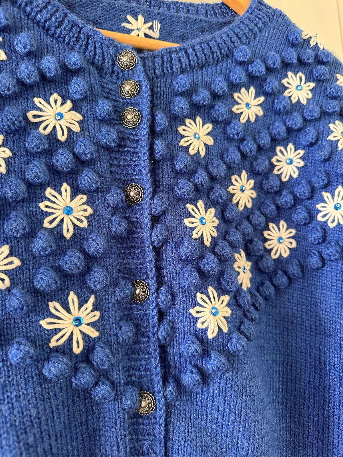 Prix unitaire parCardigan autrichien en pure laine bleu roi, maille popcorn pompons, brodé de fleurs blanches et sequins bleus, manches ballons, boutons bijoux argentés fleuris. Tricoté et brodé main en Autriche. Taille 40 porté ici sur un mannequin T36 et sur une personne T40. Aisselles 52cm, Longueur 60cm.