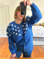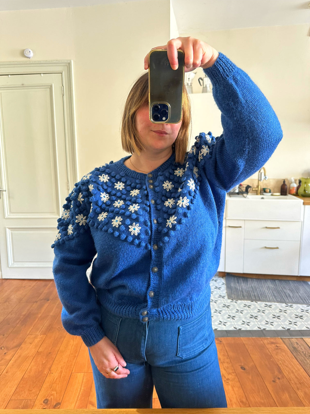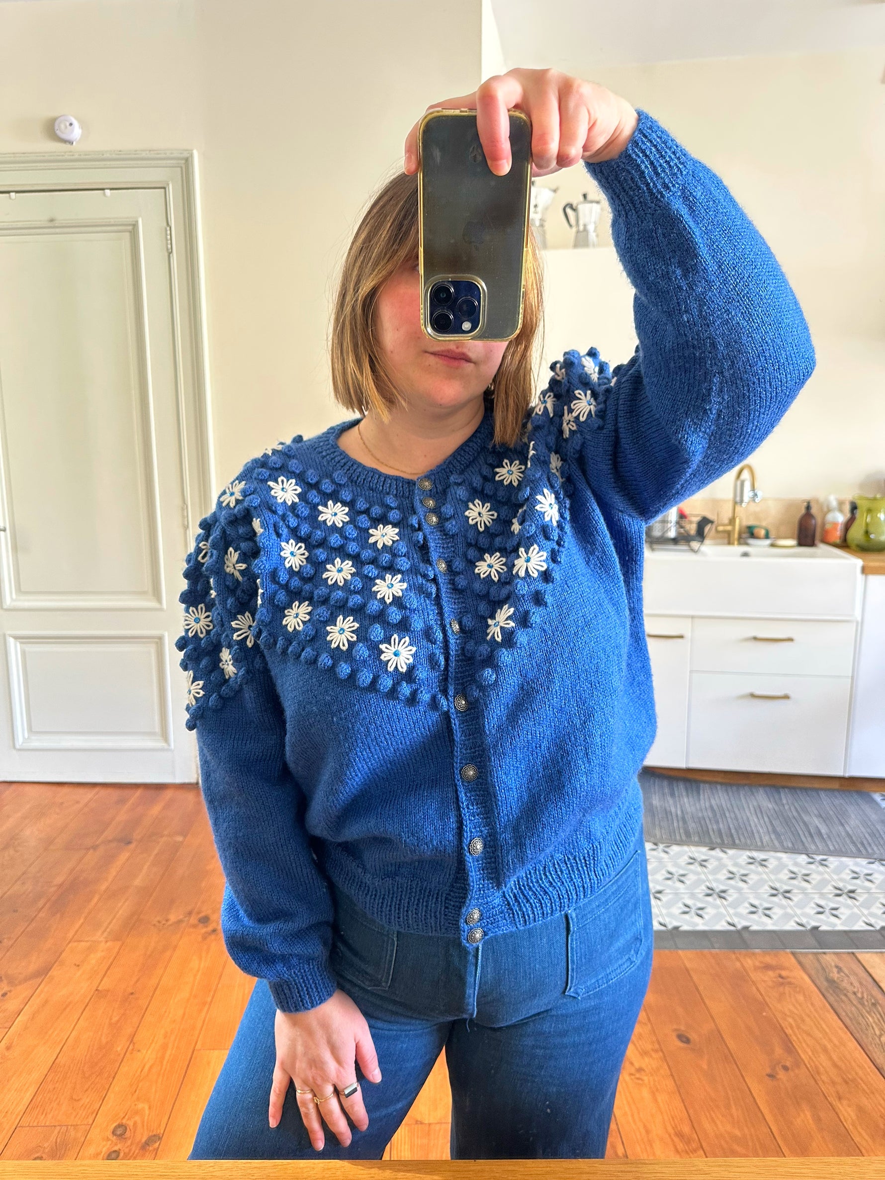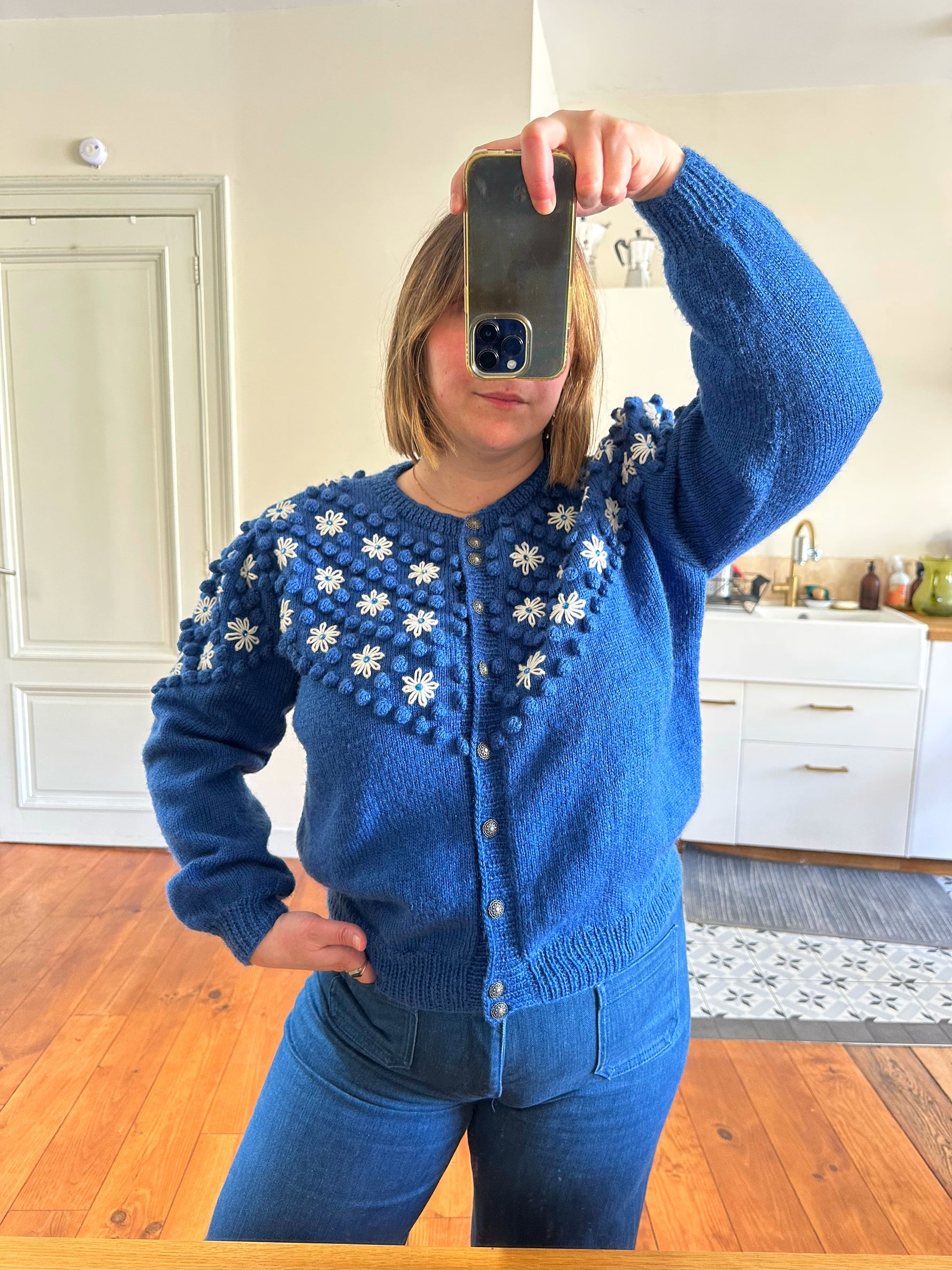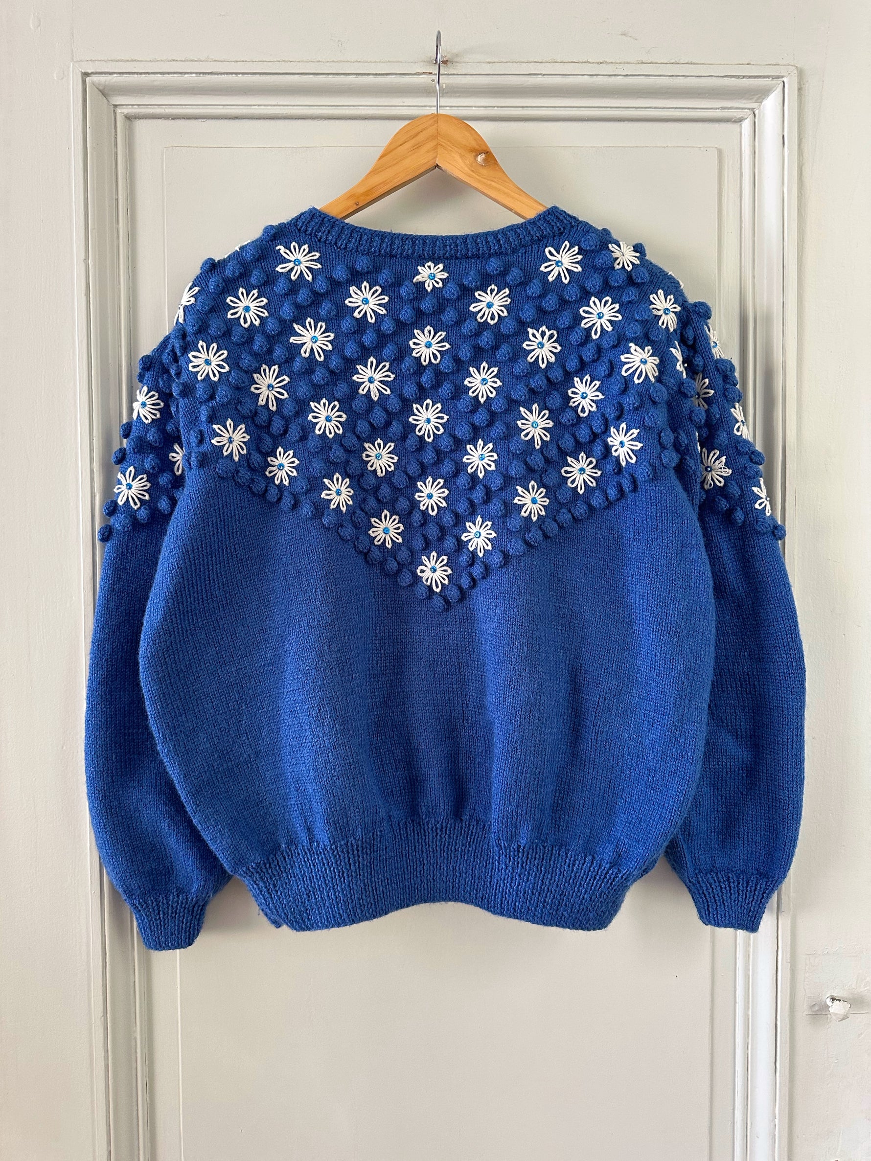 Prix unitaire parCardigan autrichien en pure laine bleu roi, maille popcorn pompons, brodé de fleurs blanches et sequins bleus, manches ballons, boutons bijoux argentés fleuris. Tricoté et brodé main en Autriche. Taille 40 porté ici sur un mannequin T36 et sur une personne T40. Aisselles 52cm, Longueur 60cm.