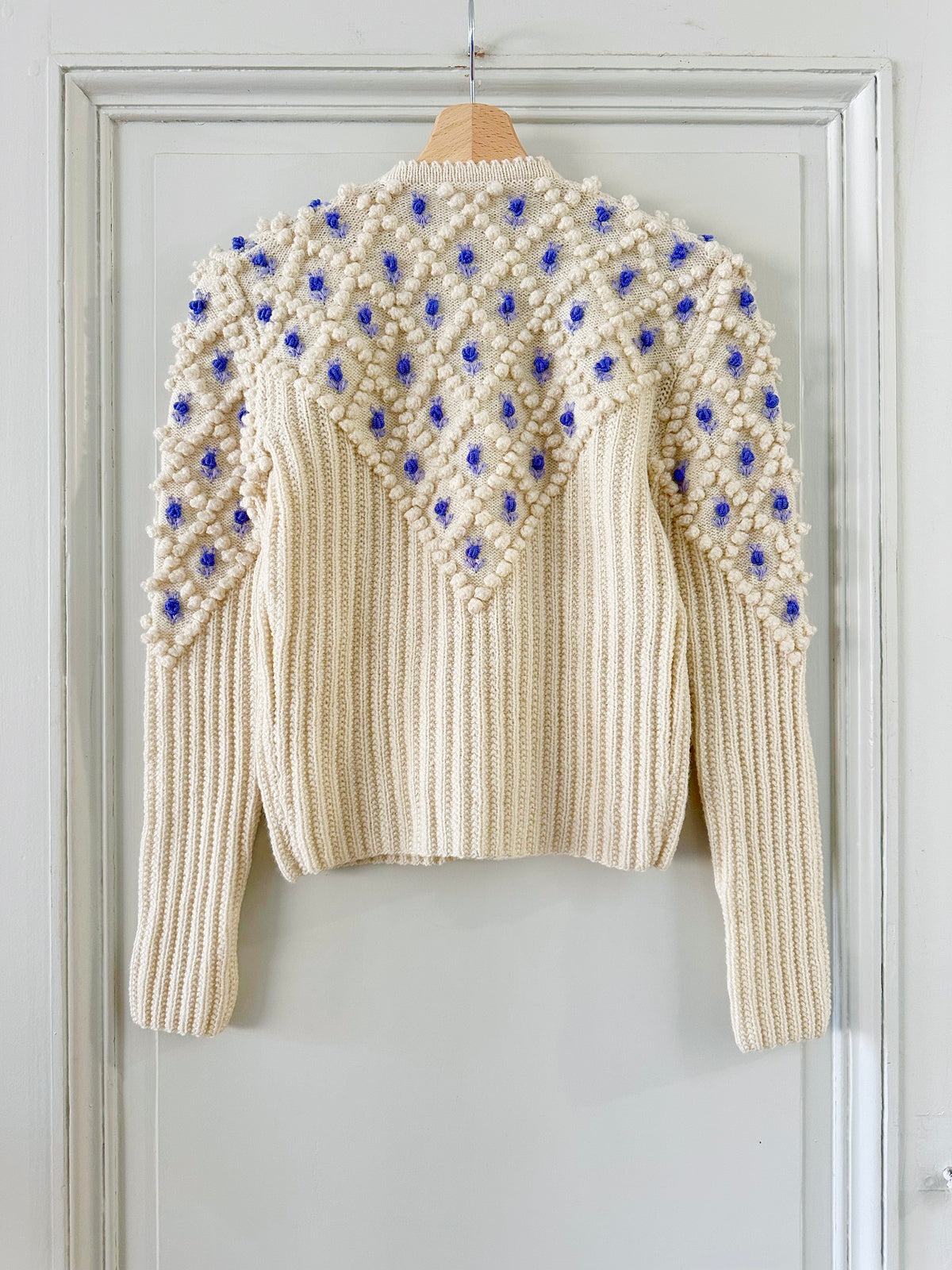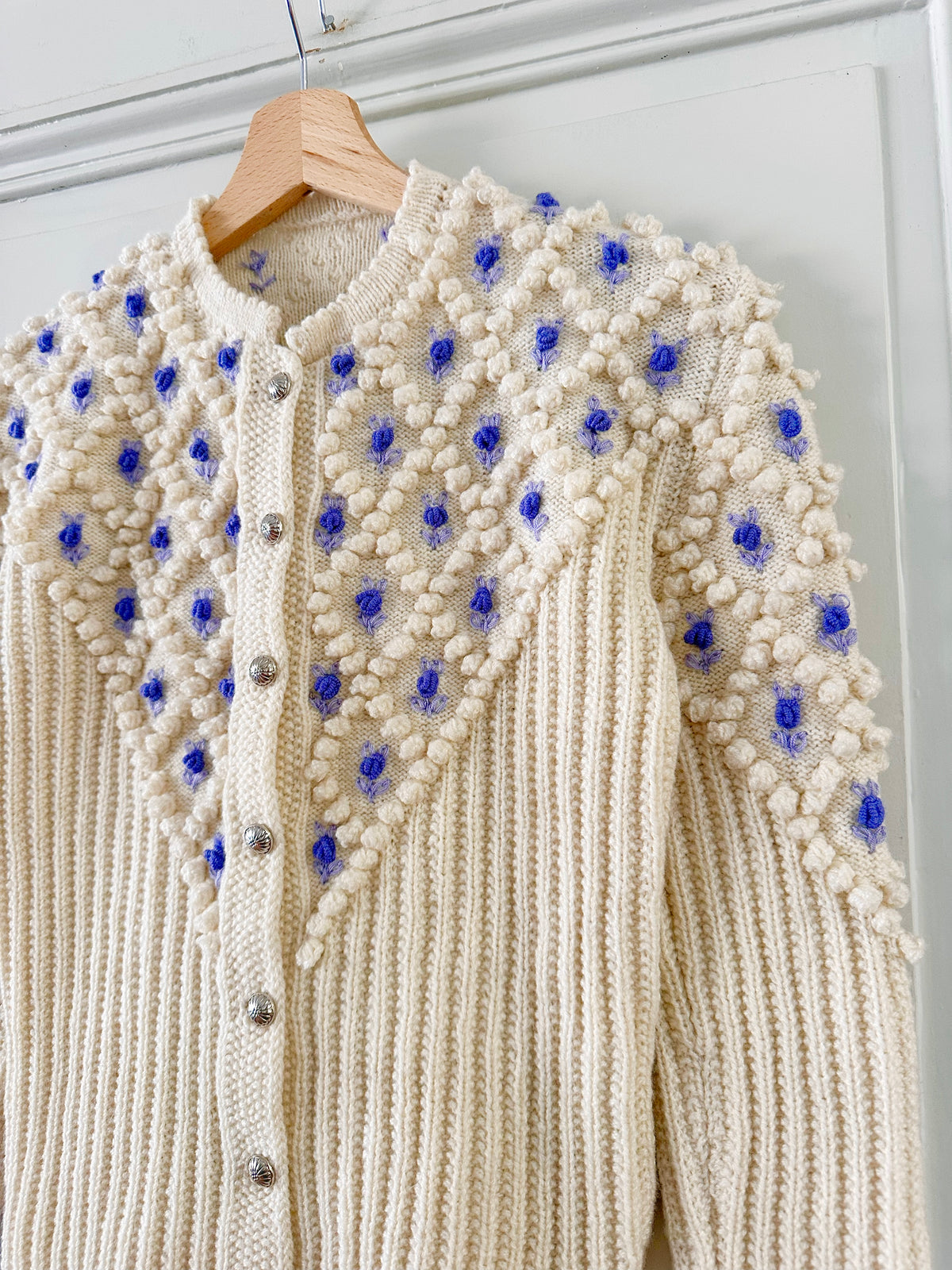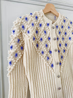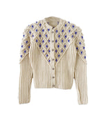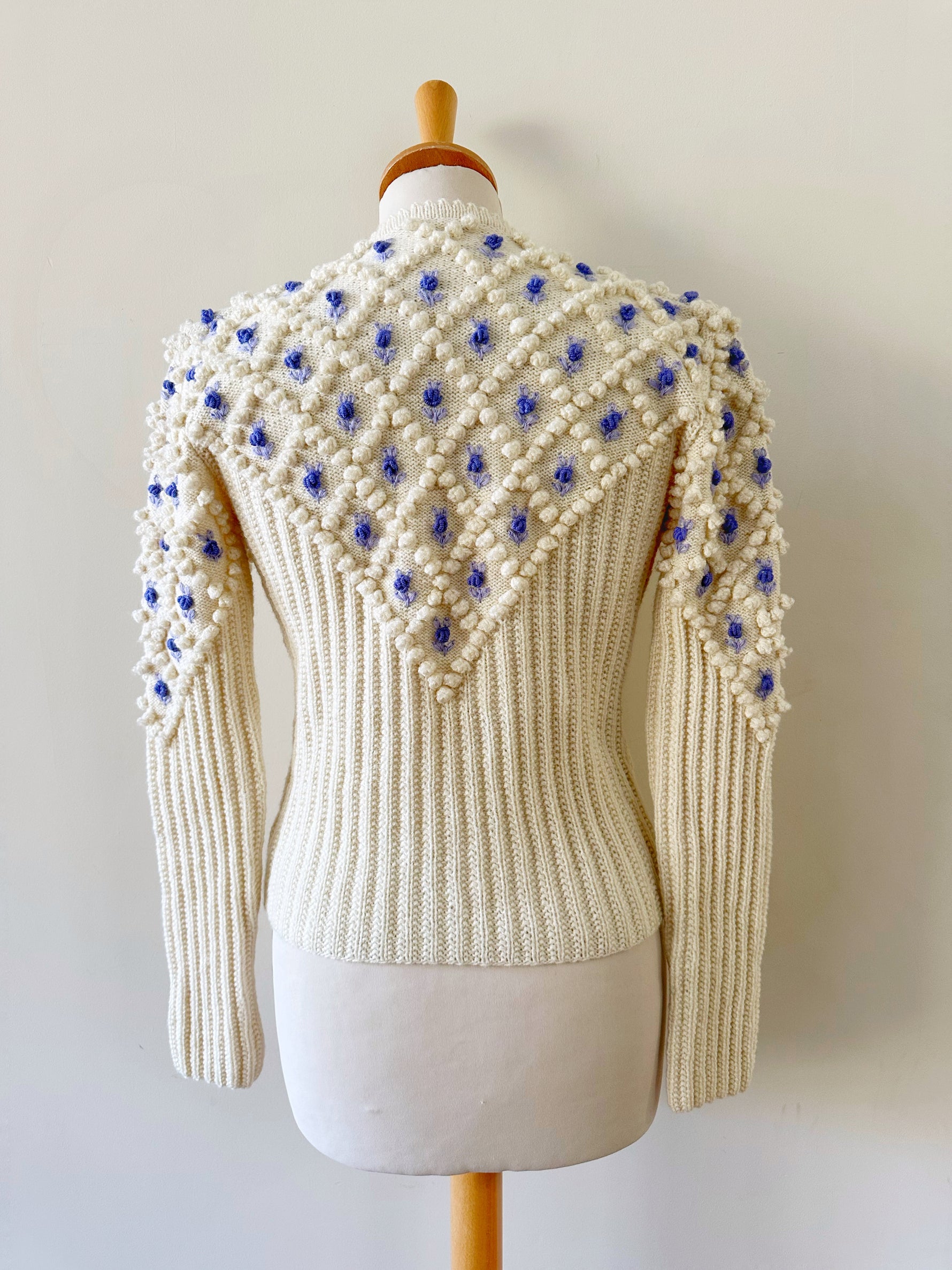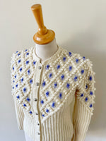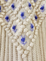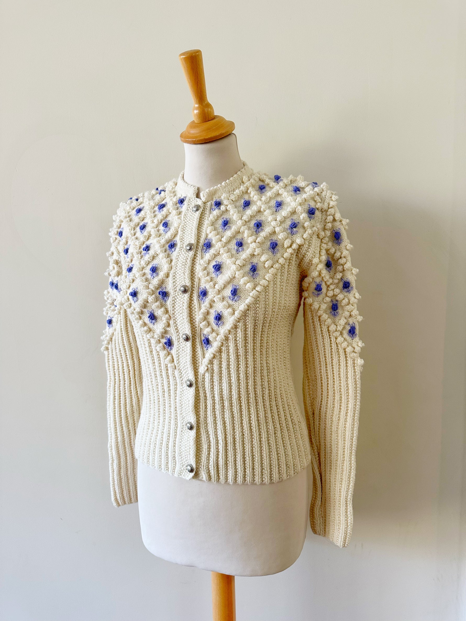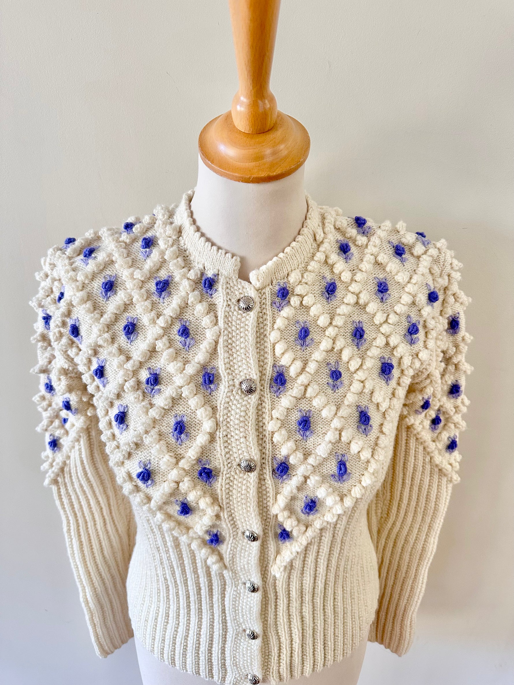 Cardigan Autrichien en laine mélangée écrue, maille popcorn pompons et fleurs brodées lilas et bleu lavande. Manches ballons brodées, boutons bijoux argentés fleuris, convient aux tailles 34 et 36 porté ici sur un mannequin T36. Tricoté mains en Autriche. Aisselles 43cm Longueur 58cm