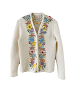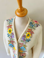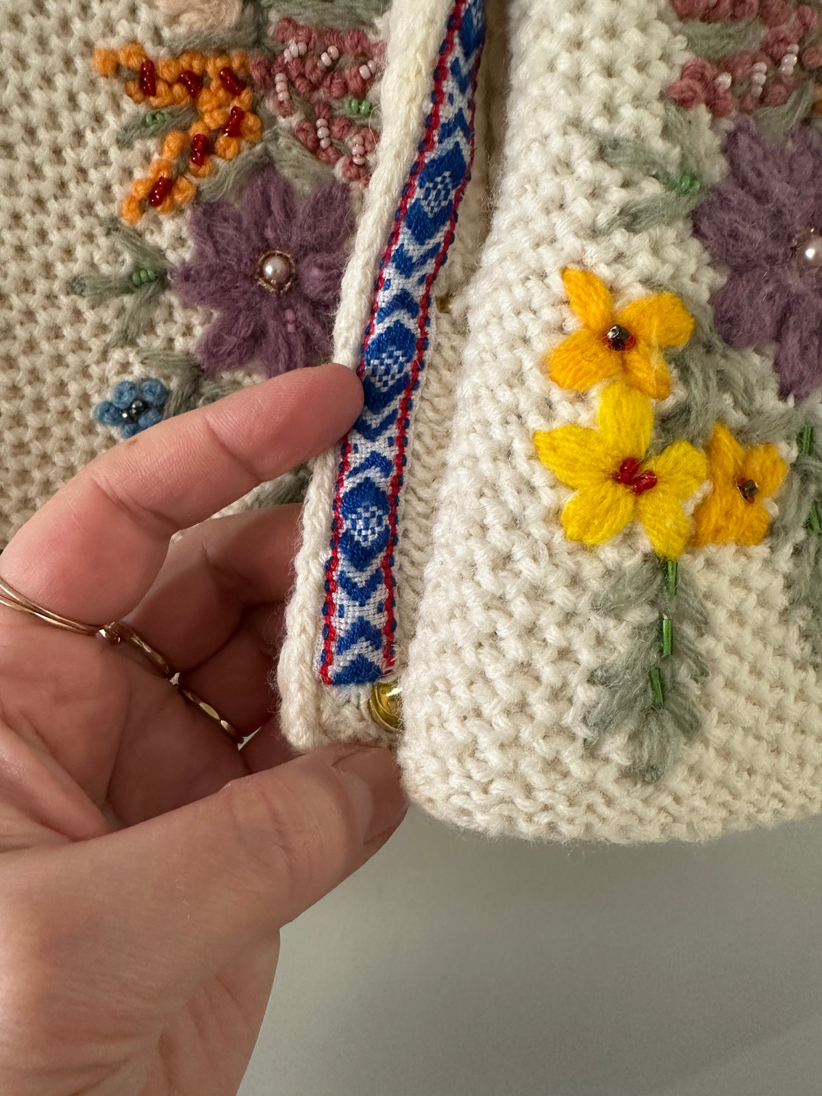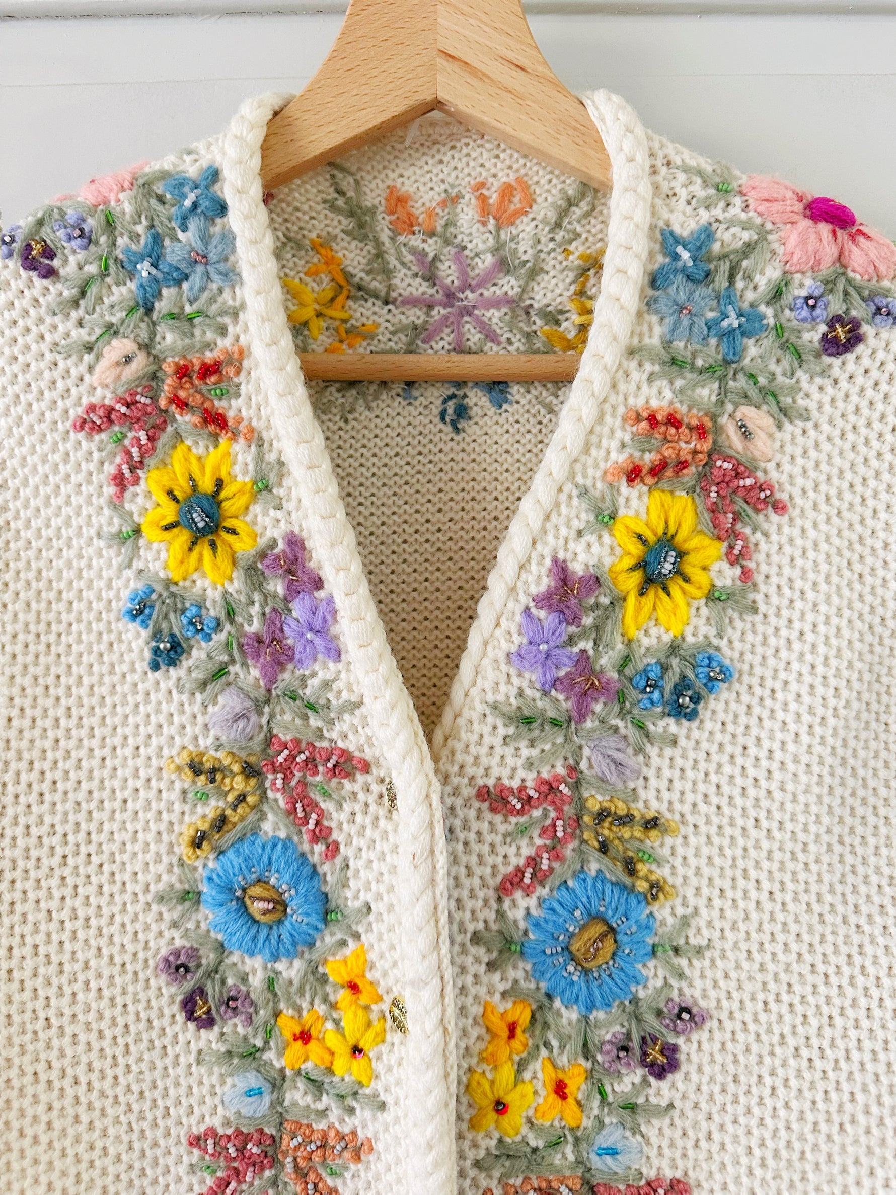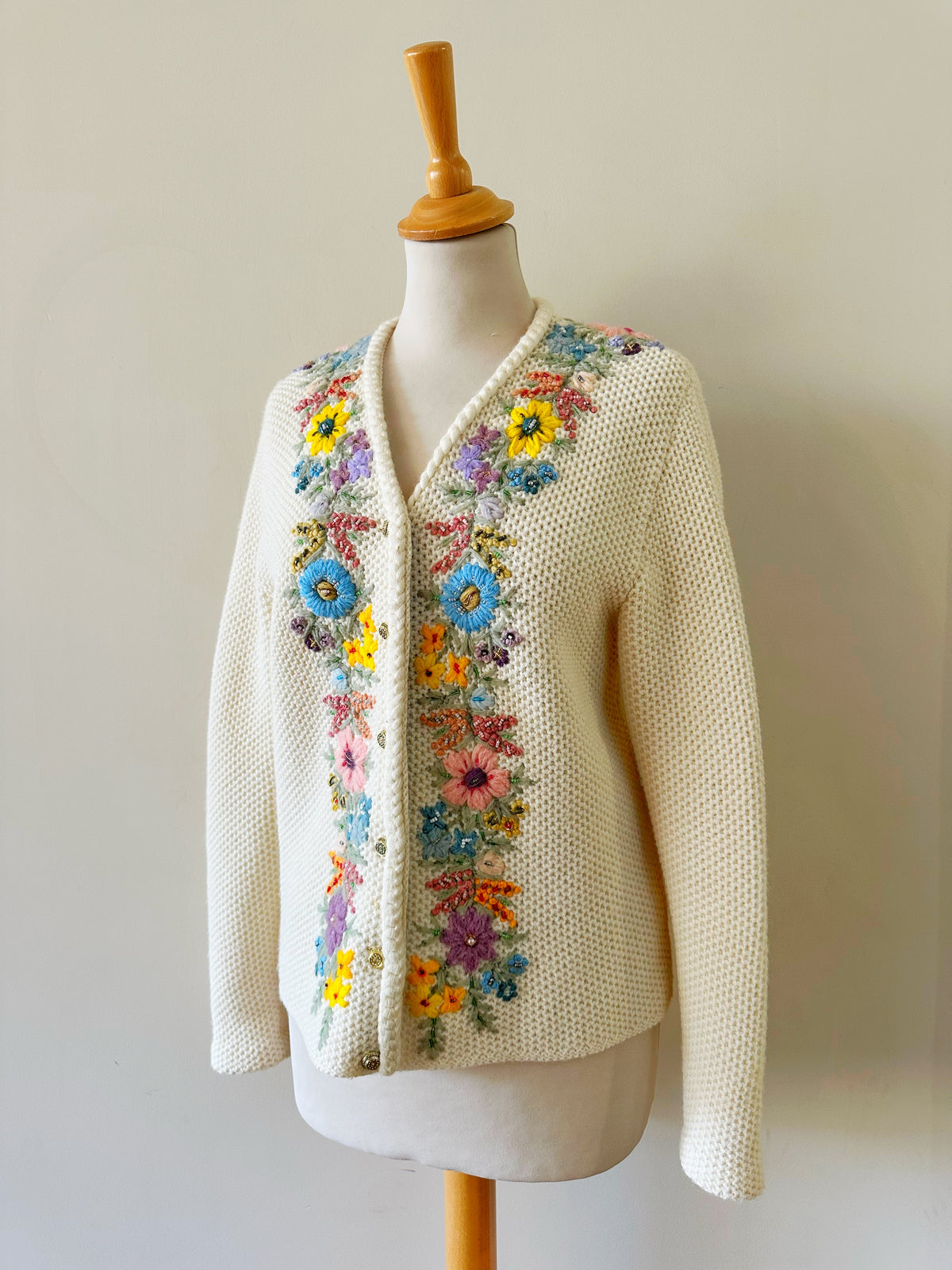 Prix unitaire parCardigan Autrichien en laine écrue, maille tricot nid d'abeille, fleurs et perles brodées multicolores. Boutons bijoux dorés fleuris, finitions tresse et galon fleuri intérieur. Convient aux tailles 36 et 38 porté ici sur un mannequin T36. Tricoté et brodé mains en Autriche. Aisselles 44cm Longueur 60cm