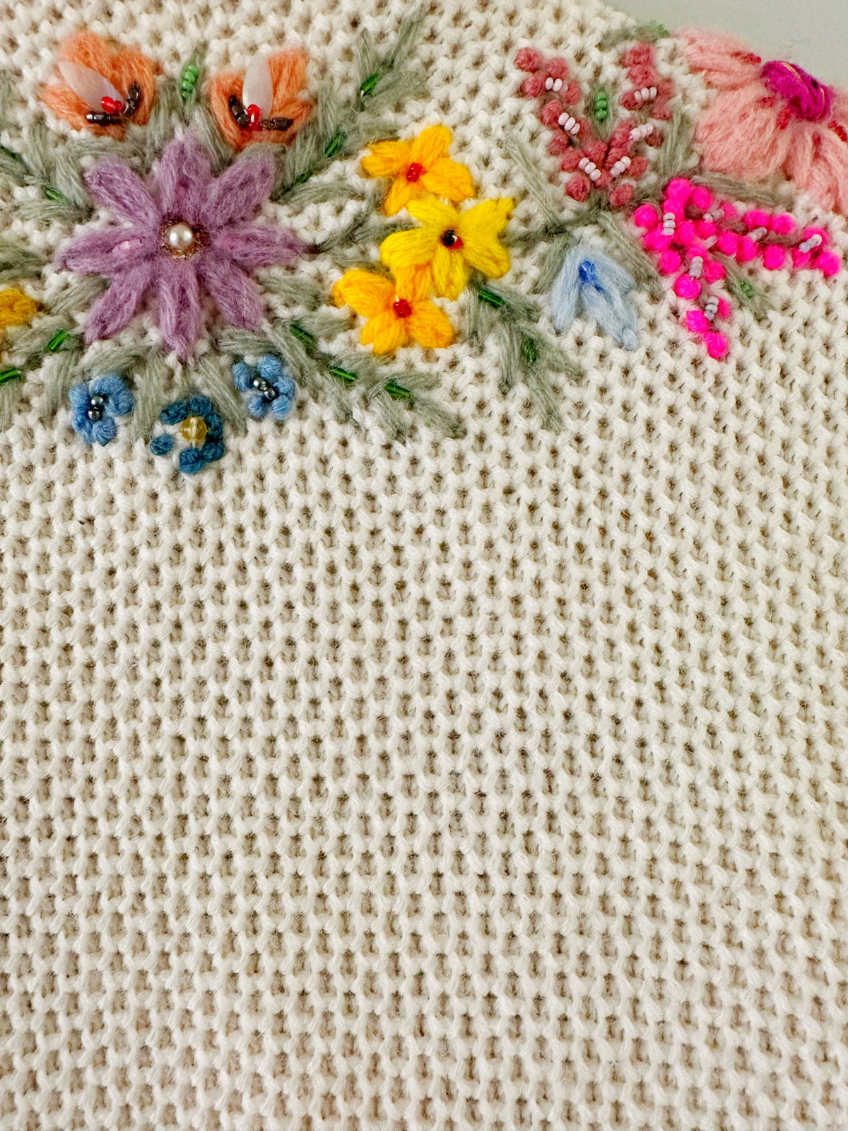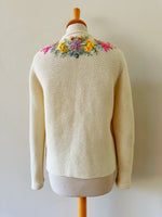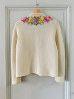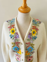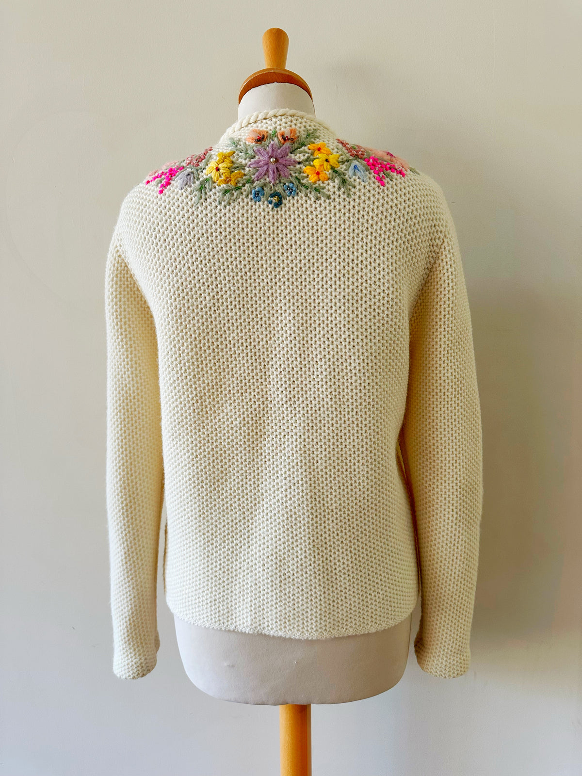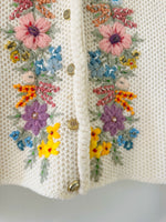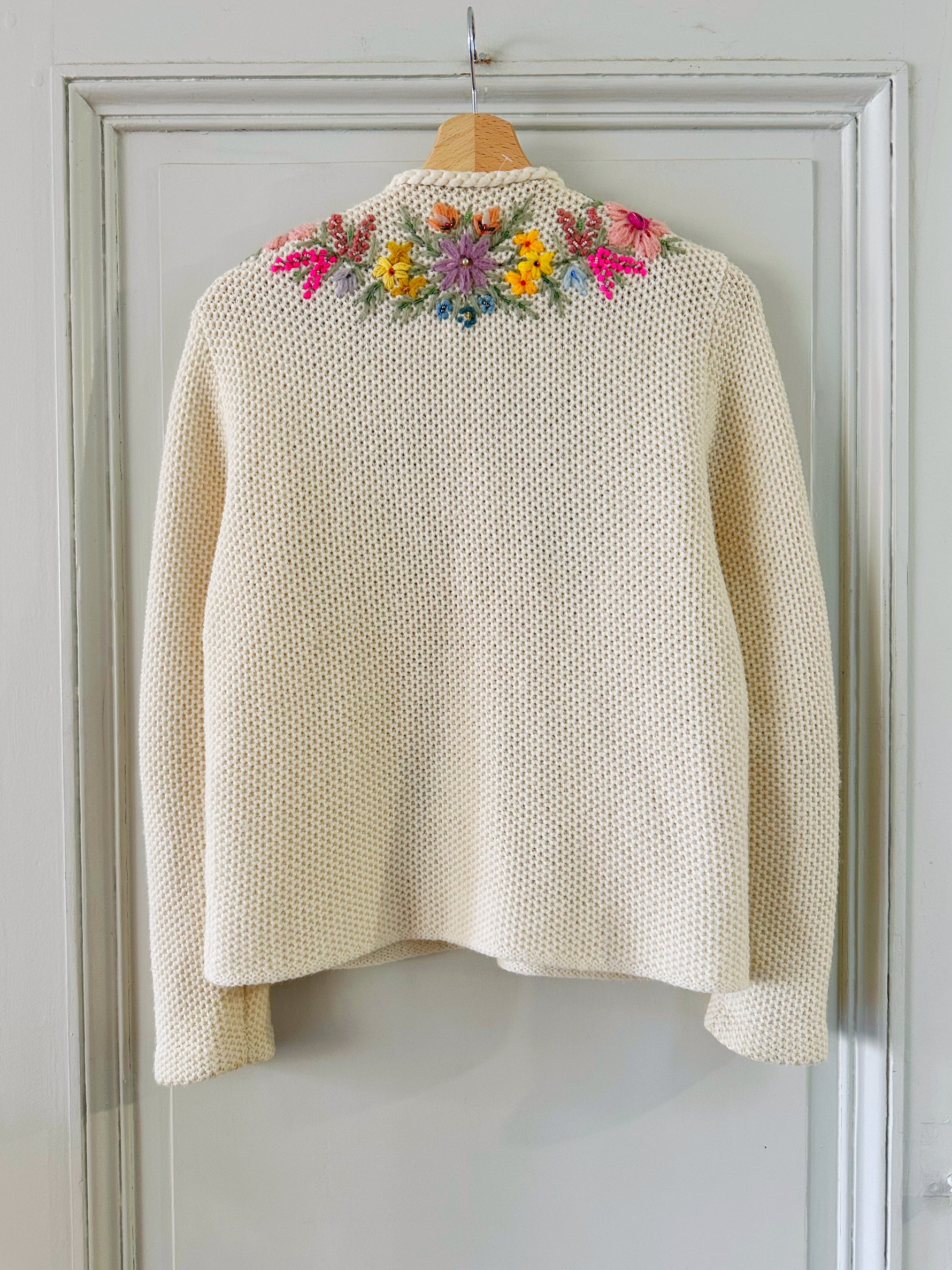 Prix unitaire parCardigan Autrichien en laine écrue, maille tricot nid d'abeille, fleurs et perles brodées multicolores. Boutons bijoux dorés fleuris, finitions tresse et galon fleuri intérieur. Convient aux tailles 36 et 38 porté ici sur un mannequin T36. Tricoté et brodé mains en Autriche. Aisselles 44cm Longueur 60cm